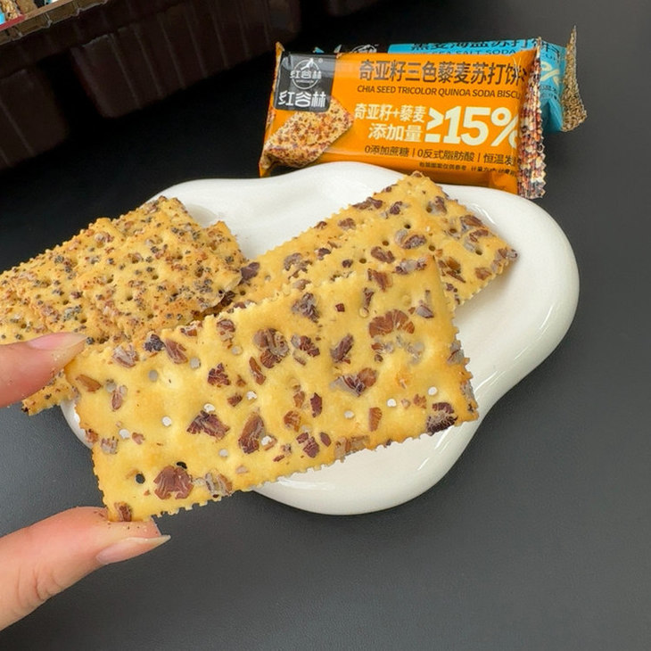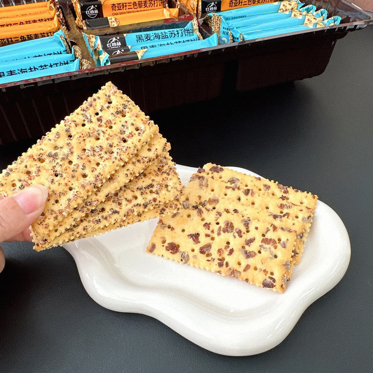 【温馨提示】(关于产品特性需要注意的问题和使用注意事项等)黑麦海盐苏打饼干,属于易碎产品,已经在包装上做了多次防撞措施,收到可能会有小碎情况,还请见谅。黑麦脆是机器按照比例撒哒,每块饼干上的黑麦脆不是很均匀,不是售后标准,还请见谅。