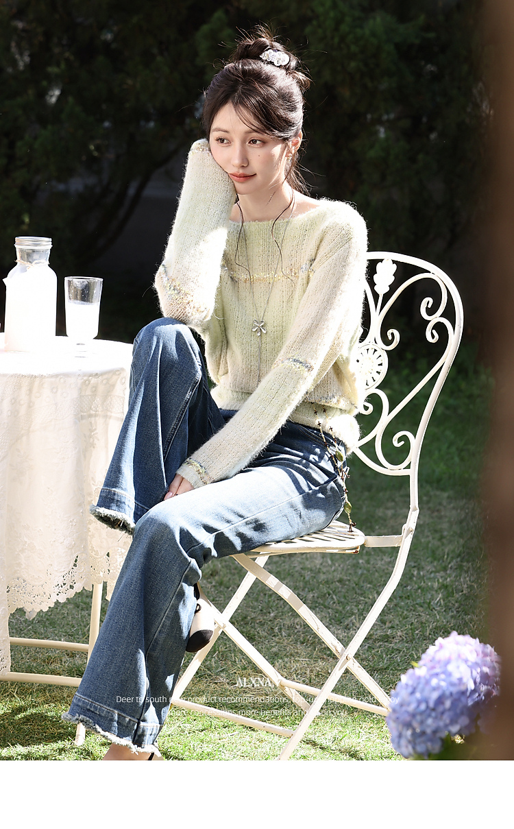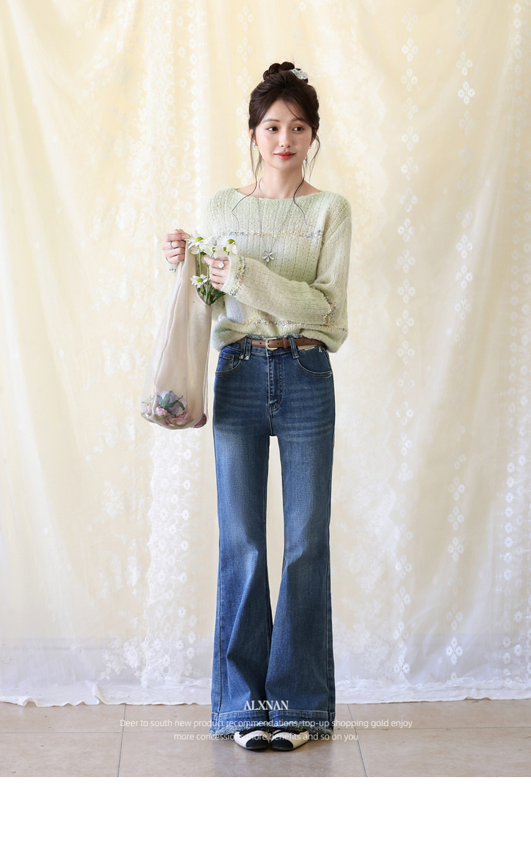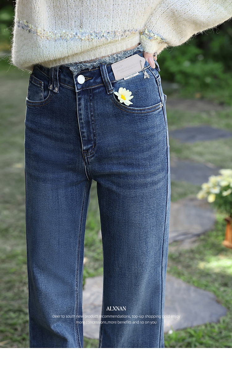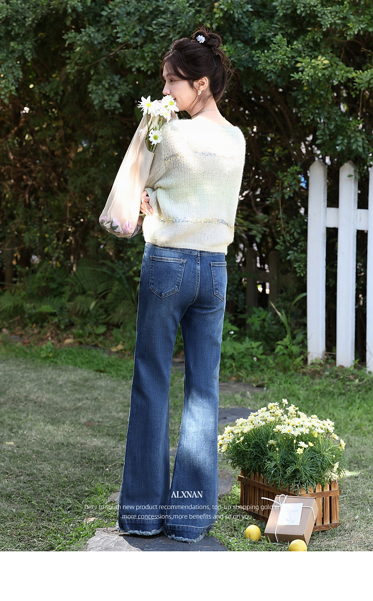 鹿向南「蓝调慵风」复古深蓝色微喇毛边牛仔裤女春季显瘦气质长裤