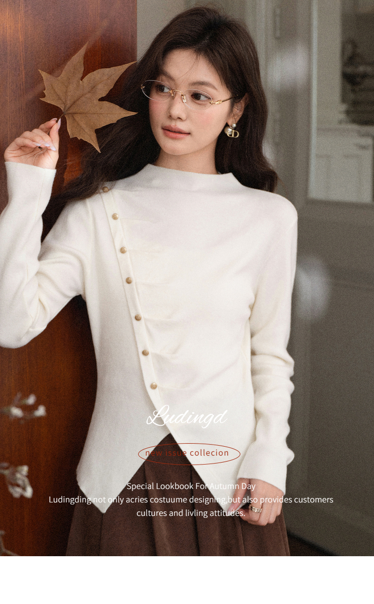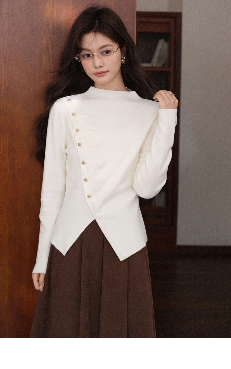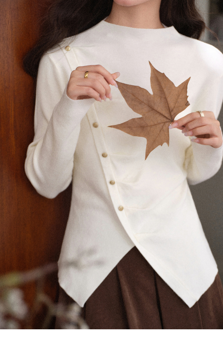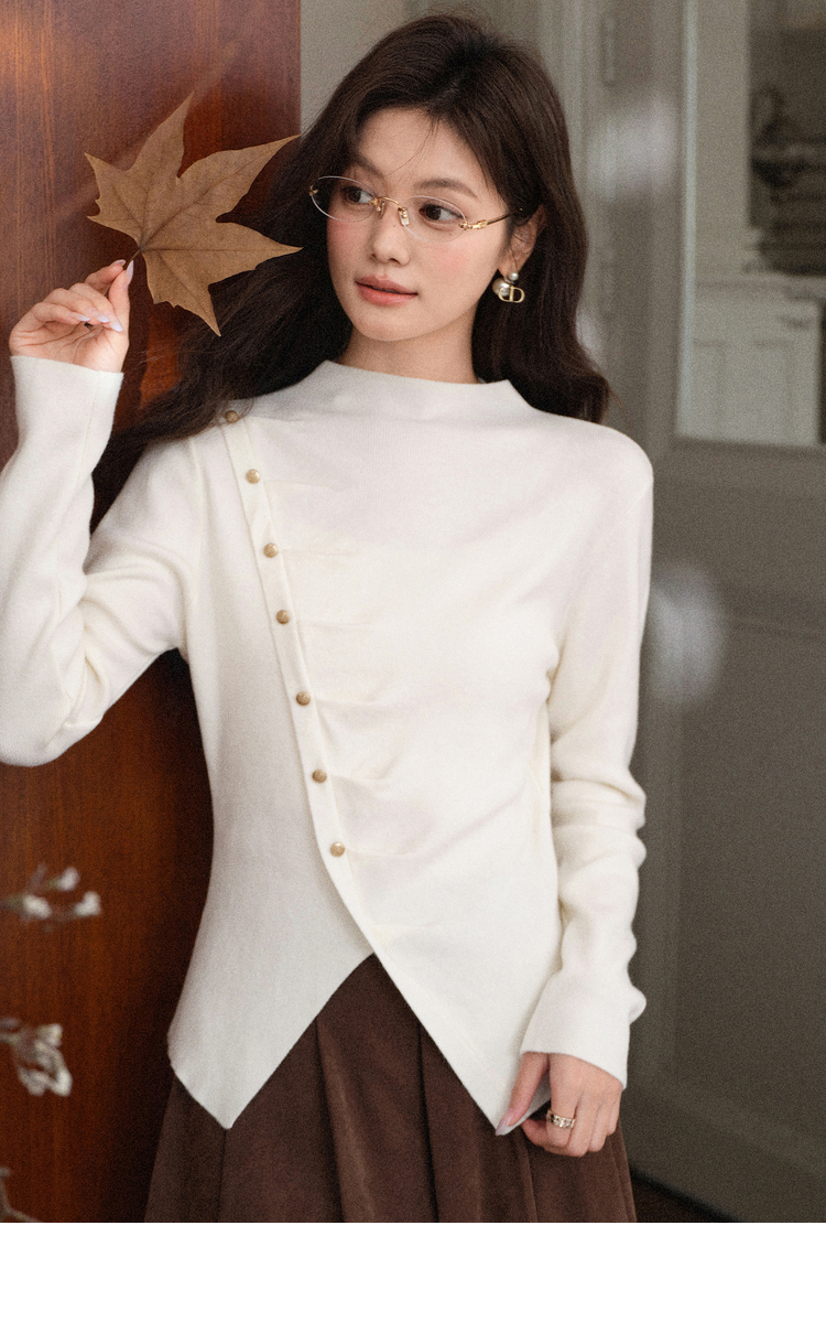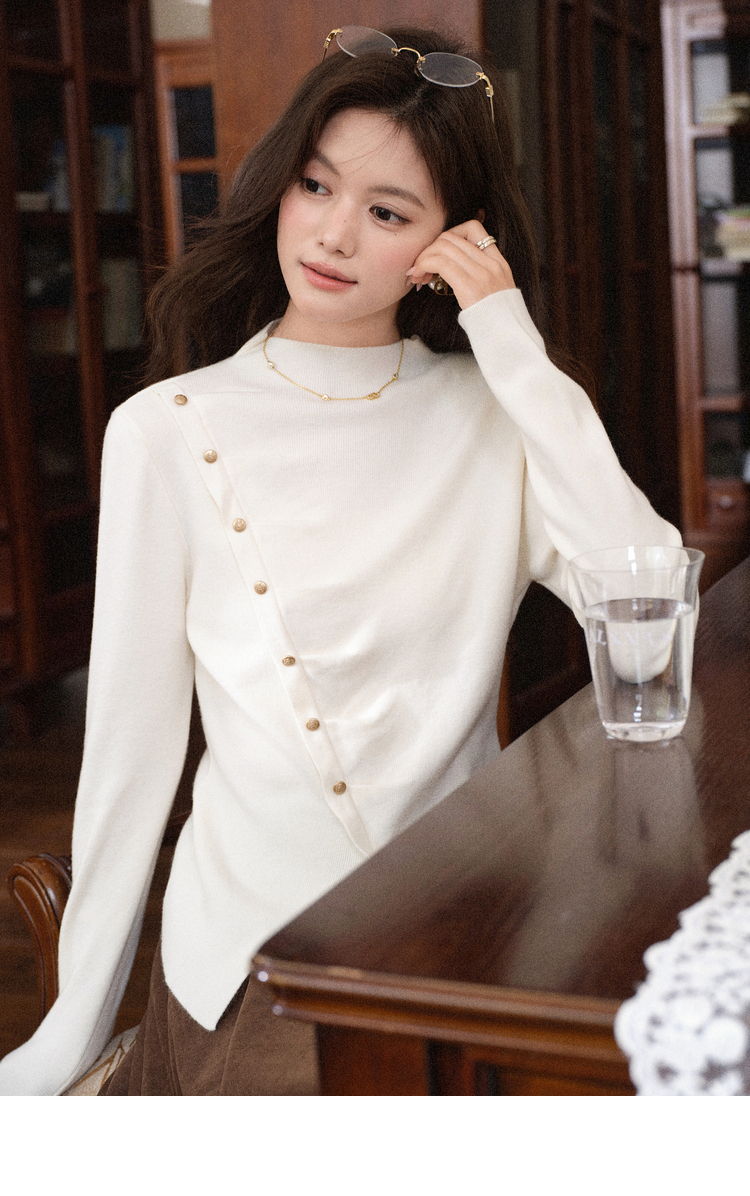 鹿向南「温婉针织」白色不对称斜扣针织衫秋冬新款修身长袖上衣女L58910