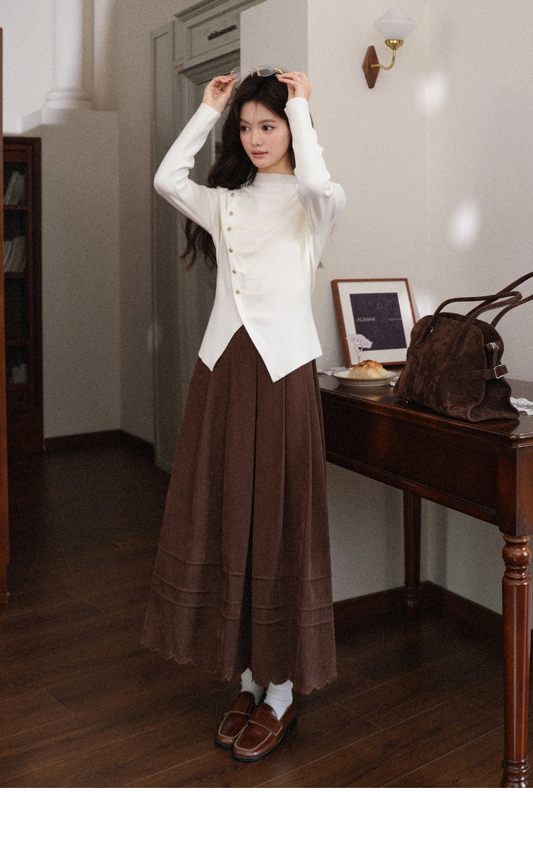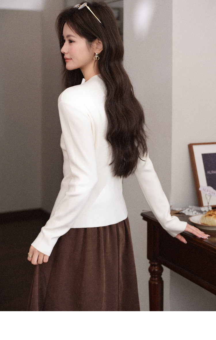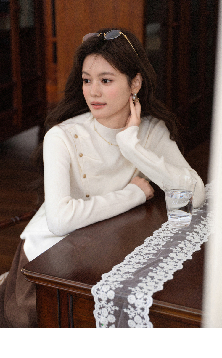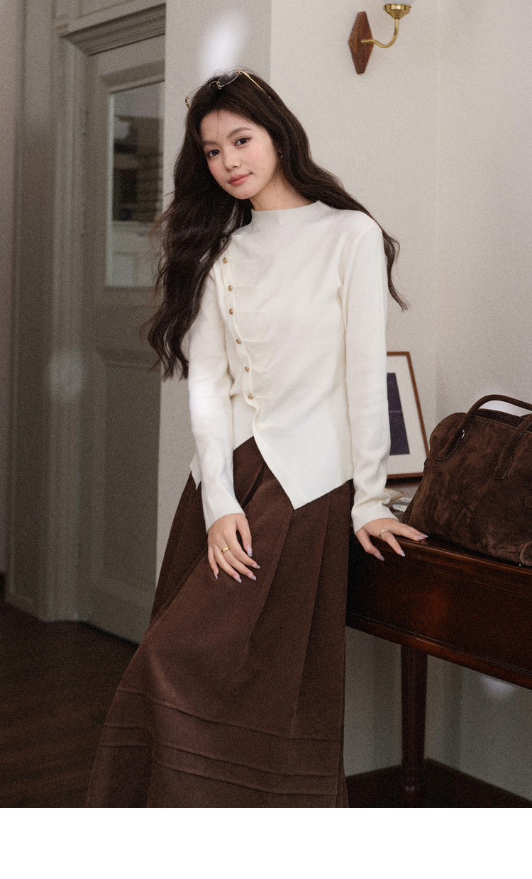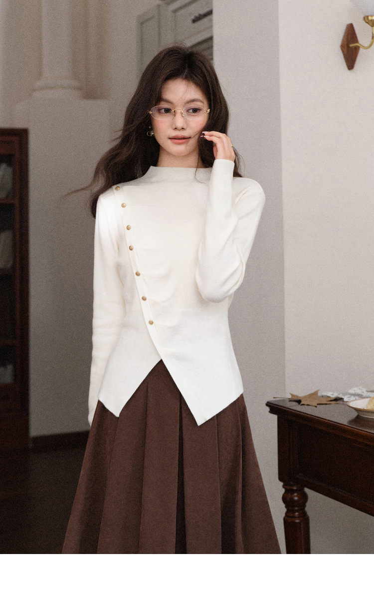 鹿向南「温婉针织」白色不对称斜扣针织衫秋冬新款修身长袖上衣女L58910