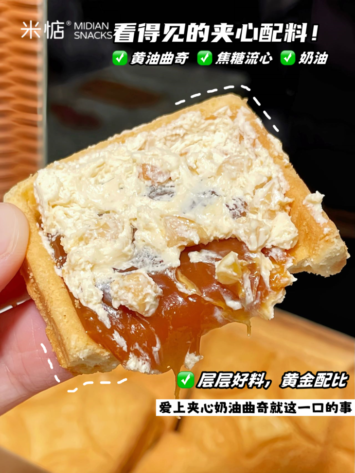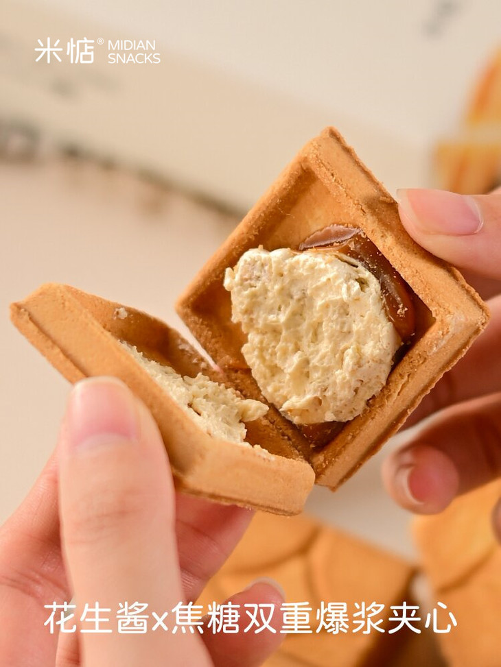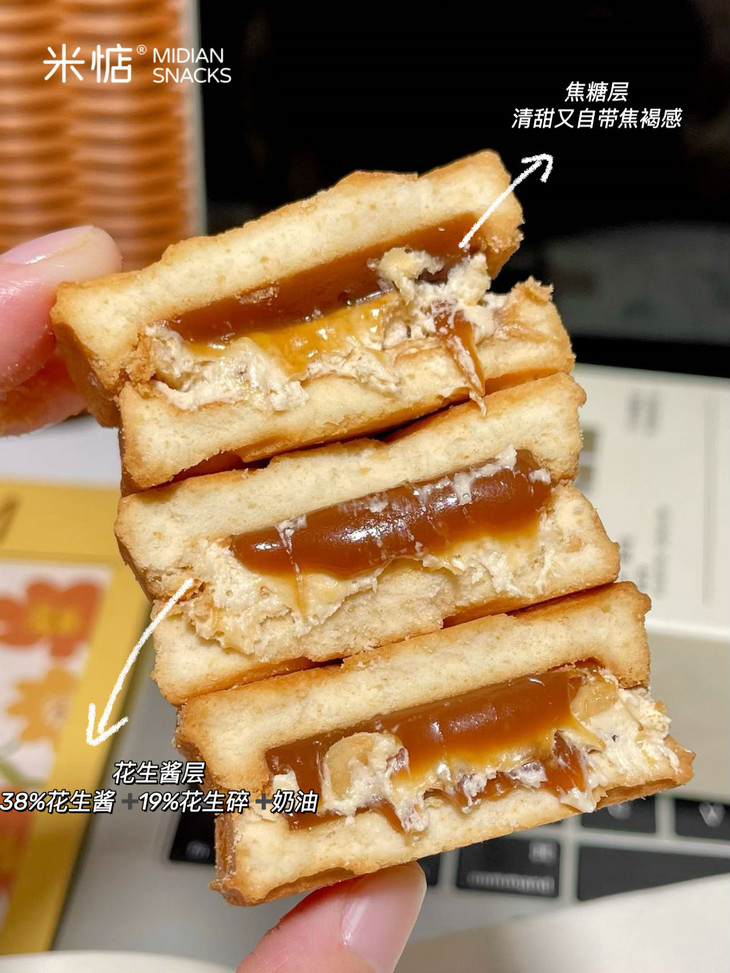 ⭐️历时88天研发调配,独家黄金比例 花生酱+焦糖酱双重爆浆夹心 *🥜花生酱层* 添加≥38%的花生酱夹心+19%的花生碎颗粒💕 花生酱的浓郁占比,让每一口都感受到满足 花生碎的巧妙加入,更添一份咀嚼的快乐 *🍯焦糖层* 细腻丝滑的质地,清甜焦香的口感💕 焦糖的丝滑与花生酱的绵密交织 形成一种独特的“甜中带咸”的层次口感