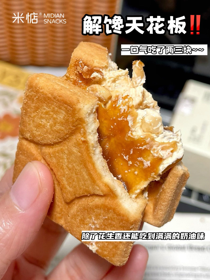 “咔嚓”一声像是打开潘多拉魔盒🎁 花生酱夹杂花生碎再融合焦糖酱 三重体验在味蕾交织缠绕 微甜中夹杂着一丝轻咸❄️ 浓郁的奶香味加持使得口感回味 料足还新鲜,缺点是保质期只有45天 但是根本不用担心❗ 因为根本不够吃 😋