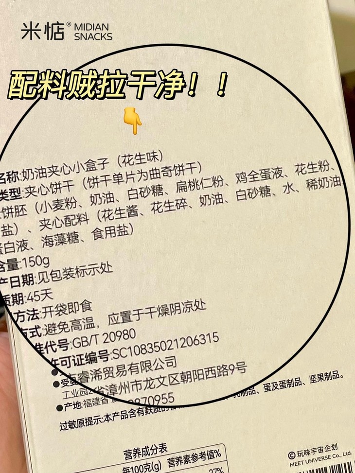 【温馨提醒】 夹心是新鲜奶油和焦糖制作,赏味期45天,大家要尽早食用哦。 【产品名称】:米惦奶油夹心小盒子(花生味) 【产品规格】:150g盒 【保质期】:45天 【花生味配料表】:饼胚(小麦粉、奶油、白砂糖、扁桃仁粉、鸡全蛋液、花生粉、乳粉、食用盐)夹心配料(花生酱、花生碎、奶油、白砂糖、水、稀奶油、鸡蛋白液、海藻糖、食用盐) 【储存方式】:避免高温,应置于干燥阴凉处 【发货地】:福建漳州 【发货时效】:72小时内发出 【发货快递】:中通、申通随机发不指定 【2盒补运费地区】:北京,上海加一元,甘肃、内蒙古、宁夏运费加14元/件,青海、新疆、西藏运费加16元/件。 【3盒补运费地区】:北京,上海➕一元,甘肃、内蒙古、宁夏、青海运费每件➕18元/件,新疆、西藏运费每件➕25元/件。 【过敏原信息】:含有麸质的谷物制品,乳制品、花生、蛋及蛋制品。 【售后说明】: 1、食品无质量问题不支持 7 天无理由退换。 2、产品少发、漏发,质量问题,请提供产品连同快递单(需看见单号)一起拍照24 小时内发给客服核实处理。 3、如包裹破损、挤压严重请拍照签收,签单破损签收,请在签收48小时内拍照联系客服处理。 4、产品已经发出的情况下,不建议更改地址、不退货,下单前,请仔细核对信息!货物产生物流单号,无法拦截,如需改地址、拦截须支付快递费用。 5、订单产生单号后,拦截需收费4元,改地址3元,偏远六省(新疆、西藏、内蒙古、宁夏、青海、甘肃)按实际产生运费收取
