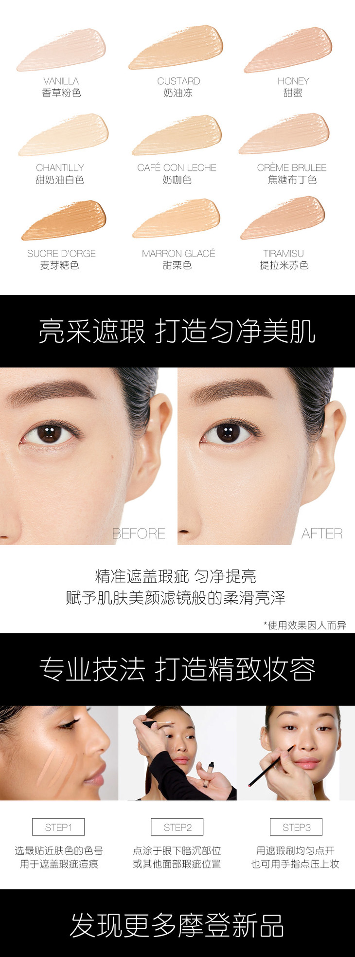 可用扫头直接上妆,然后以指尖或12号霜状遮瑕扫推开。用作提亮肤色时,选择两款比遮瑕霜更浅的色调,然后涂于脸部突出的地方。要增加立体感并突显轮廓,可选择两款比遮瑕霜更深的色调,涂抹于颧骨下方、太阳穴、发际线和下颚。