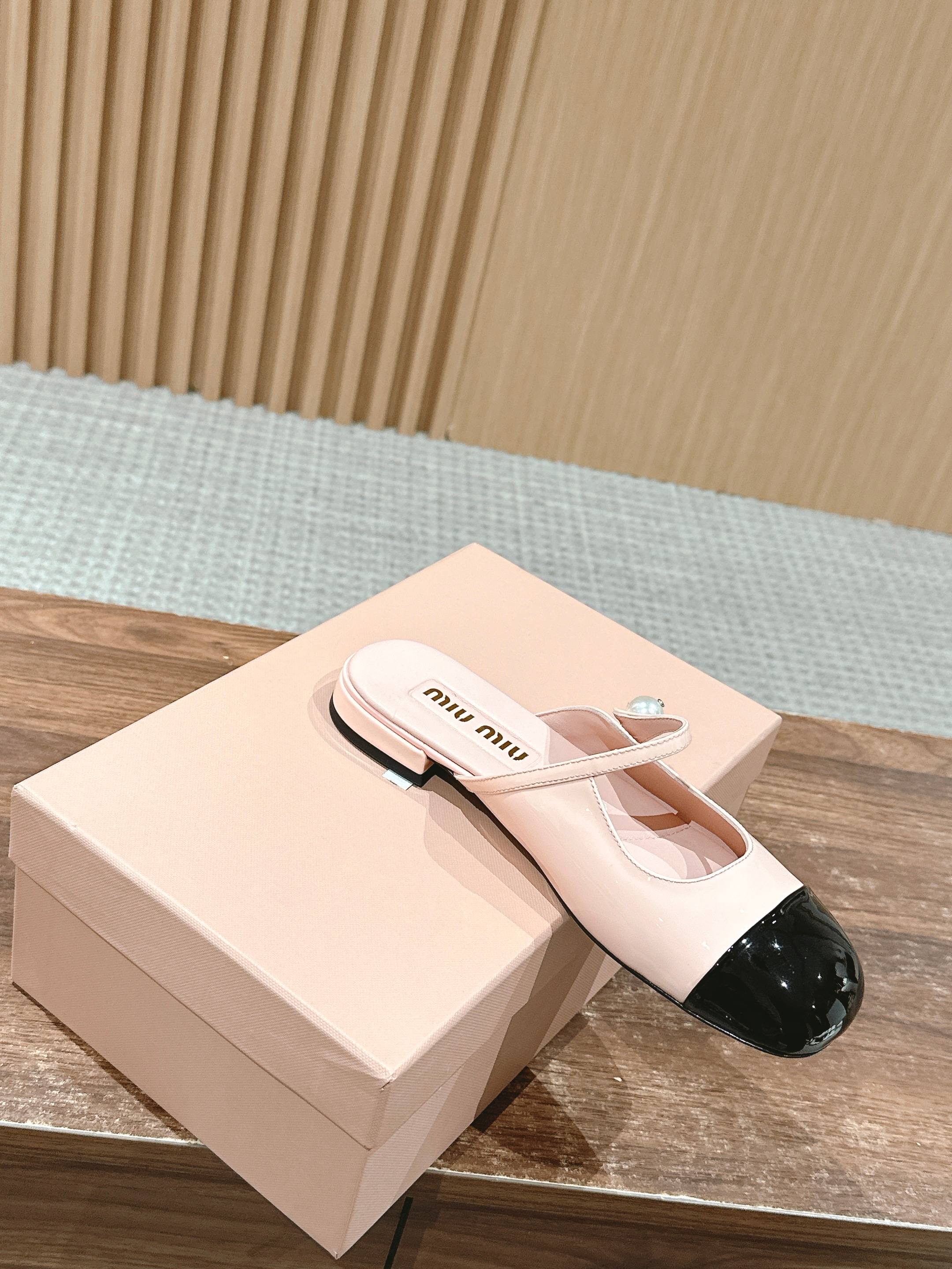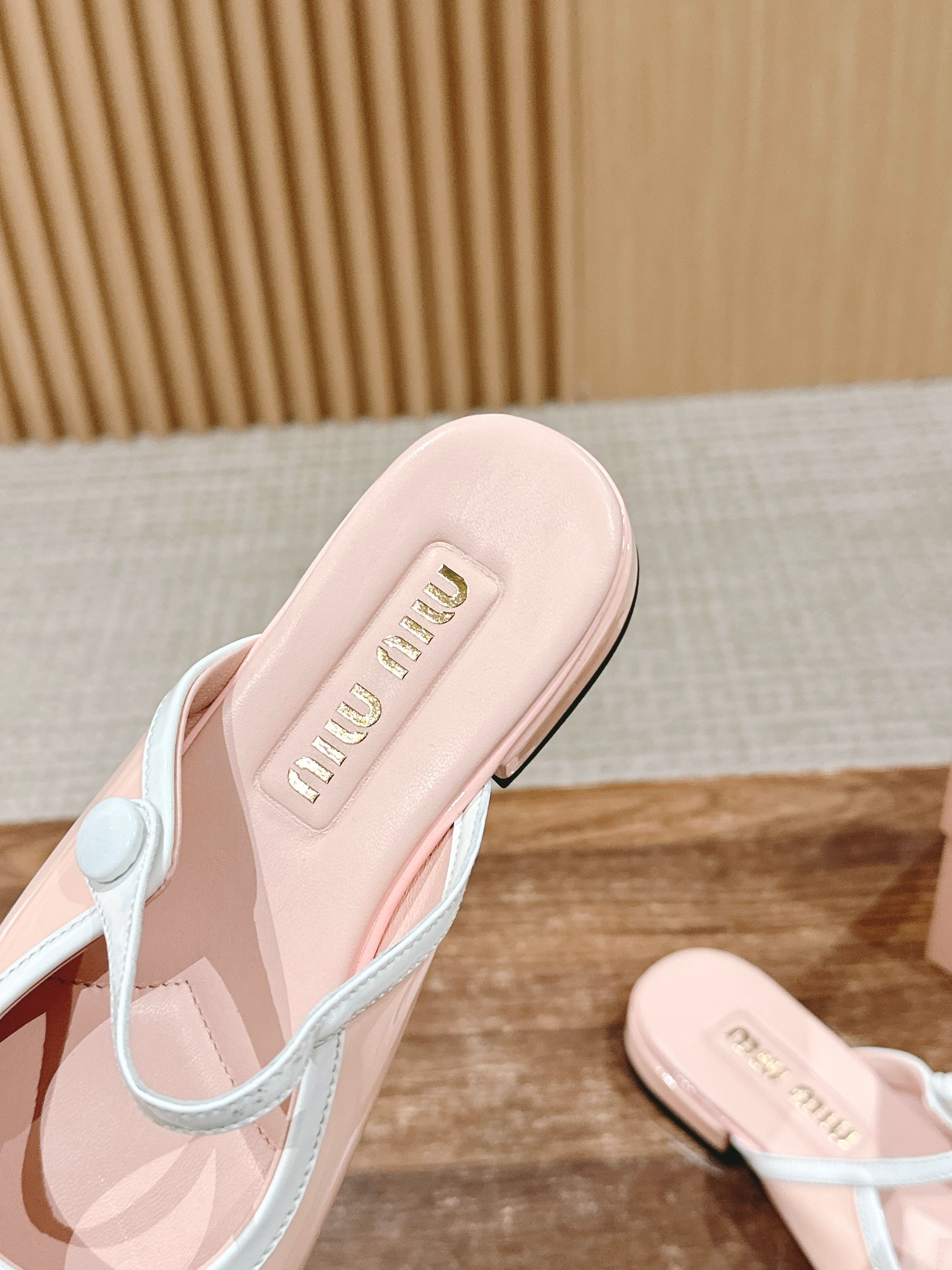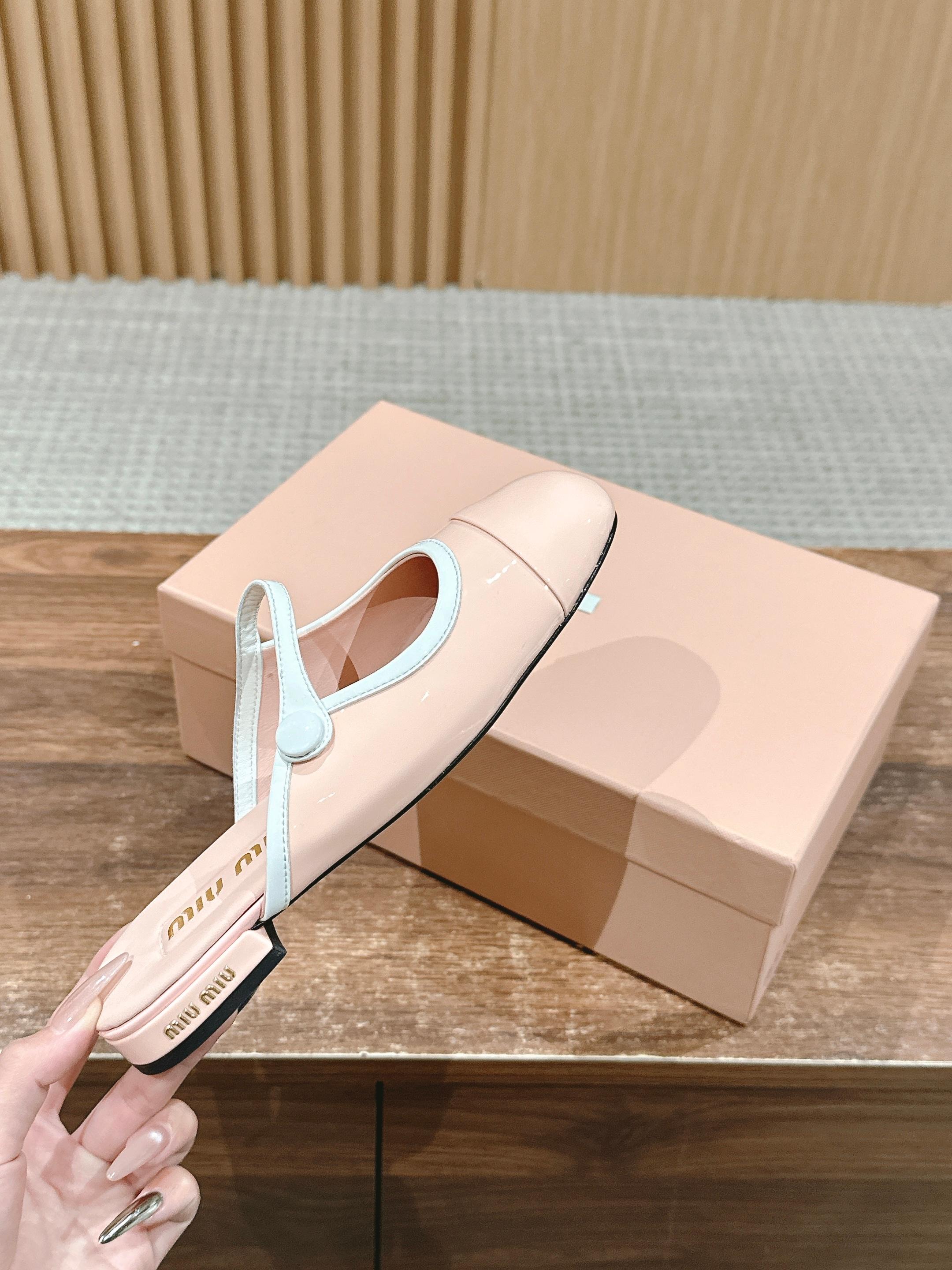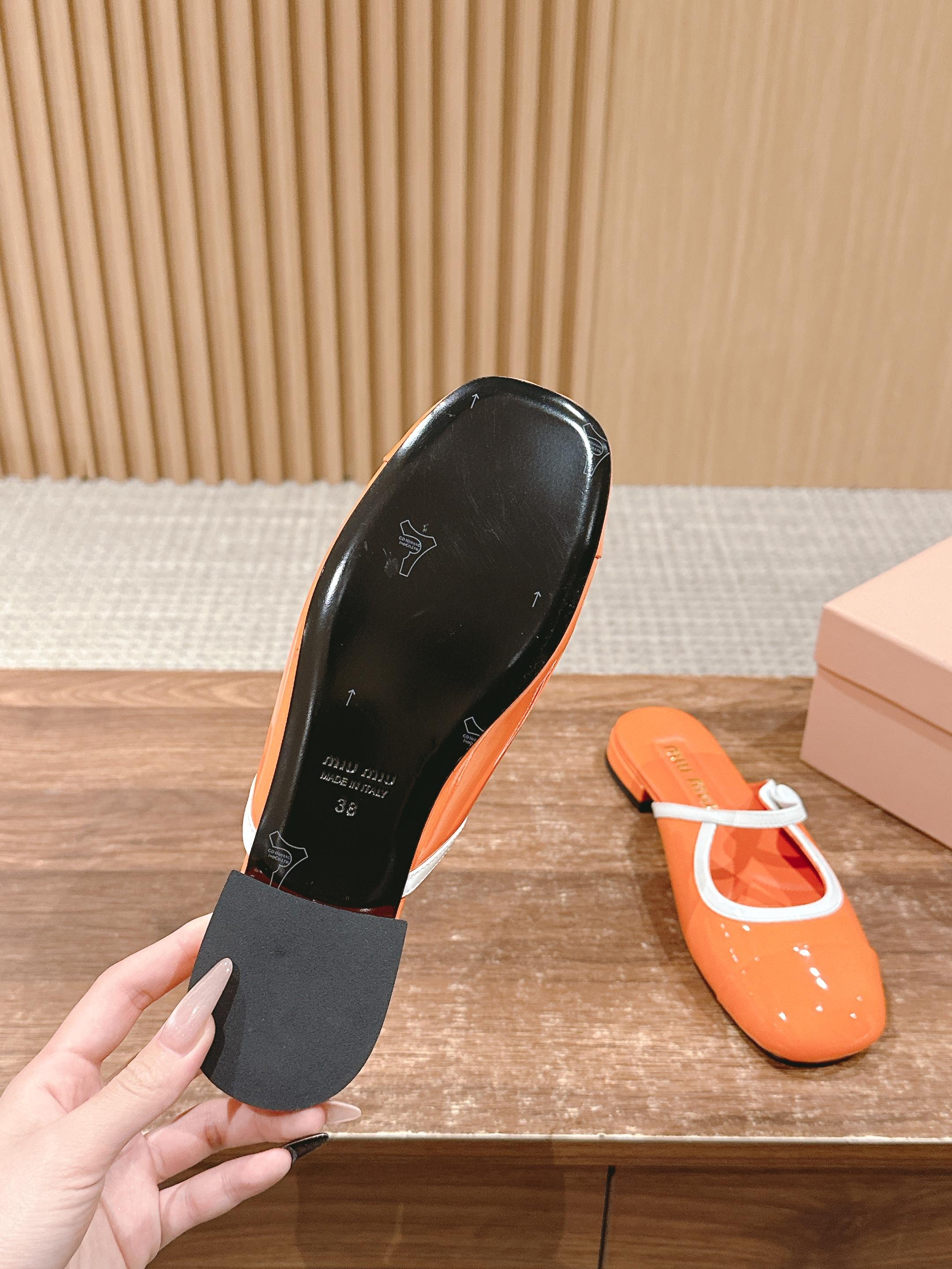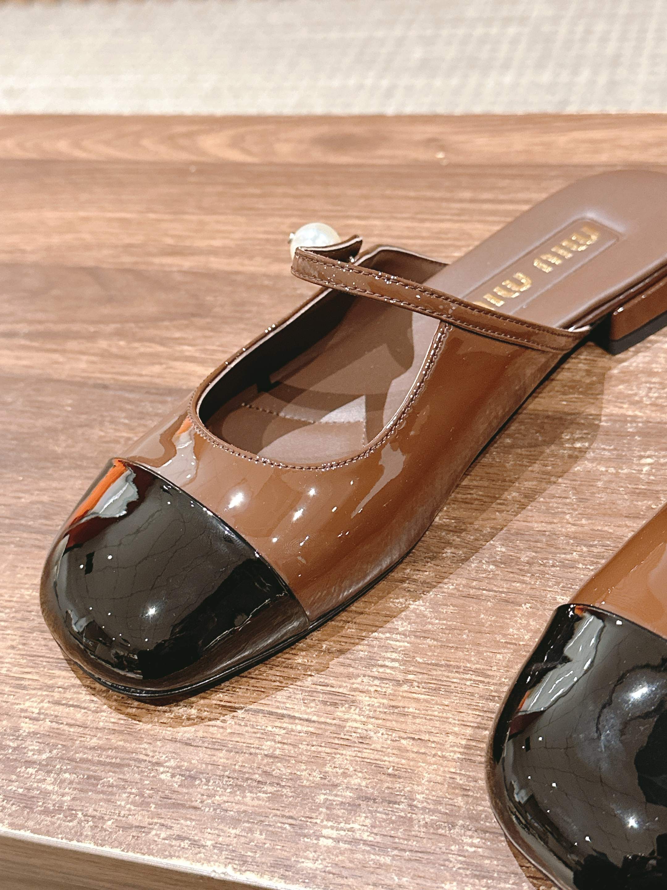 缪缪大王最新款,新款春日多巴胺配色,热情洋溢的搭配就很适适配春天!经典的玛丽珍小巧设计,包头半拖,漆皮的质感真的绝了!单扣带不用担心不跟脚哦!珍珠扣点缀增加小亮眼!!