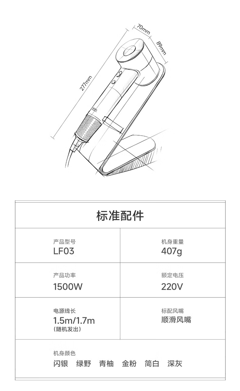 徕芬Laifen 家用电吹风新一代大功率高速吹风机负离子大风力速干不伤发低噪音莱芬便携吹风筒 LF03金粉