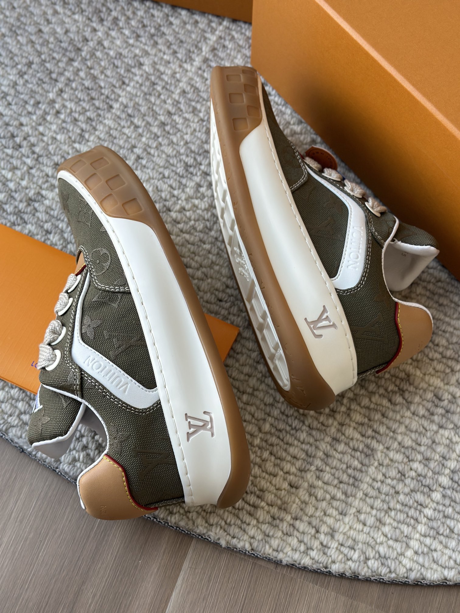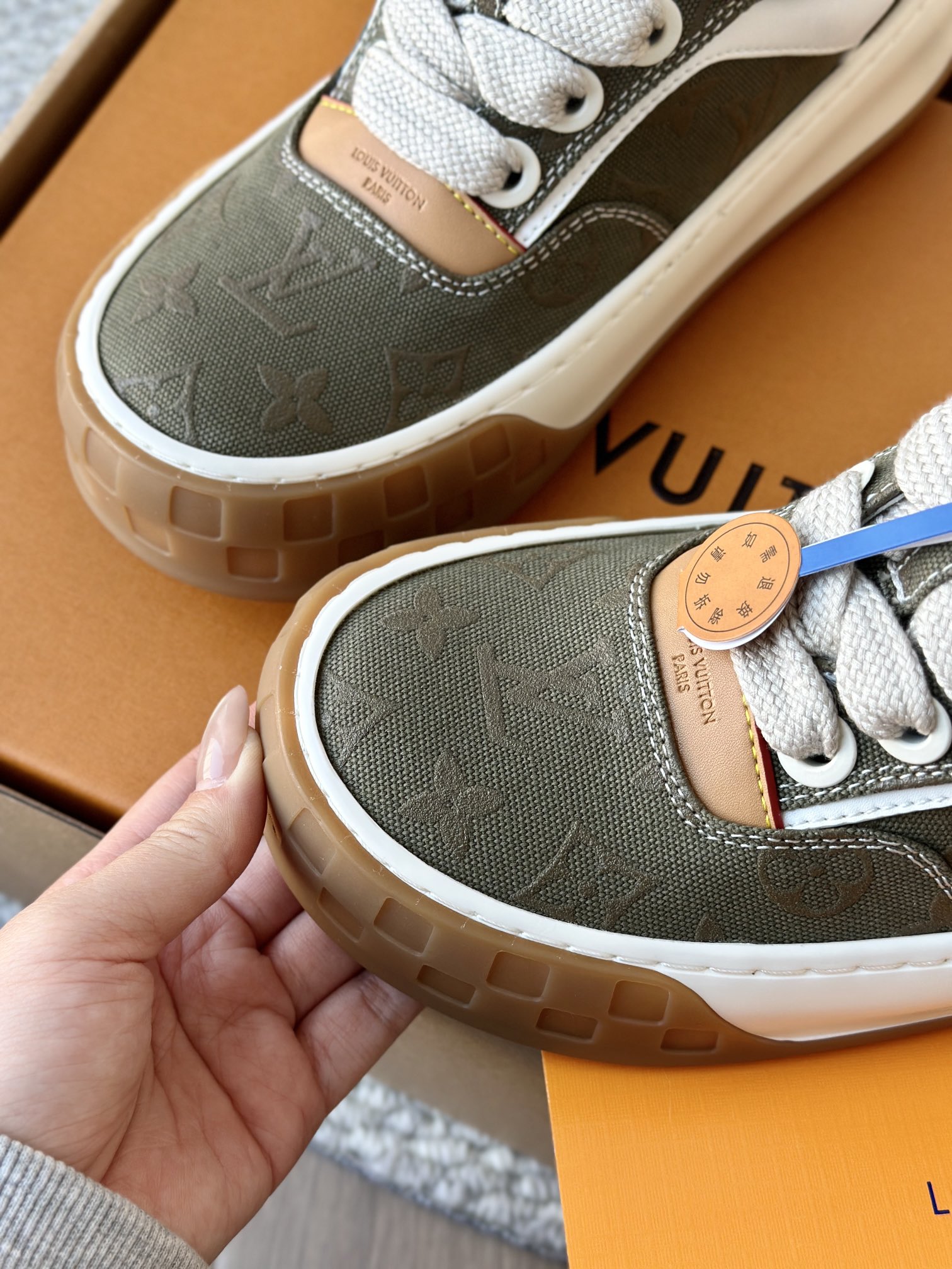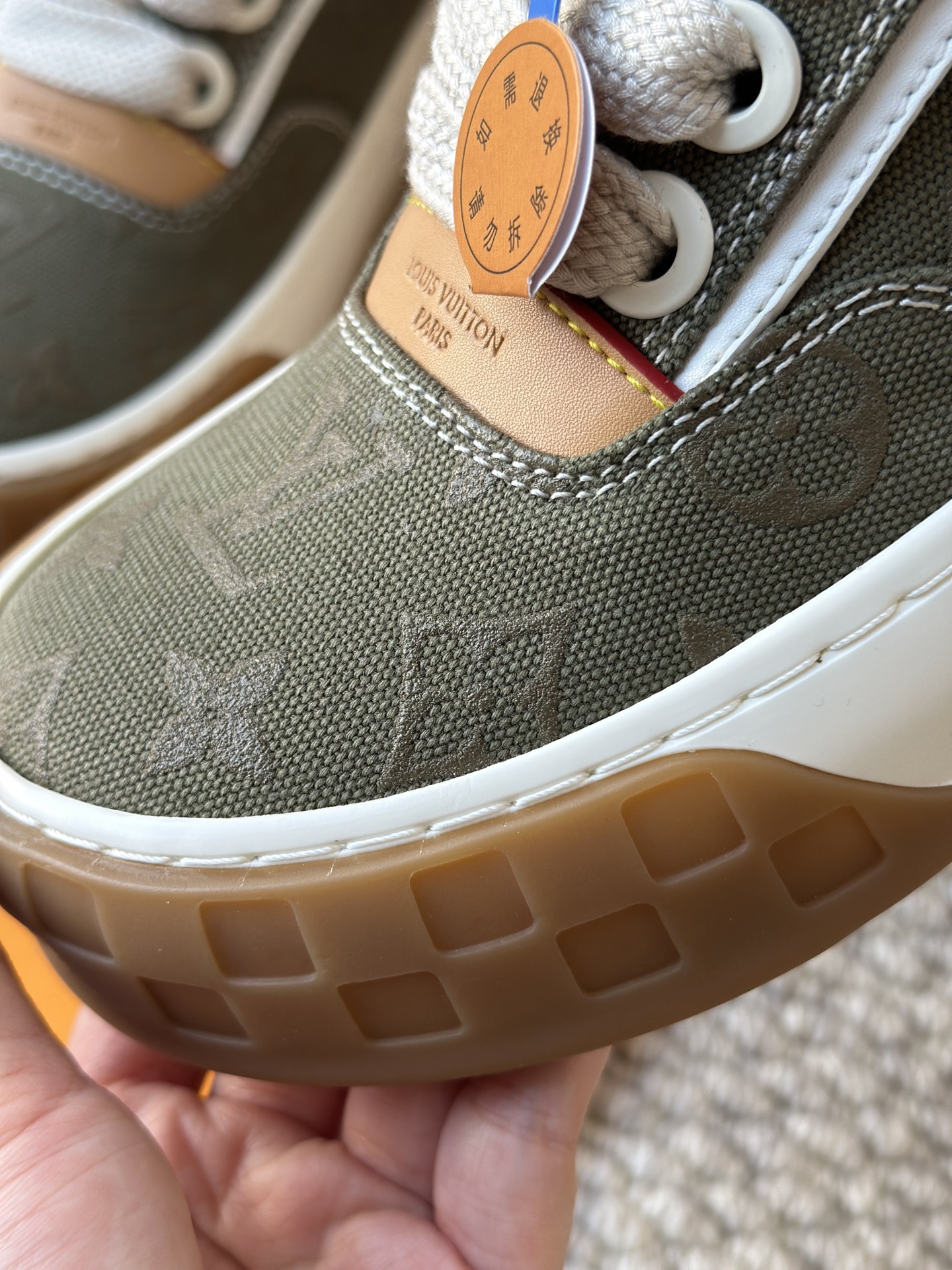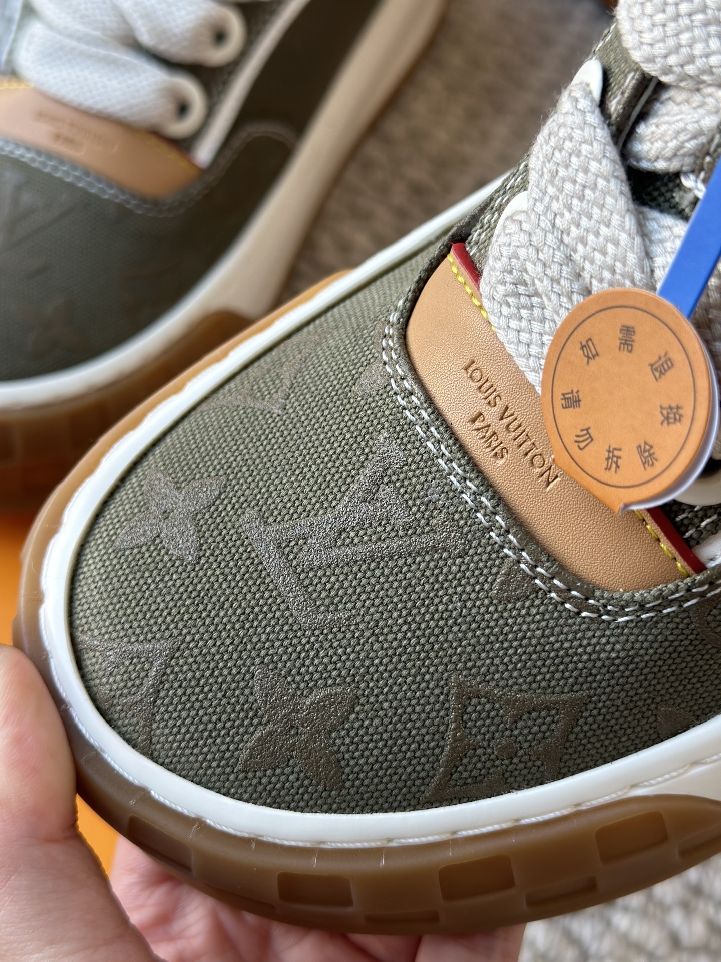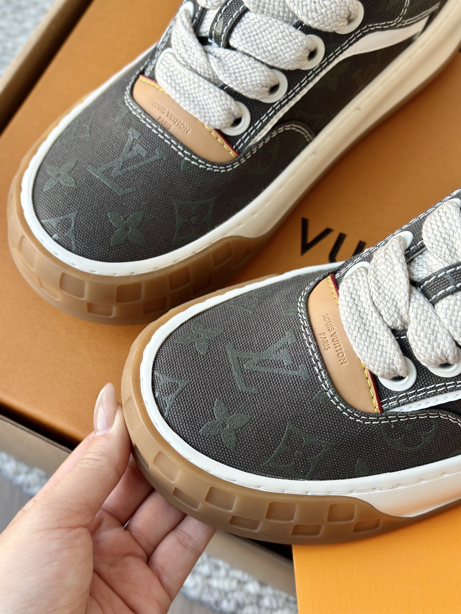 整双鞋的LV标识都超清晰立体! 拉近看LV的logo太有小心机了! 辨识度超高还不会特别夸张,和整双鞋子的风格都融合的很好 超新款!!早穿早享受