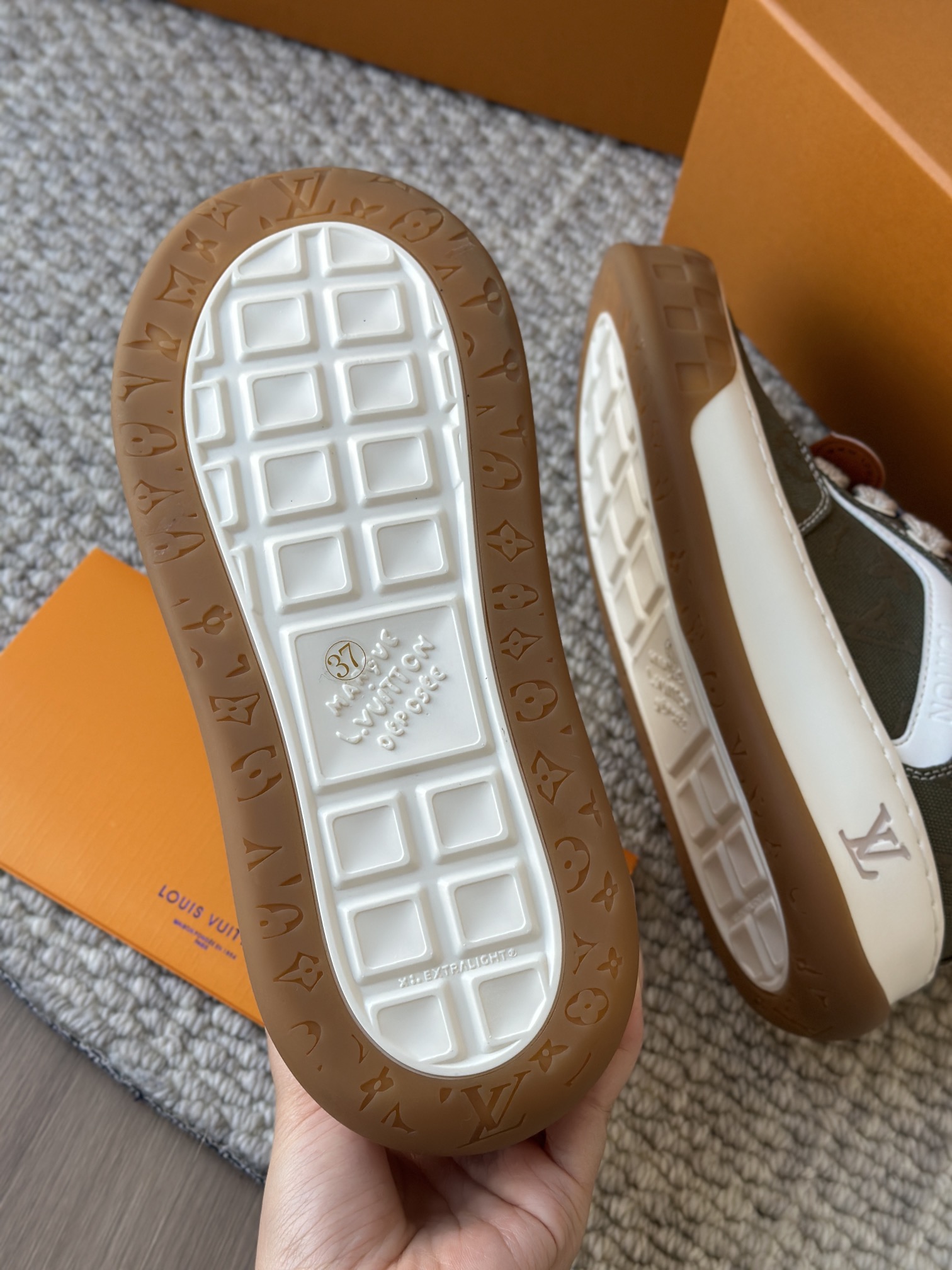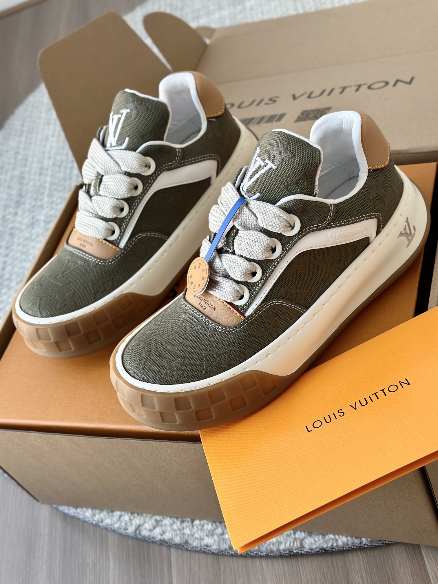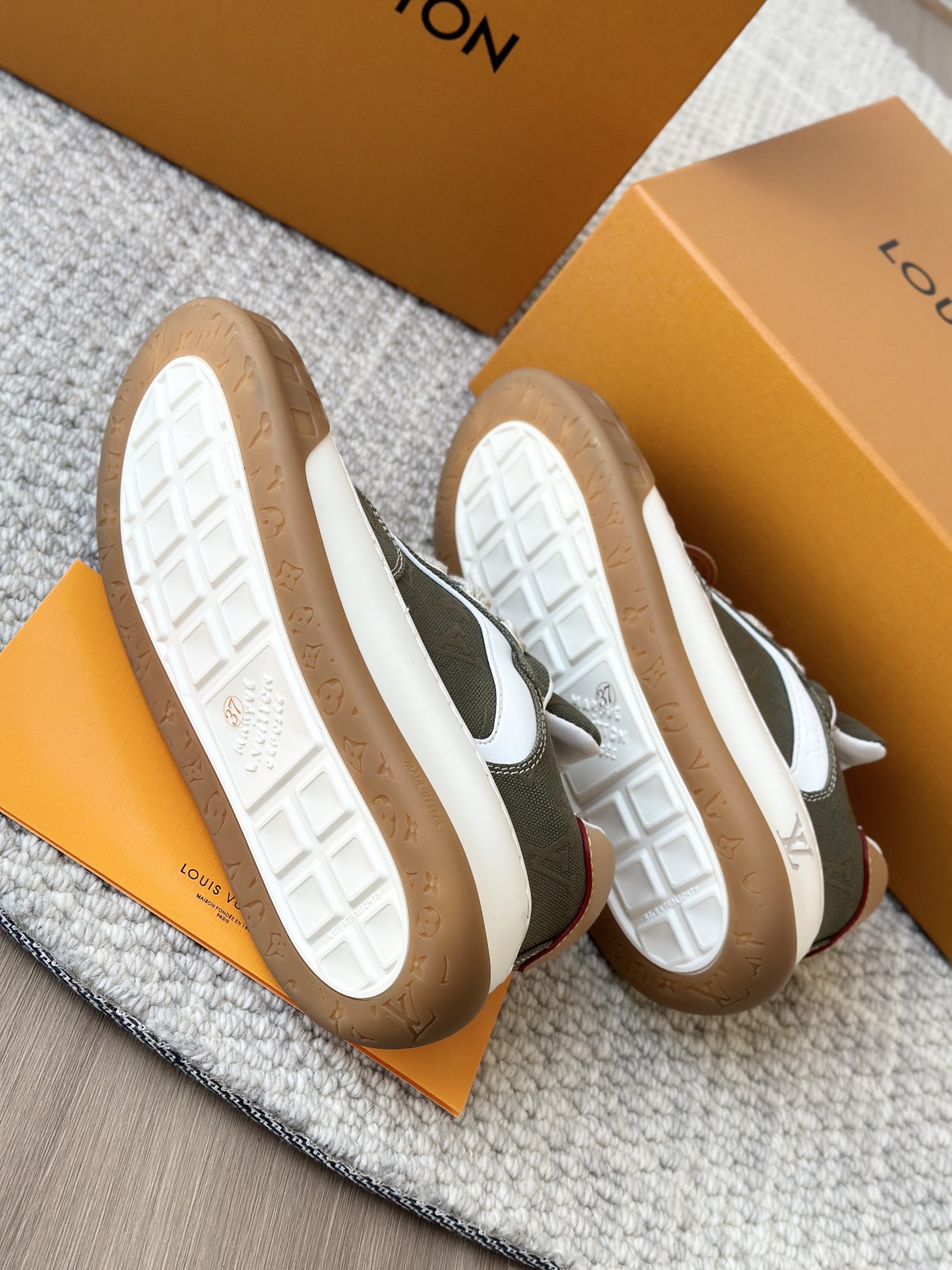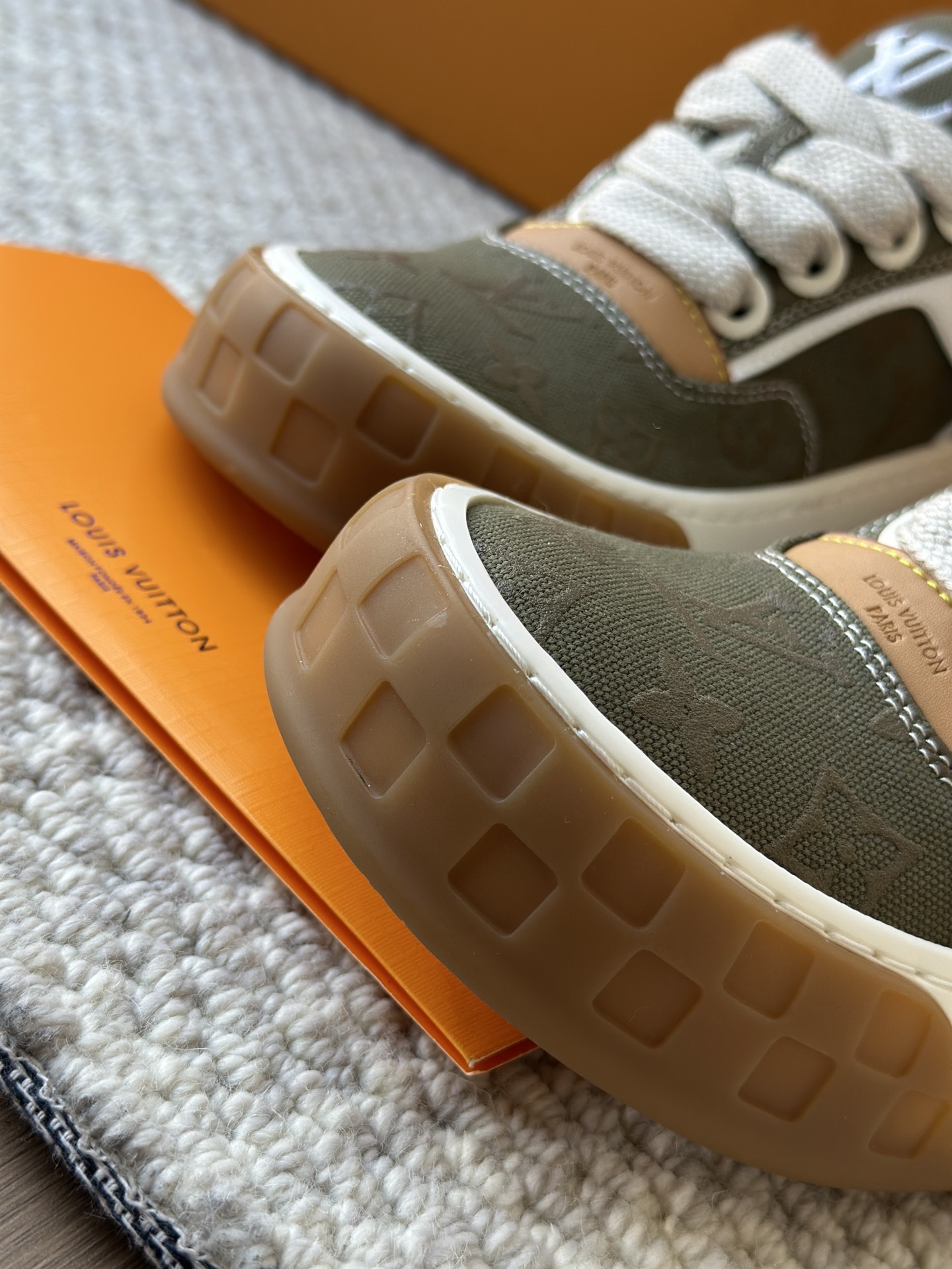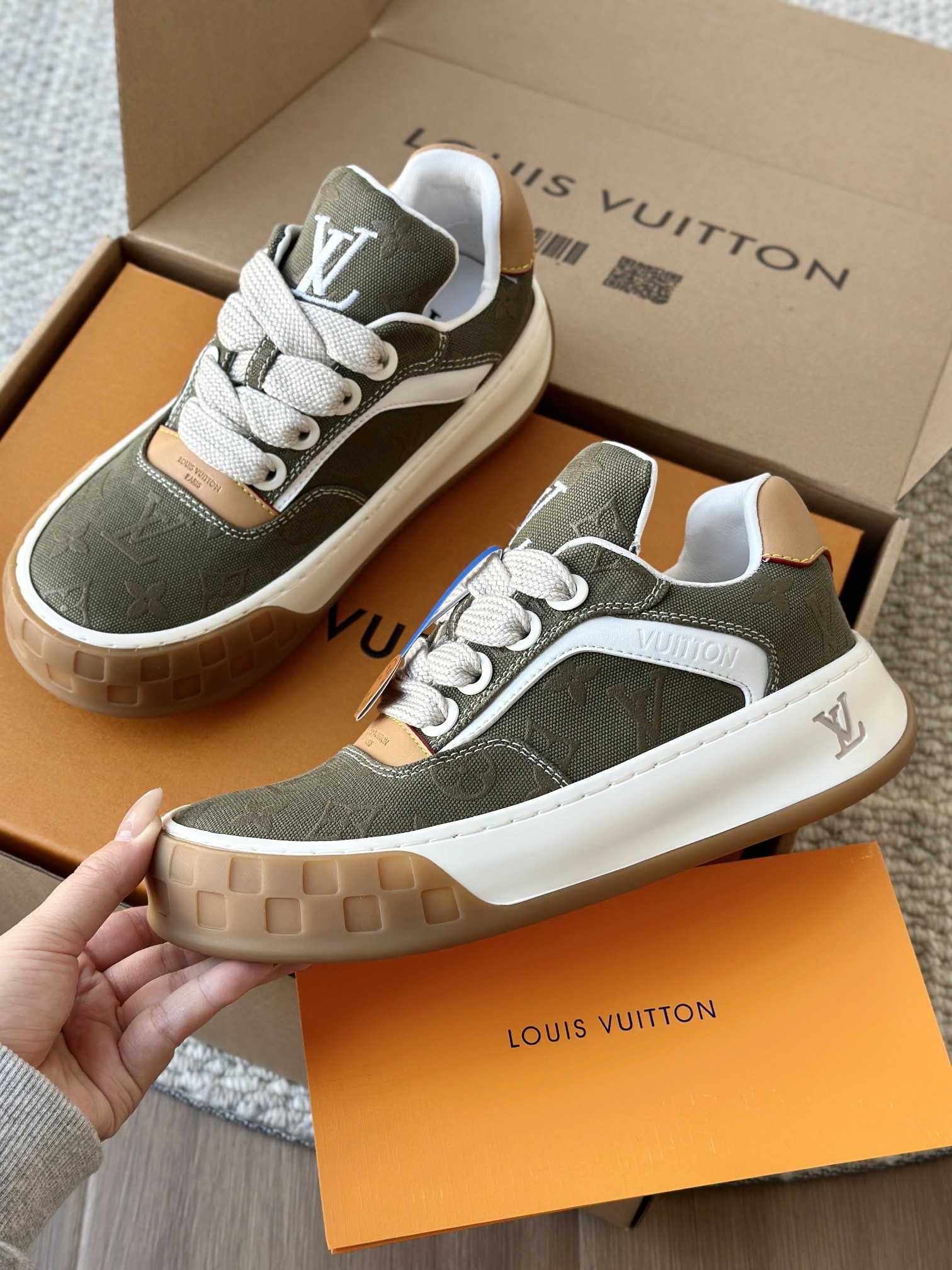 整双鞋的LV标识都超清晰立体! 拉近看LV的logo太有小心机了! 辨识度超高还不会特别夸张,和整双鞋子的风格都融合的很好 超新款!!早穿早享受