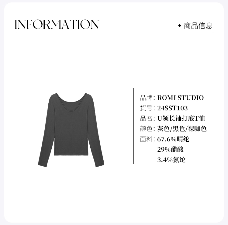 ROMI STUDIO”裸肤挚爱"醋酸混纺弹力U领长袖打底T恤24SST103