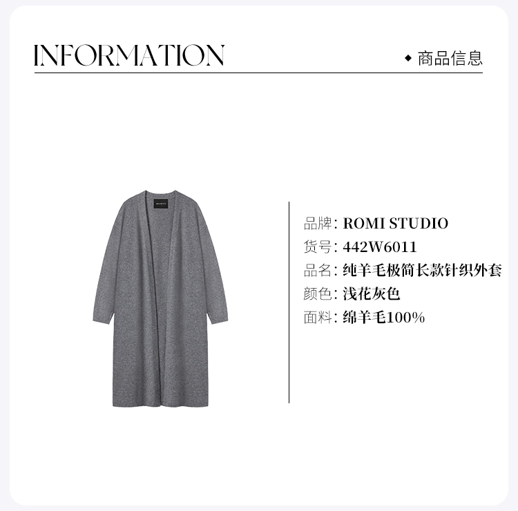 ROMI STUDIO“松弛随性”100绵羊毛无领弹力针织直筒长开衫442W6011