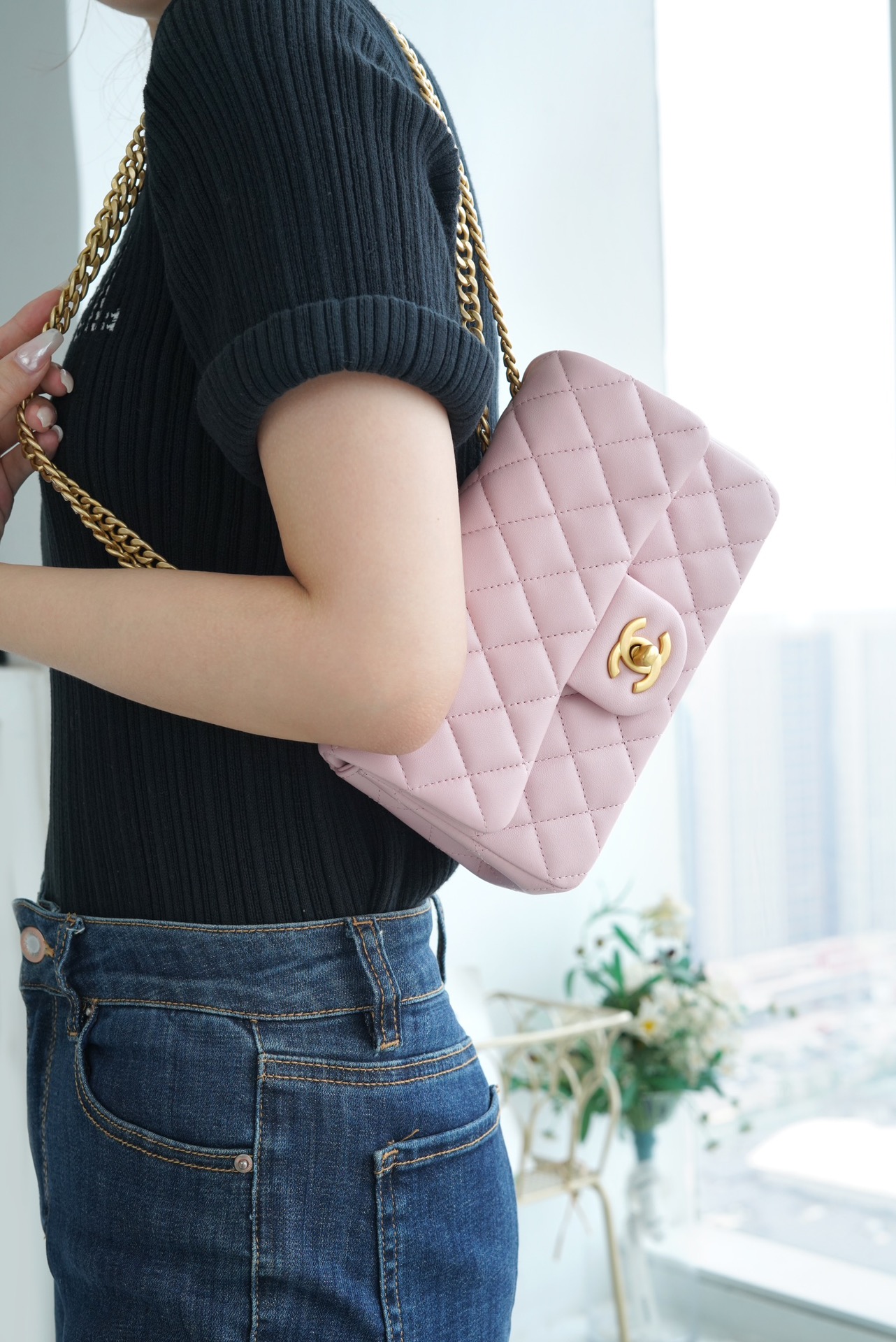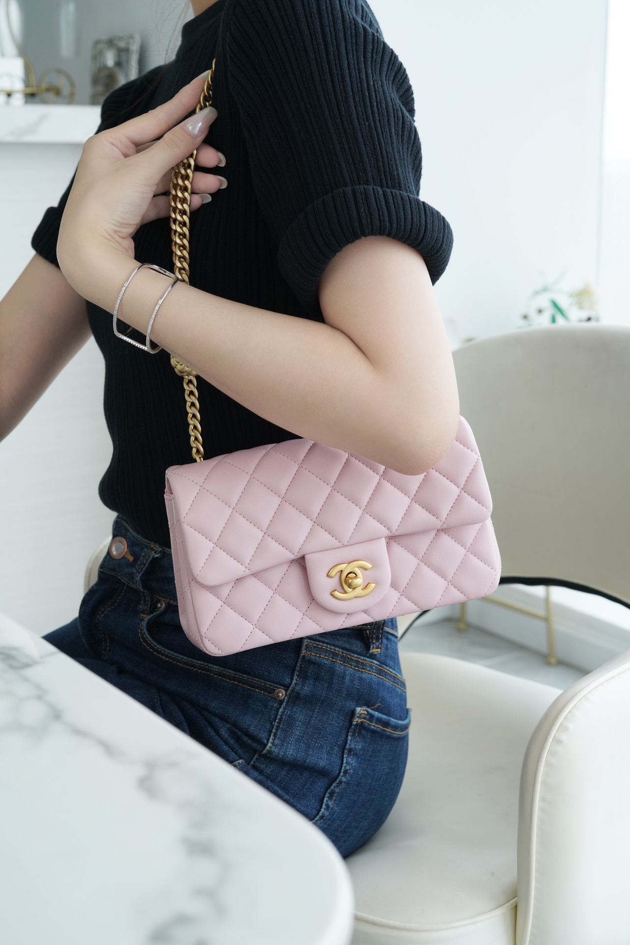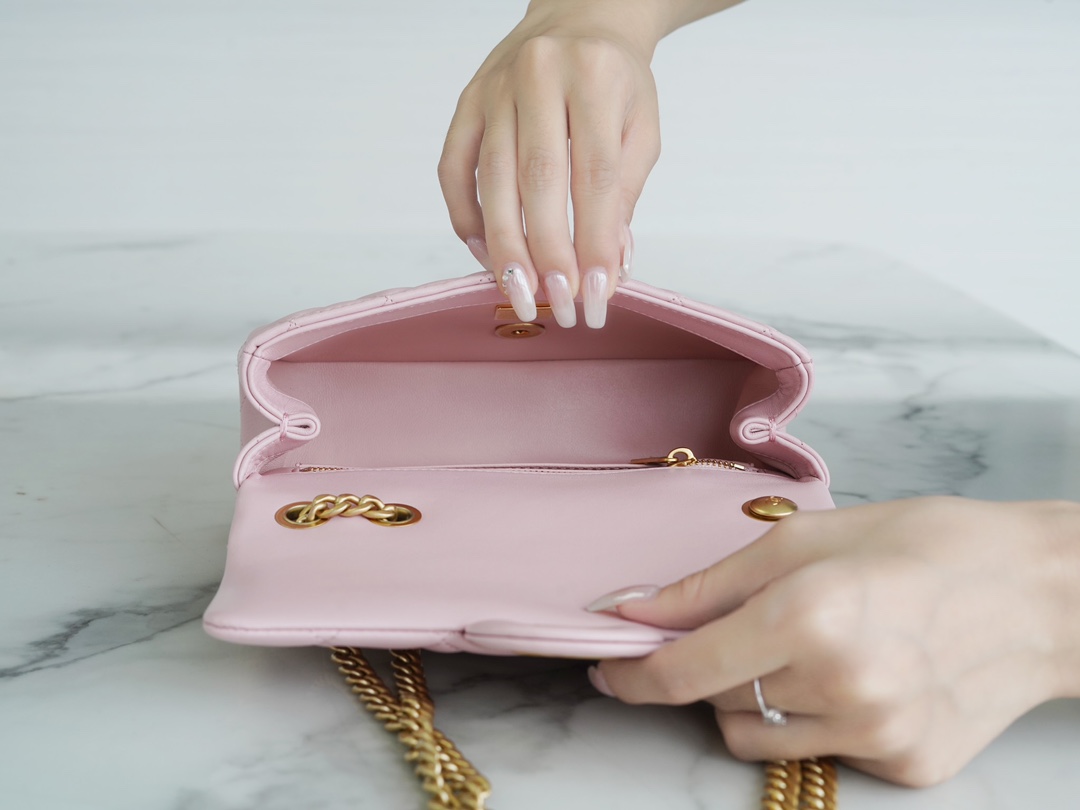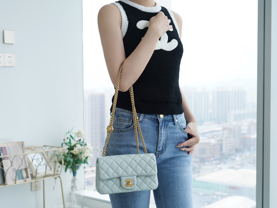本季的大爆款 ,经典的包型搭配可调节“山茶花”扣,做旧双C ????????设计,五金配以简单的素金链,打破了经典的链条设计,满满的复古感,经典又与众不同~