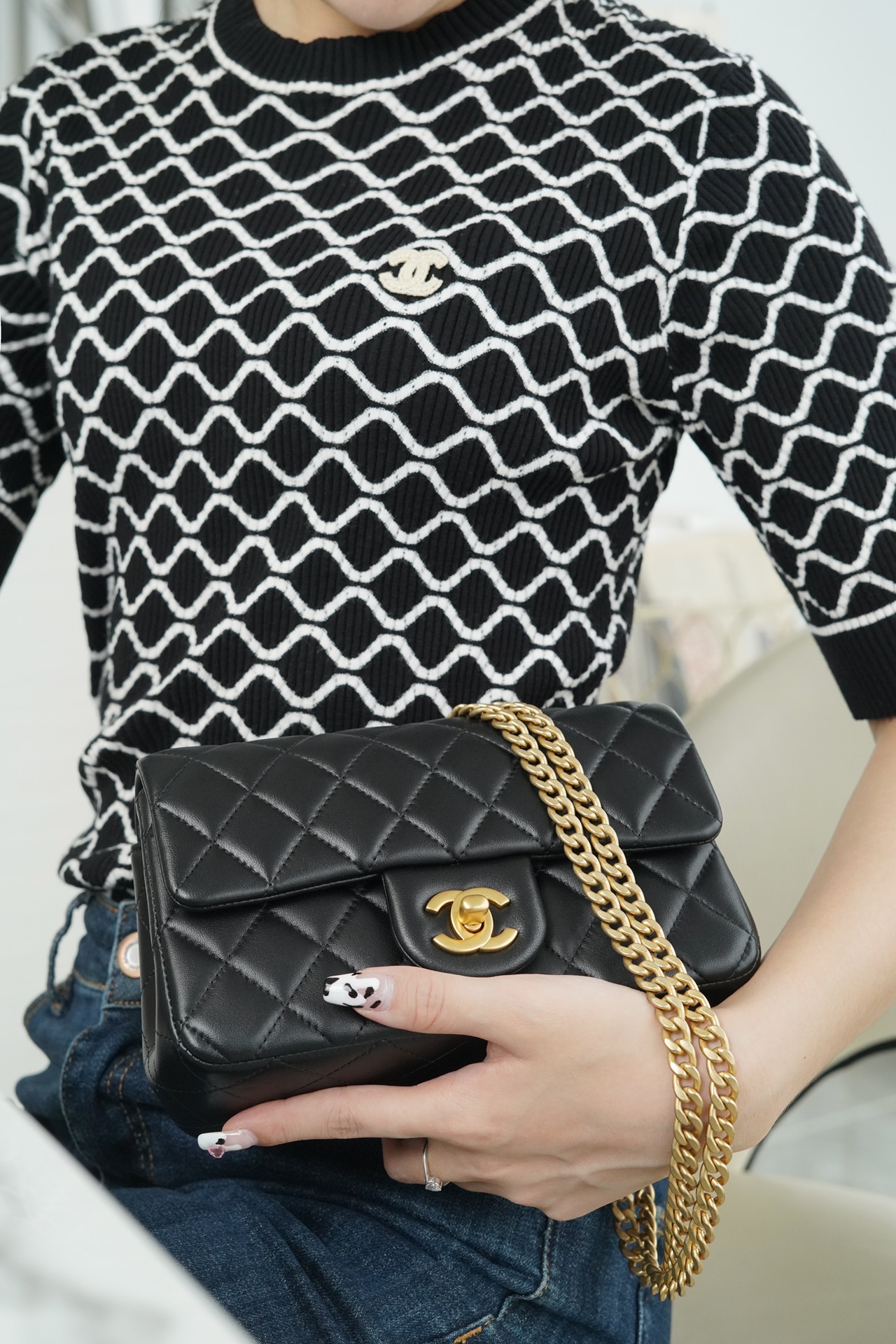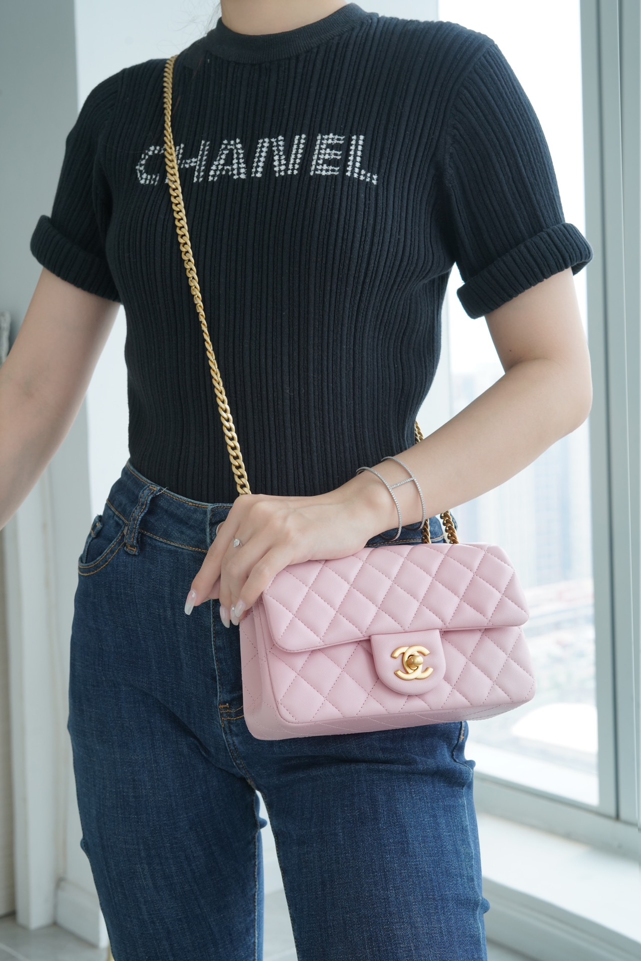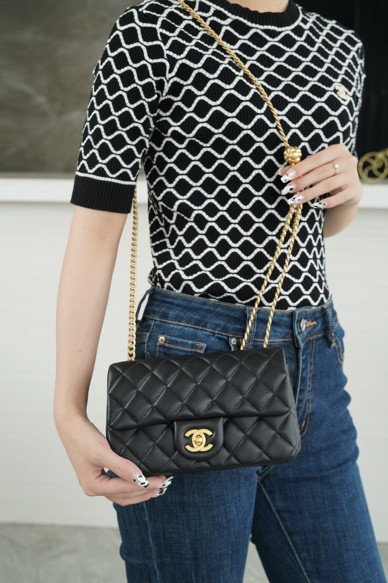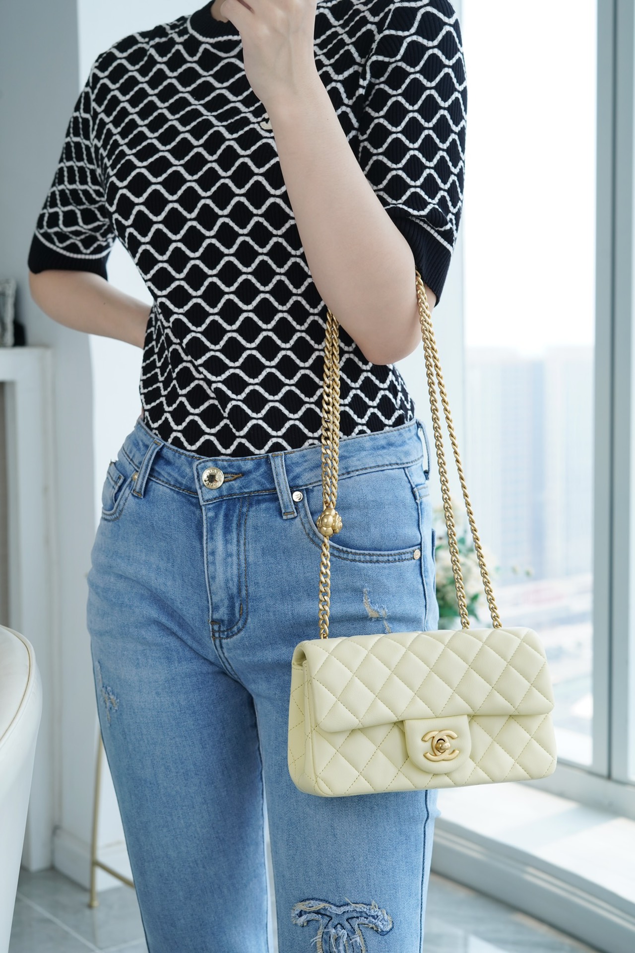 本季的大爆款 ,经典的包型搭配可调节“山茶花”扣,做旧双C ????????设计,五金配以简单的素金链,打破了经典的链条设计,满满的复古感,经典又与众不同~