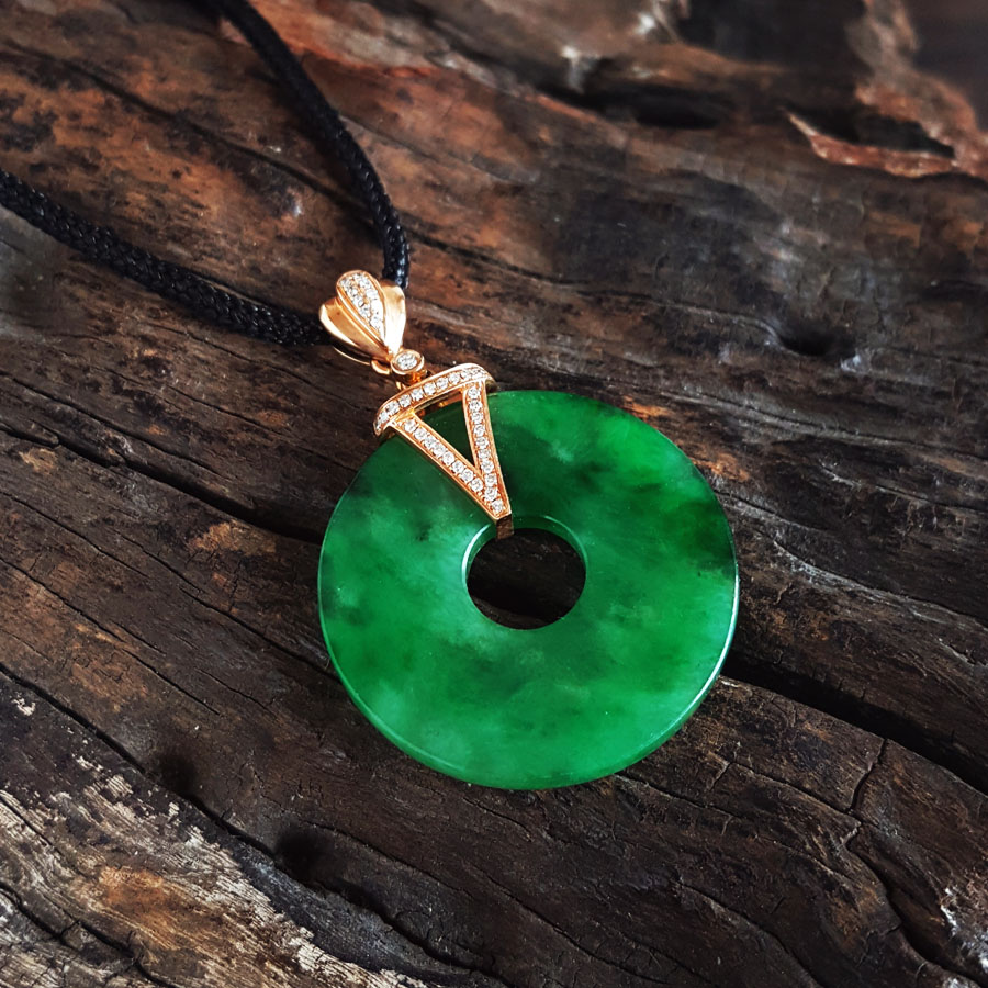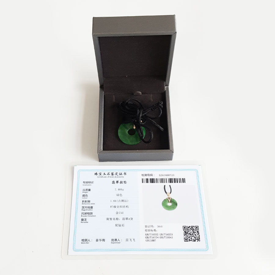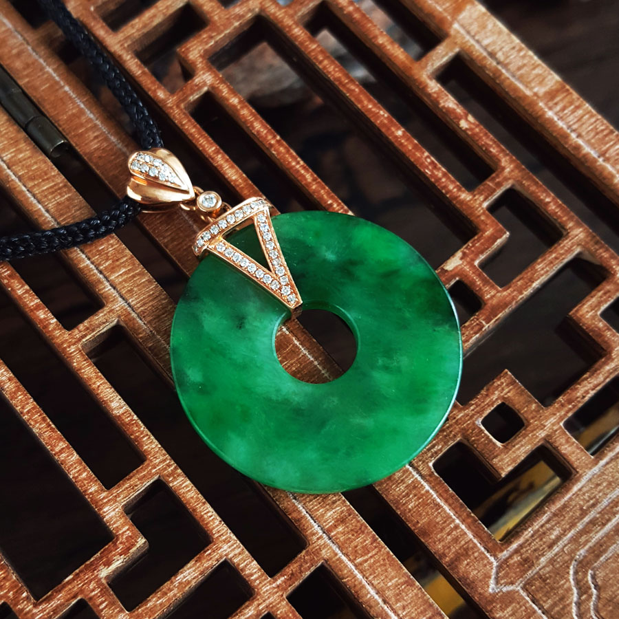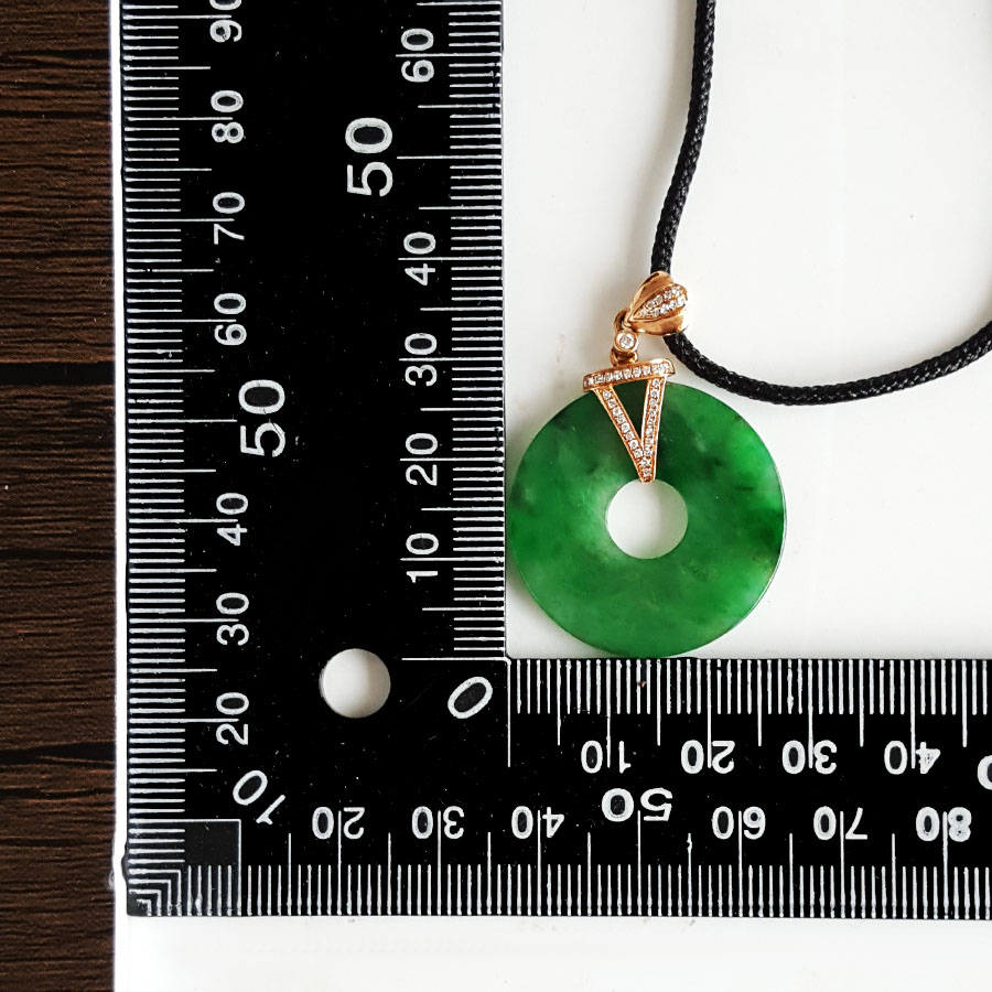 名称 | AU750玫瑰金镶钻镶天然细腻满绿糯冰种平安扣翡翠吊坠项链 |