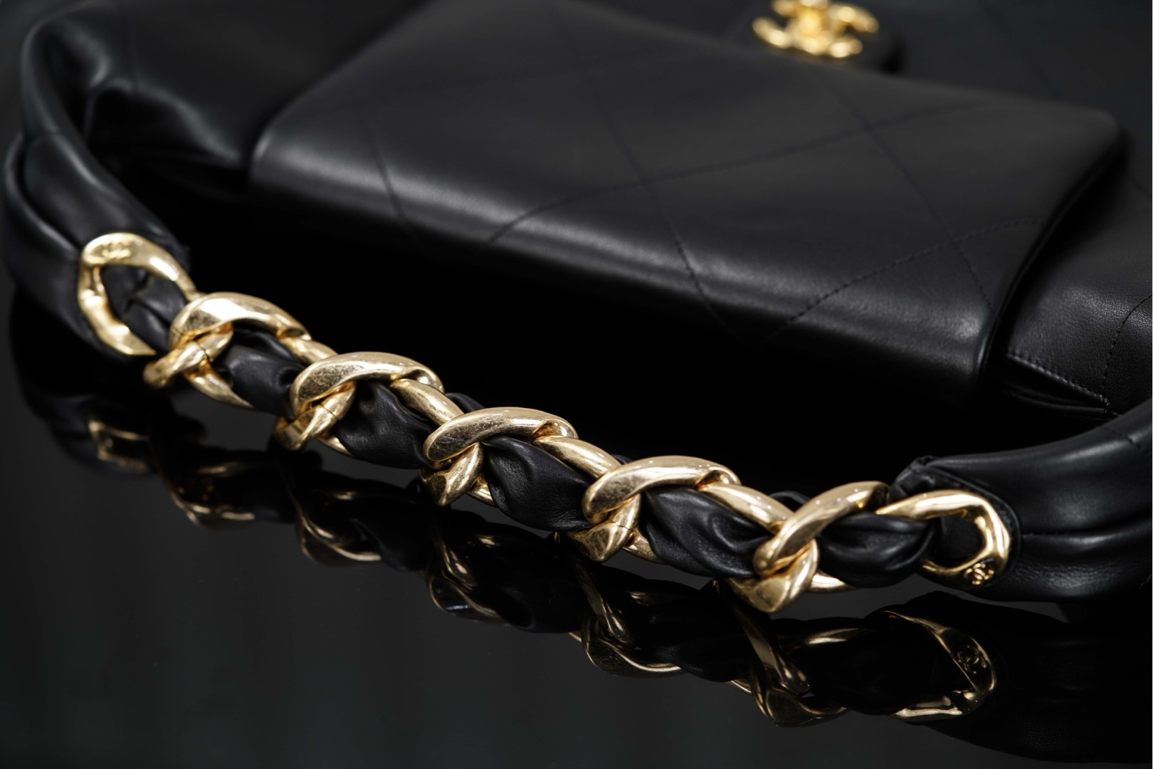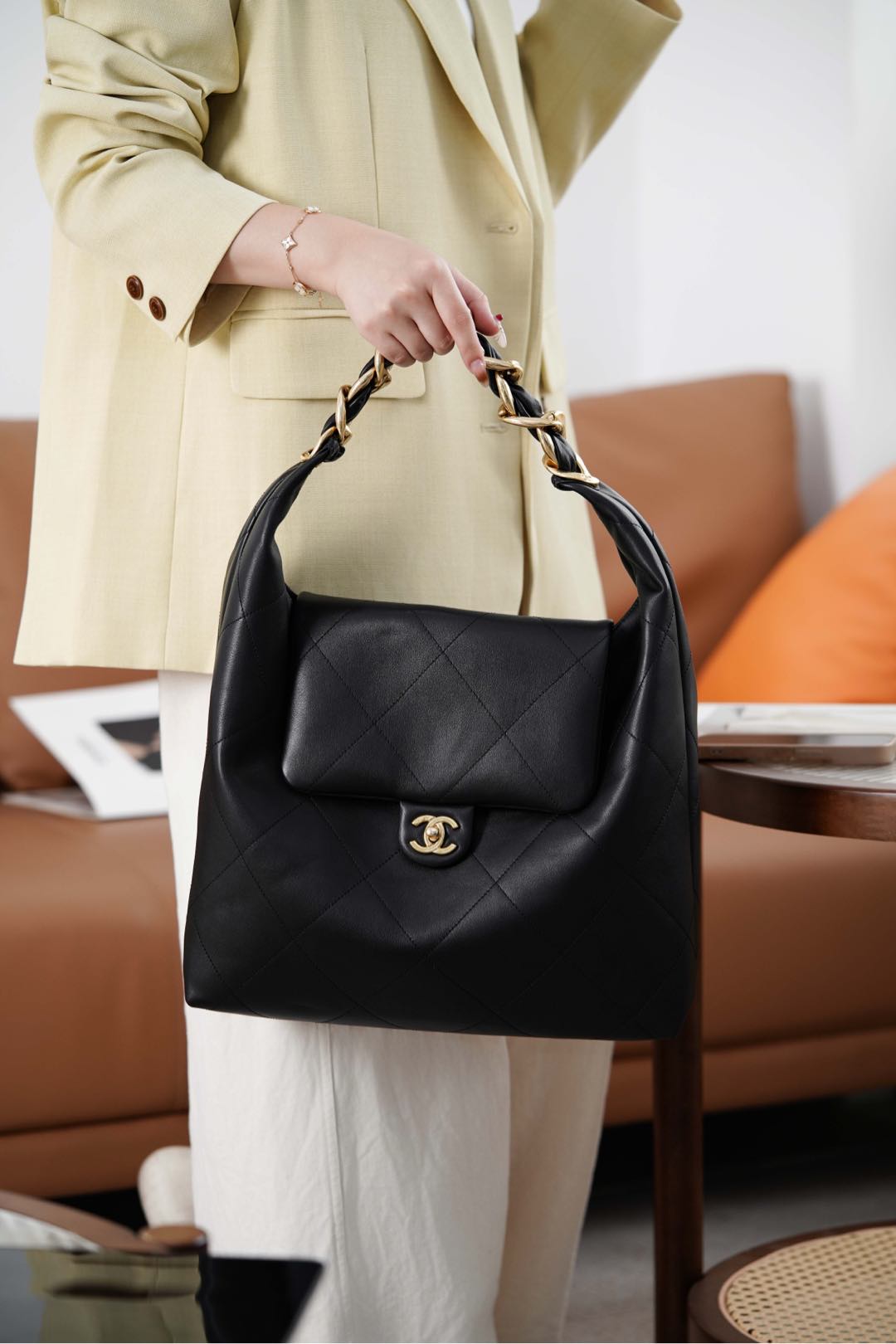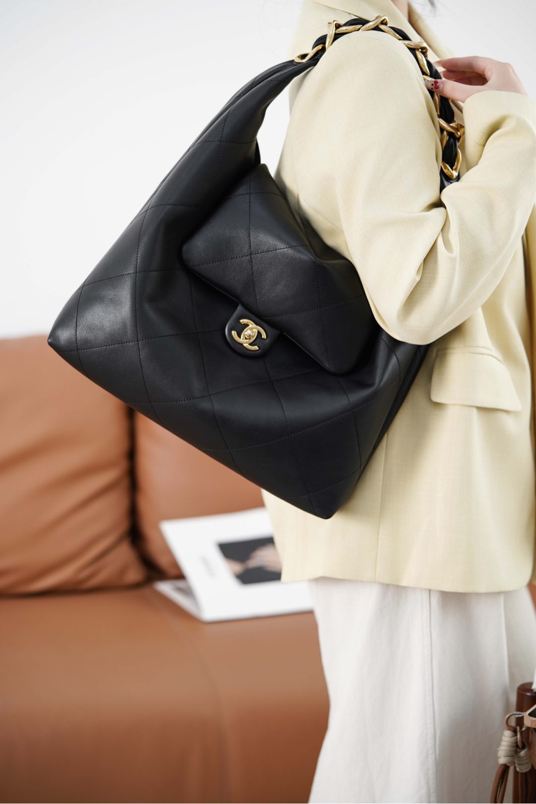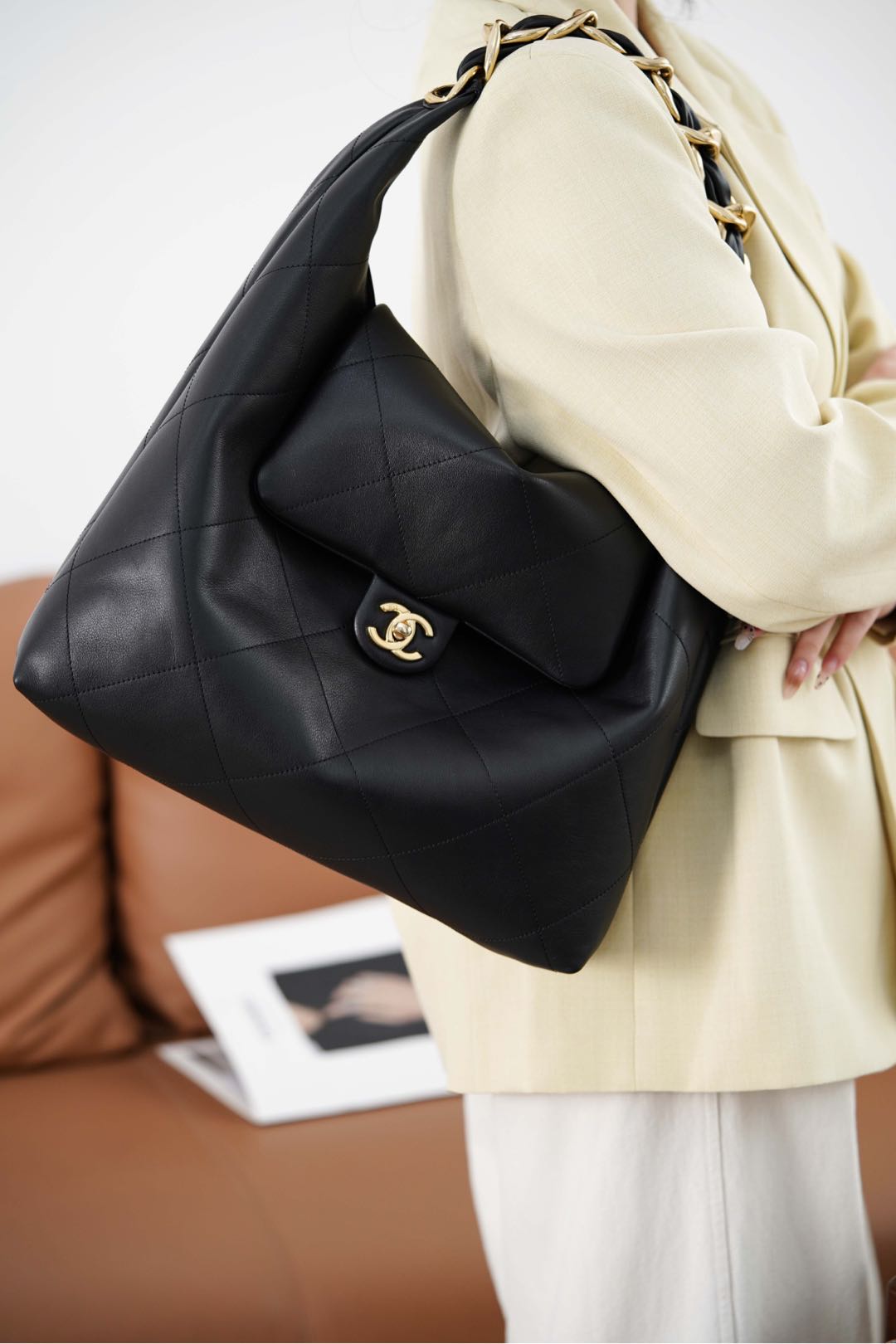 𝐂𝐡𝐚𝐧𝐞𝐥 𝟐𝟓𝐤 嬉皮𝐇𝐨𝐛𝐨包 🖤 大号 秋冬走秀款𝐡𝐨𝐛𝐨‼️经典黑金配色✨ 粗旷金链条!气场全开💣 男女通背的一款! 亮面小牛皮的“细腻柔软” 𝐡𝐨𝐛𝐨包形的“慵懒” 粗链条⛓️的“酷飒” 随手一拎!从职场通勤、到出街、都自带时尚剧本🥳 双𝐜扣不经意间低调闪耀✨ 容量空间更是可以满足通勤、购物;可收纳𝐢𝐩𝐚𝐝,笔记本电脑等… 尺寸:43x33x7cm