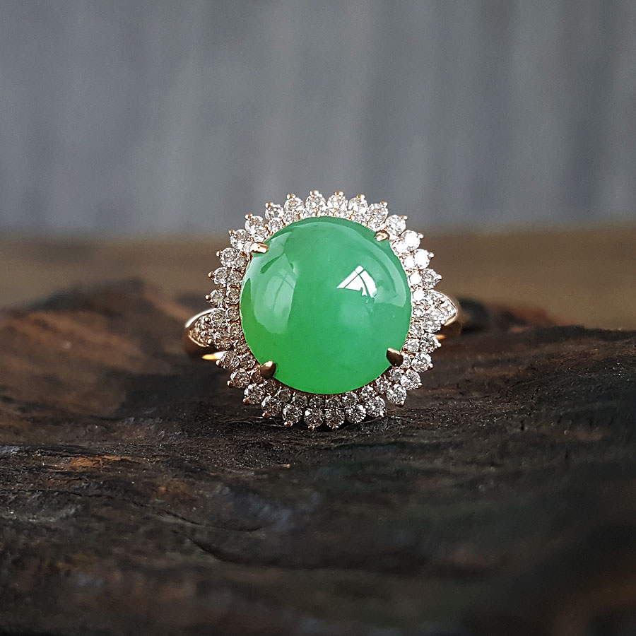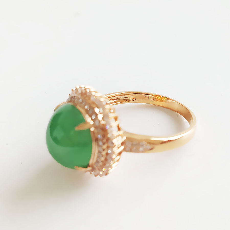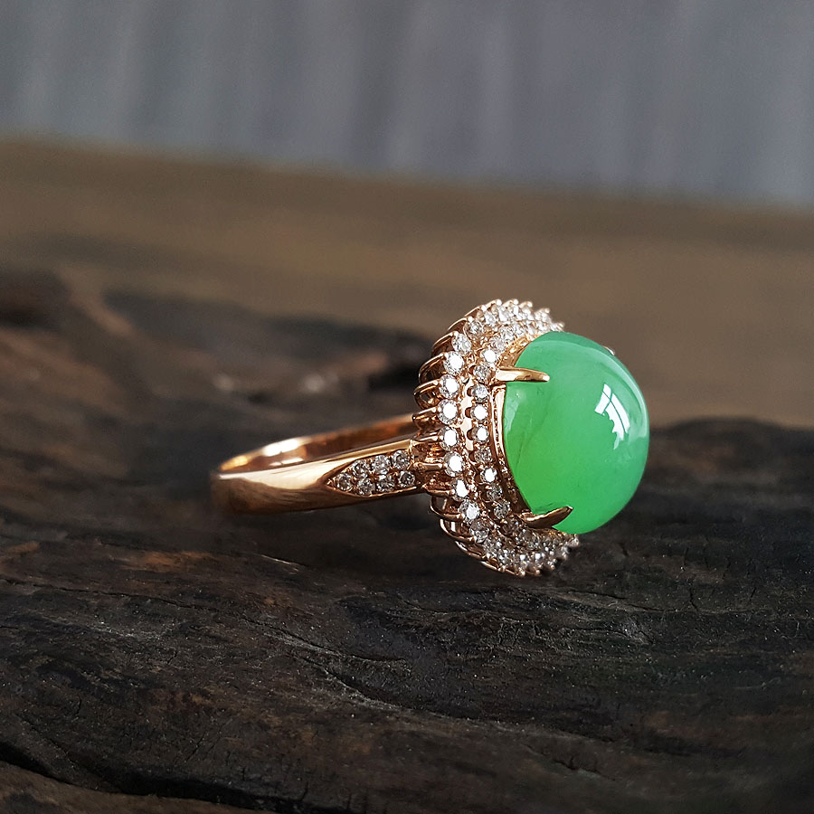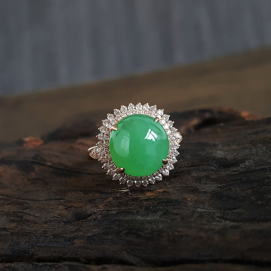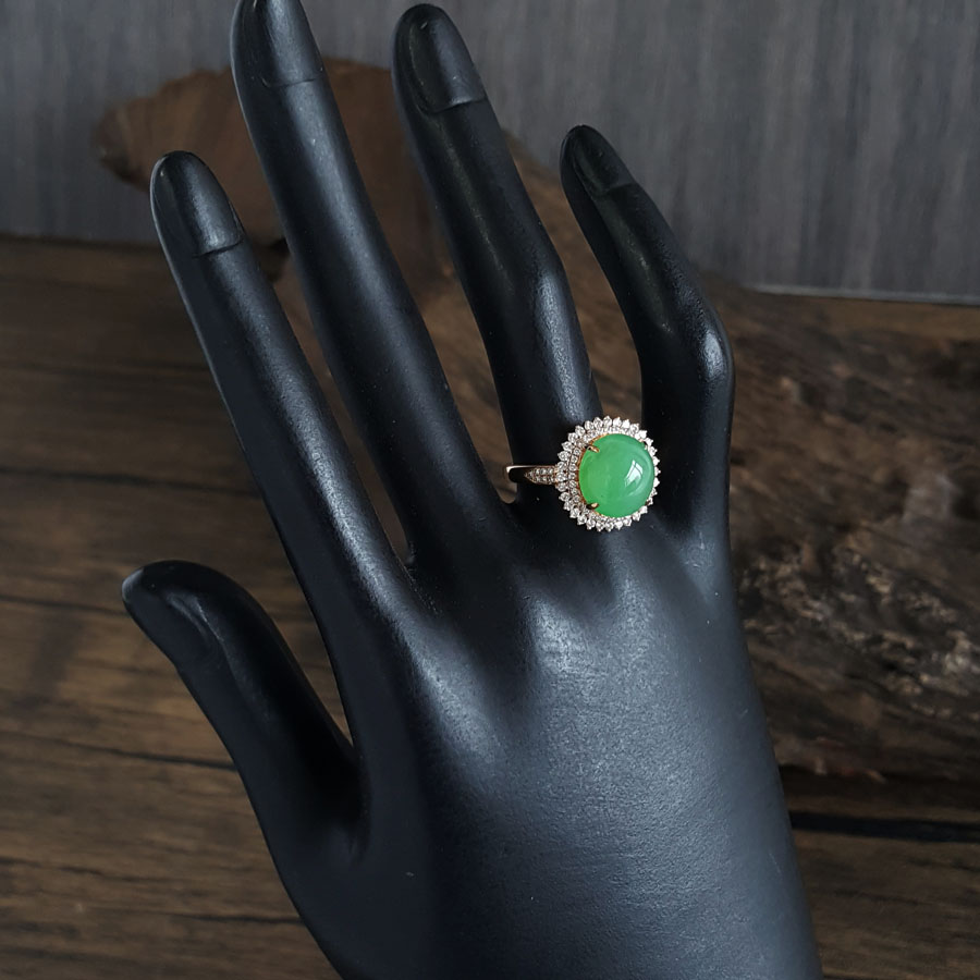 【天然正品】AU750精品玫瑰金镶钻镶天然冰种满绿蛋面翡翠(圆满、吉祥)戒指310324NJ29