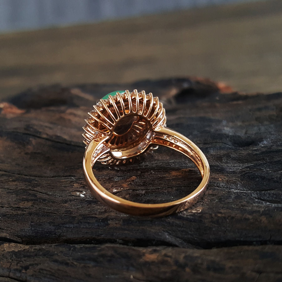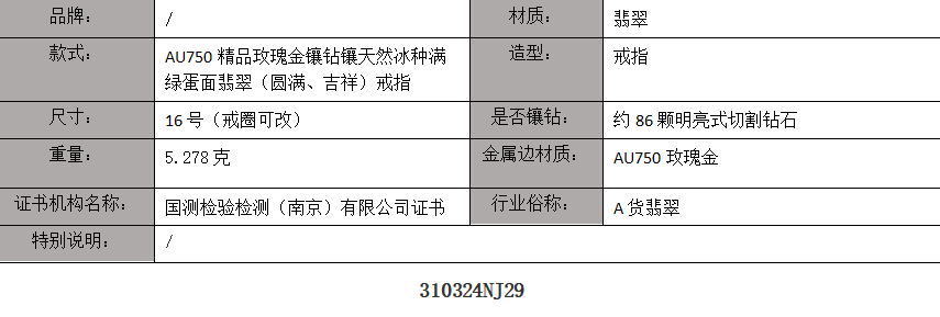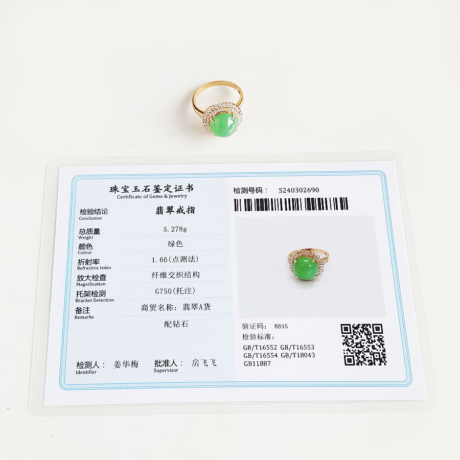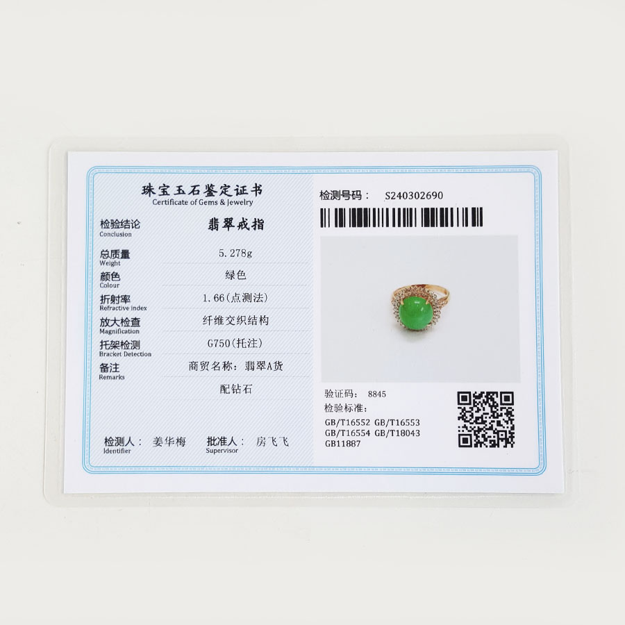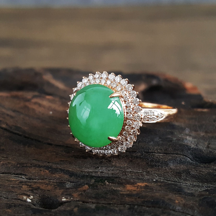 【天然正品】AU750精品玫瑰金镶钻镶天然冰种满绿蛋面翡翠(圆满、吉祥)戒指310324NJ29
