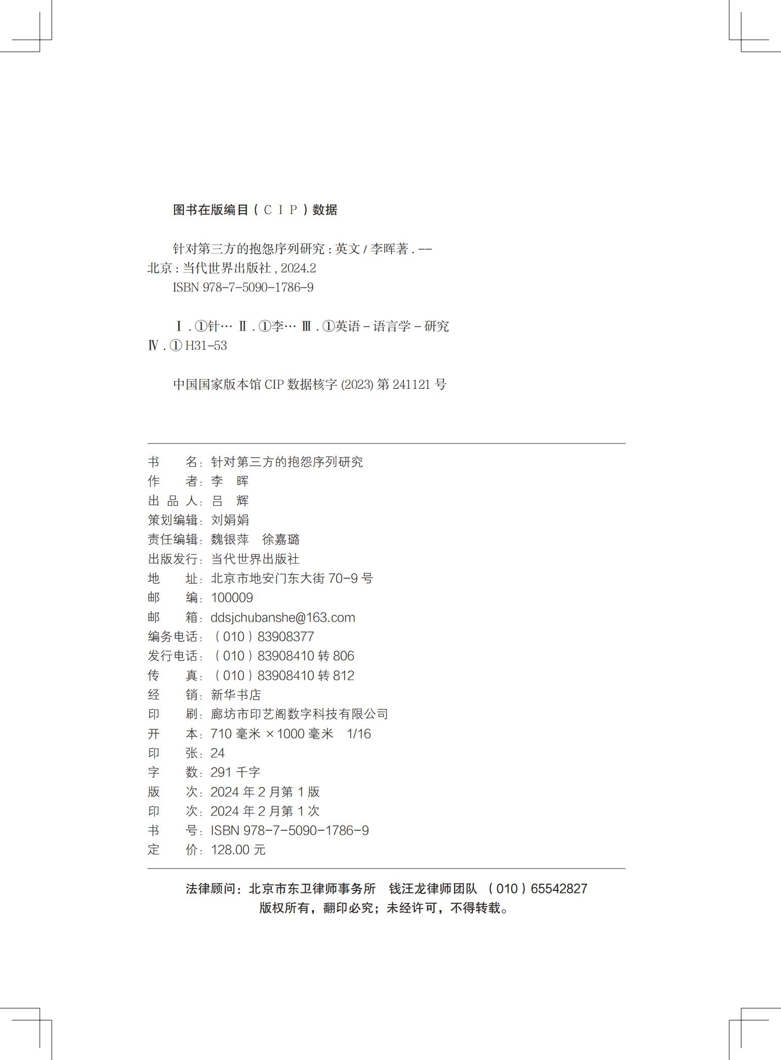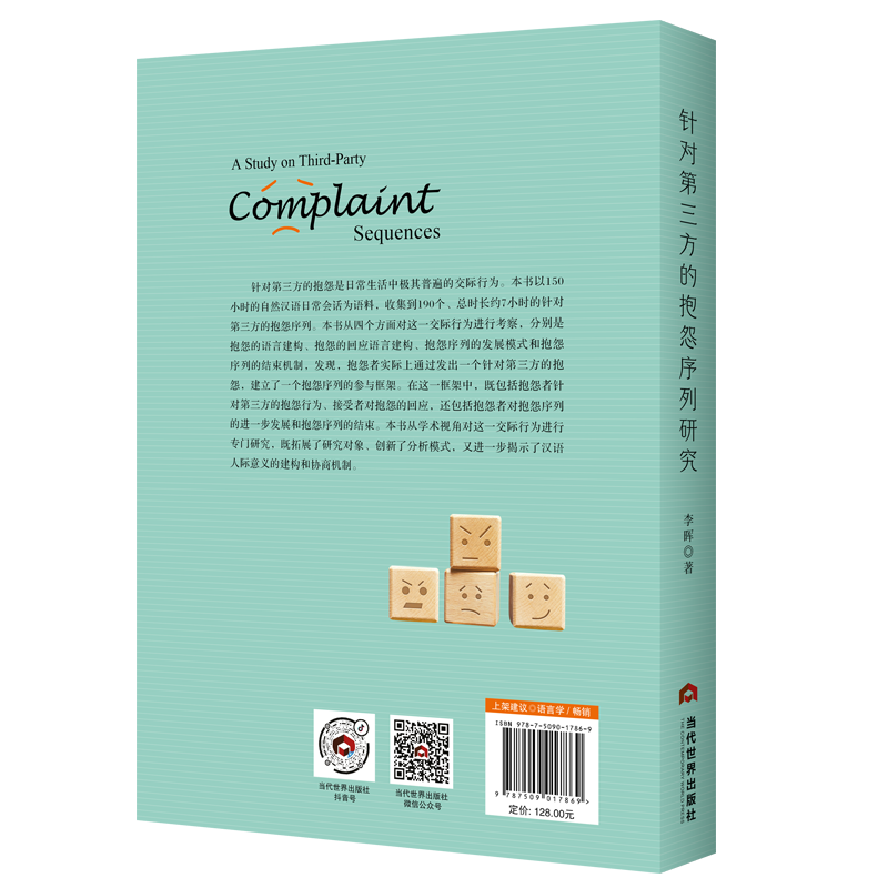 针对第三方的抱怨序列指的是由说话人针对听话人之外的人、事物或情形的抱怨引起的交际序列。它包括抱怨者针对第三方的抱怨行为、接受者对抱怨的回应、抱怨者对抱怨序列的进一步发展和抱怨序列的结束。针对第三方的抱怨是日常生活中极其普遍的交际行为。但是,到目前为止,学界对这一交际行为尚缺乏深入研究。为进一步拓展和完善针对第三方的抱怨序列的研究,本书从四个方面对这一交际行为进行了考察:针对第三方的抱怨的语言建构;针对第三方的抱怨的回应语言建构;针对第三方的抱怨序列的序列发展模式;针对第三方的抱怨序列的结束机制。