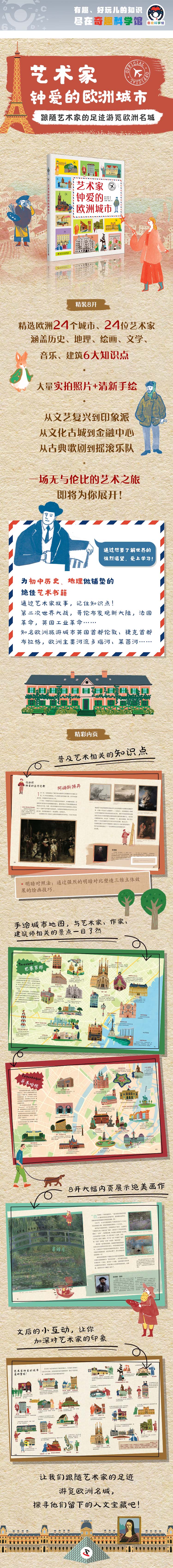 适读人群 :7-10岁 《艺术家钟爱的欧洲城市》精选欧洲24个城市、24位艺术家。涵盖历史、地理、绘画、文学、音乐、建筑6大知识点。从文艺复兴到印象派,从文化古城到金融中心,从古典歌剧到摇滚乐队……现在,随我一起打开这本书,一场无与伦比的艺术之旅,即将为你展开。 带着这本书,踏上旅程,那一定会不虚此行。你也可以把这本书当作一本种草清单,长大后跟着这本书,一个个打卡。也许到时候,你会有种故地重游的熟悉感,走在古老的石阶路上,神秘的传说相遇儿时的时光。这也不失为一件浪漫的事。