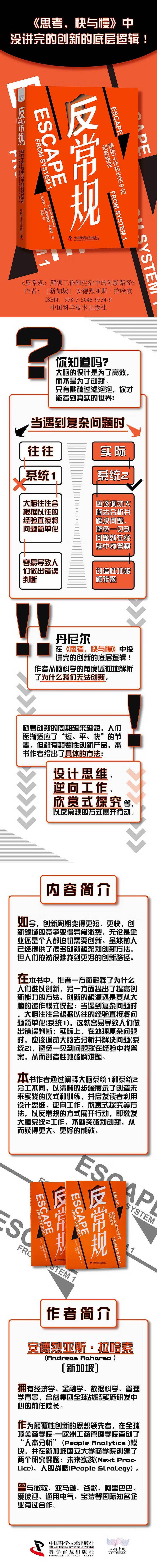 如今,创新周期变得更短、更快,创新领域的竞争变得异常激烈,无论是企业还是个人都迫切需要创新。虽然前人已经提供了很多创新框架和创新方法,但人们依然很难找到更好的创新路径。 在本书中,作者一方面解释了为什么人们难以创新,另一方面提出了提高创新能力的方法。创新的根源还是要从大脑的运作模式说起:当遇到复杂问题时,大脑往往会根据以往的经验直接将问题简单化(系统1),这就容易导致人们做出错误判断;实际上,在处理复杂问题时,应该调动大脑去分析并解决问题(系统2),避免一见到问题就在经验中找答案,从而创造性地破解难题。 本书作者通过阐释大脑系统1和系统2分工不同,以清晰的步骤展示了创造未来实践的仪式和训练,并启发读者利用设计思维、逆向工作、欣赏式探究等方法,以反常规的方式展开行动,即激发大脑系统2工作,不断突破和创新,从而获得更大、更好的成就。