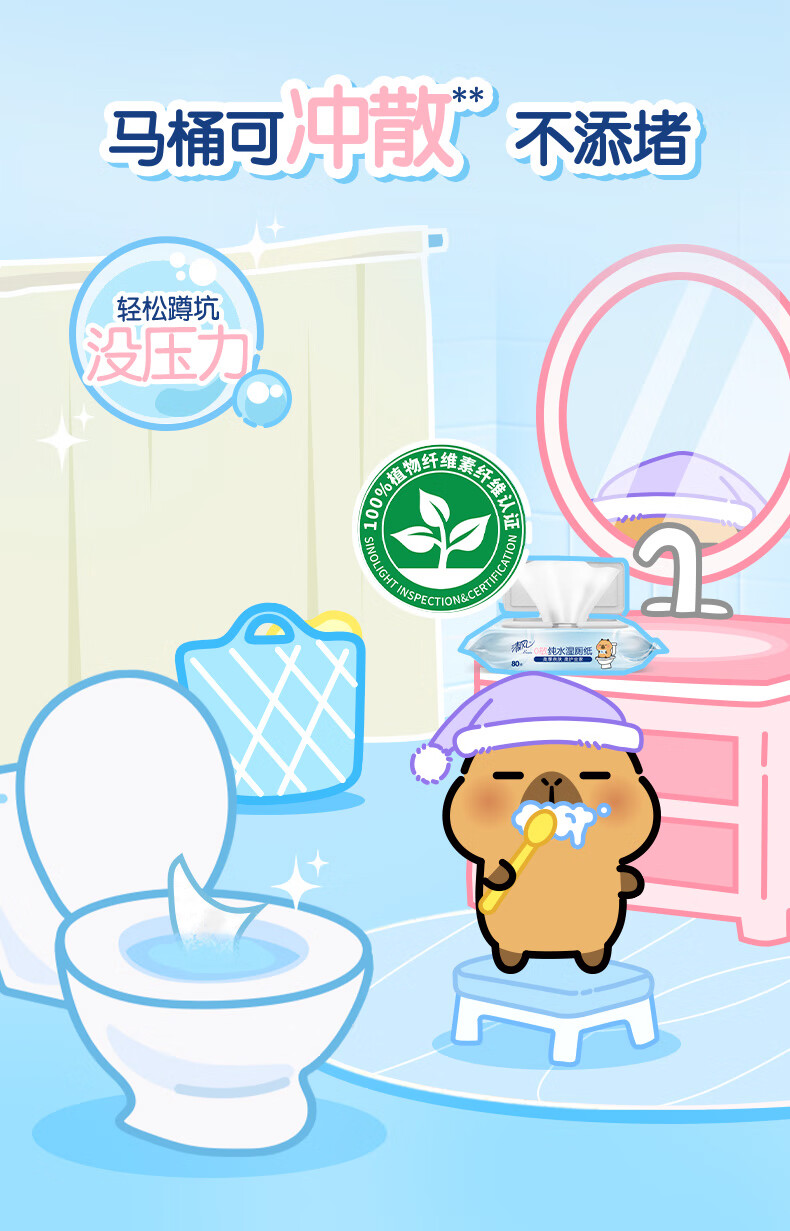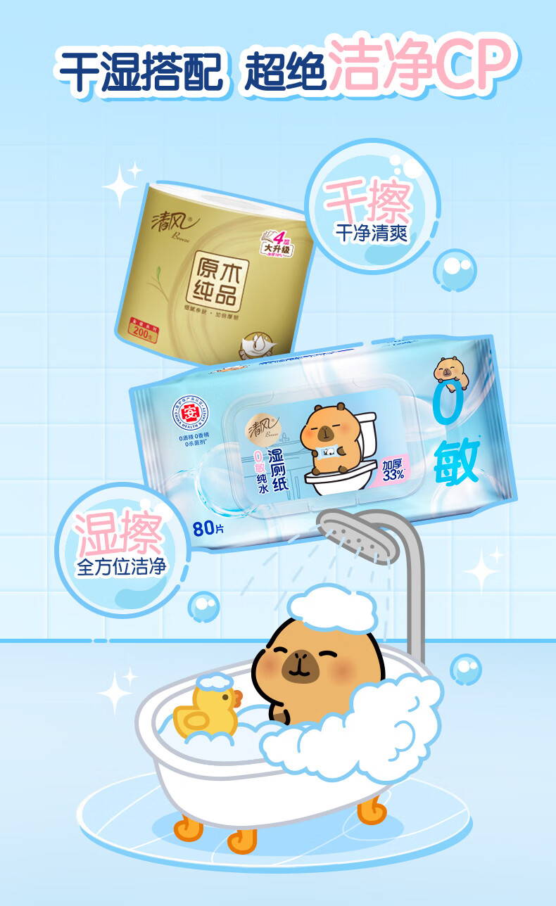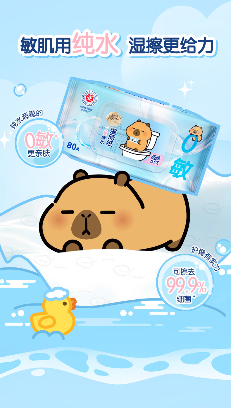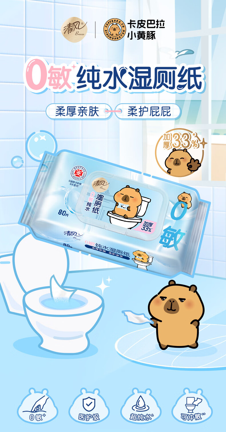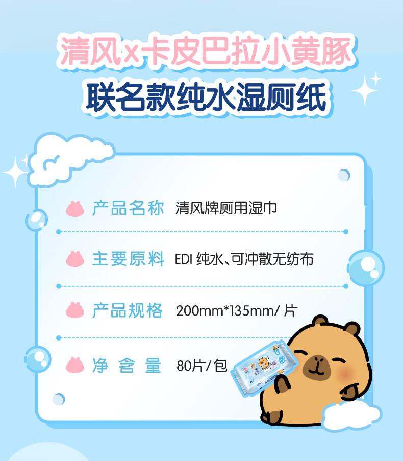 【清风X卡皮巴拉联名款】清风纯水湿厕纸 80片5包