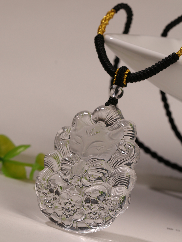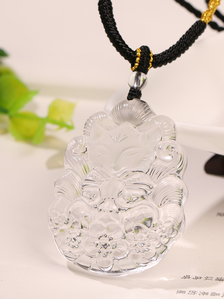 天然白水晶狐狸吊坠精雕桃花九尾狐项链挂件