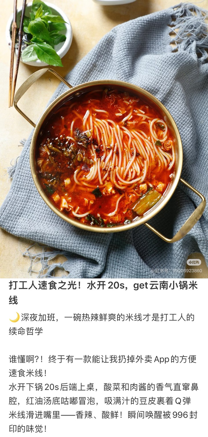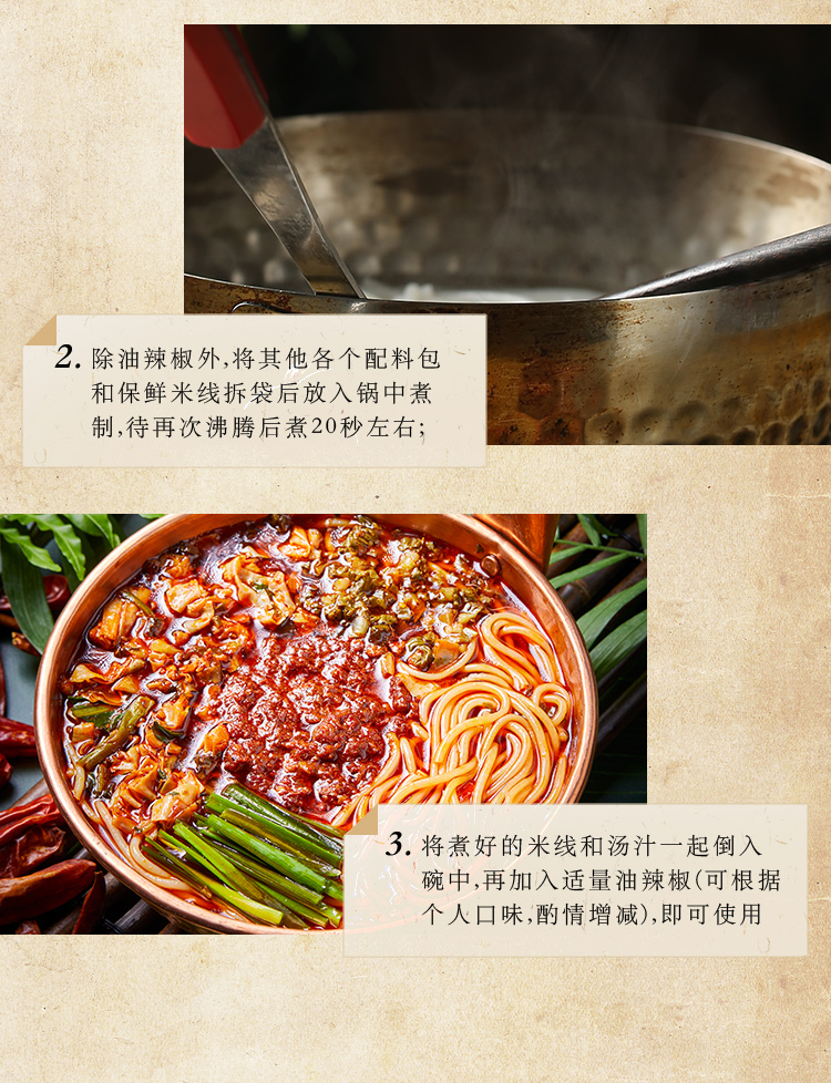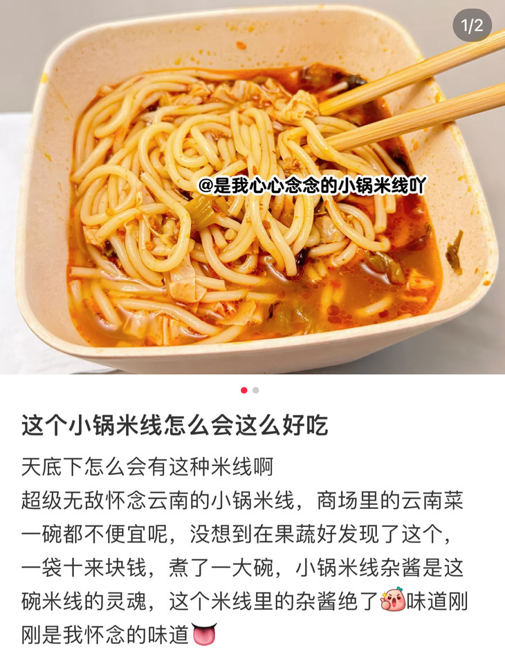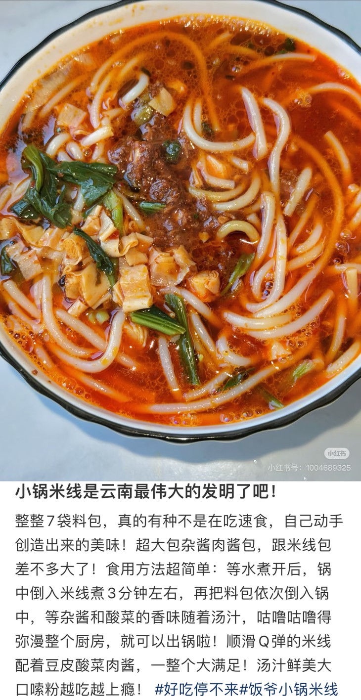 云南小锅米线的做法也很简单。先取450毫升水烧开,再将除辣椒油外的其余配料包连同保鲜米线一同下锅,让食材在沸水中充分交融,待再次沸腾后,等待20秒,让滋味彻底渗入米线的每一丝纤维,最后连同浓郁汤汁一起盛入碗中,根据个人偏好加入适量油辣椒就行啦!嗦上一口,酸酸辣辣的滋味在舌尖打转,米线的滑嫩、杂酱的醇厚与酸菜的清爽交织出奇妙层次,豆皮吸饱汤汁,连脱水蔬菜也重新焕发生机,脆嫩得恰到好处!一碗下去,辣劲慢慢在喉咙散开,却被温润的汤底中和,胃里瞬间暖融融!
