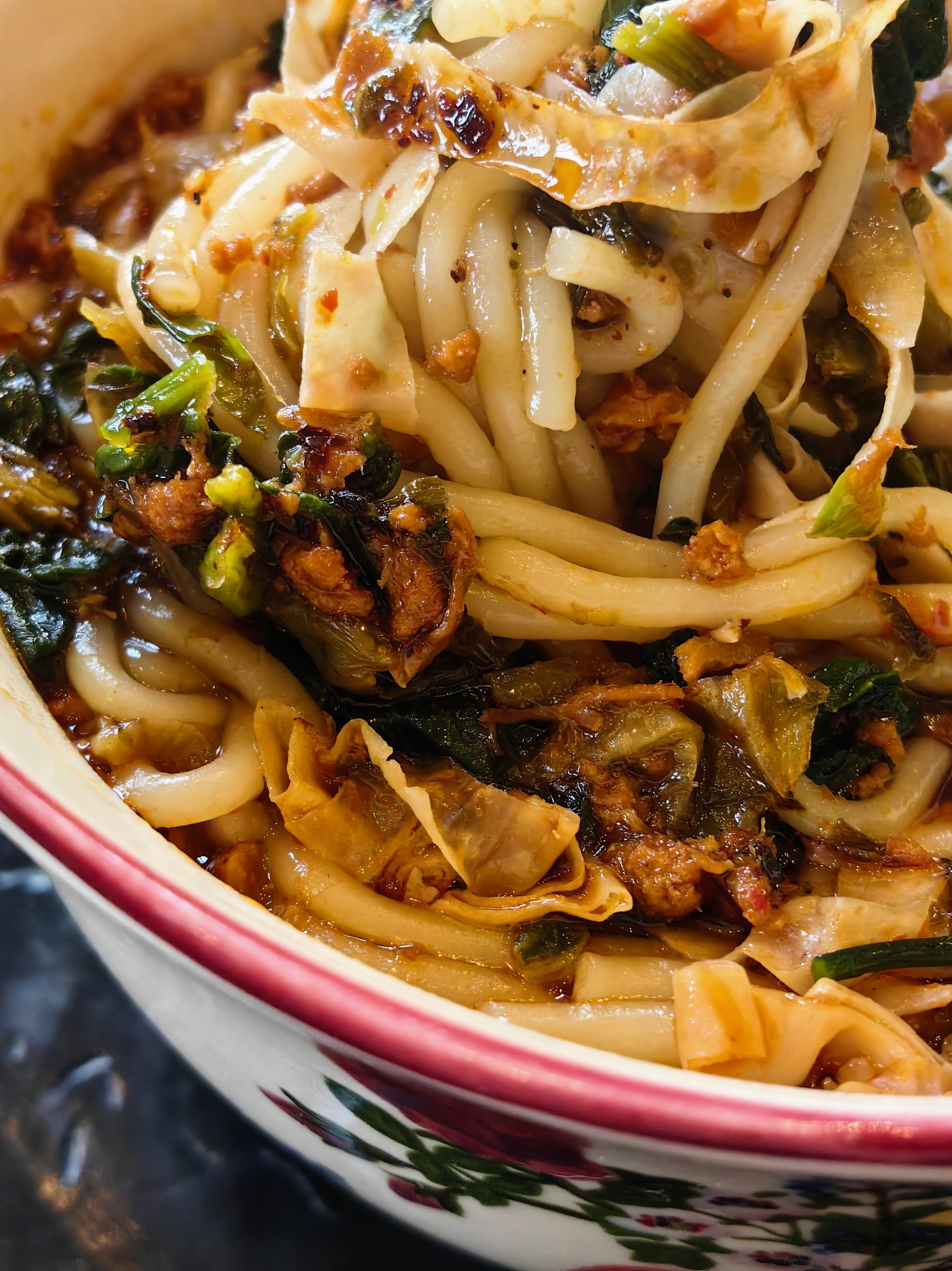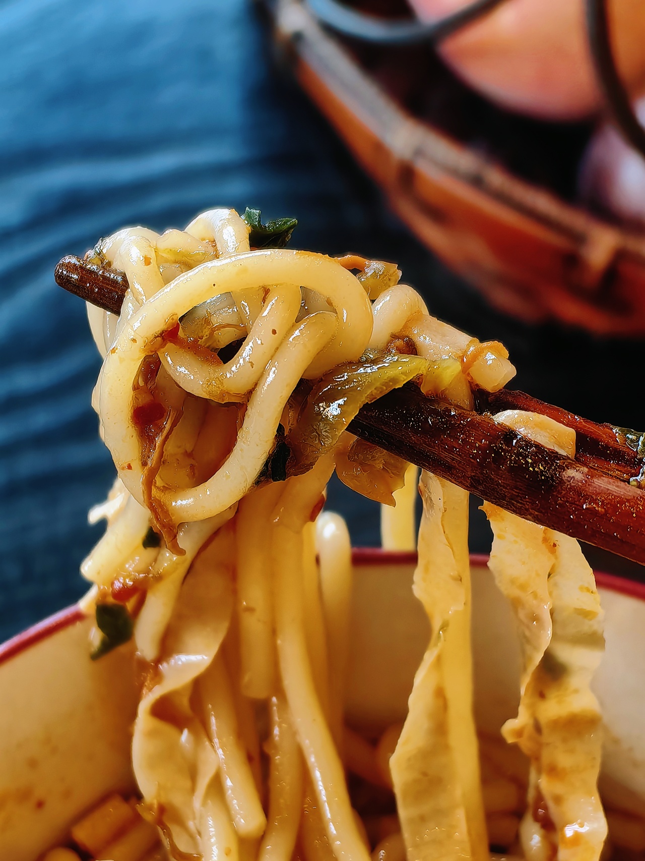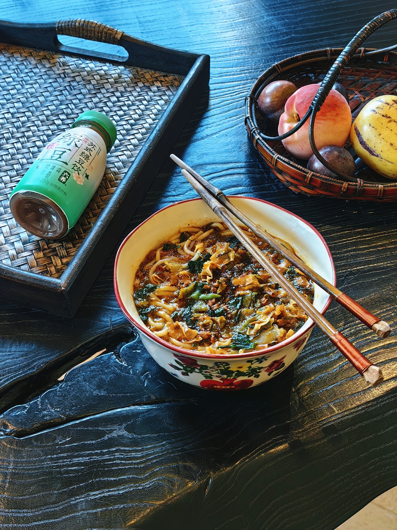 云南小锅米线的做法也很简单。先取450毫升水烧开,再将除辣椒油外的其余配料包连同保鲜米线一同下锅,让食材在沸水中充分交融,待再次沸腾后,等待20秒,让滋味彻底渗入米线的每一丝纤维,最后连同浓郁汤汁一起盛入碗中,根据个人偏好加入适量油辣椒就行啦!嗦上一口,酸酸辣辣的滋味在舌尖打转,米线的滑嫩、杂酱的醇厚与酸菜的清爽交织出奇妙层次,豆皮吸饱汤汁,连脱水蔬菜也重新焕发生机,脆嫩得恰到好处!一碗下去,辣劲慢慢在喉咙散开,却被温润的汤底中和,胃里瞬间暖融融!