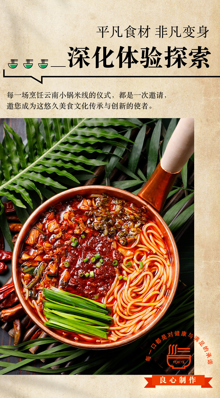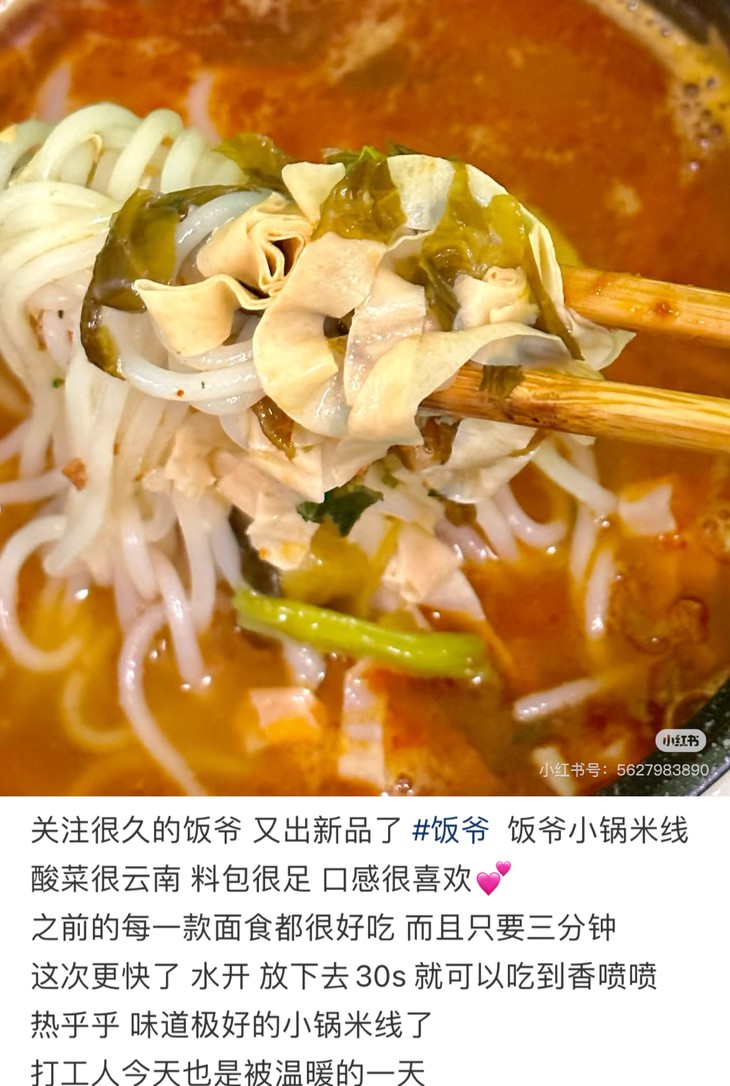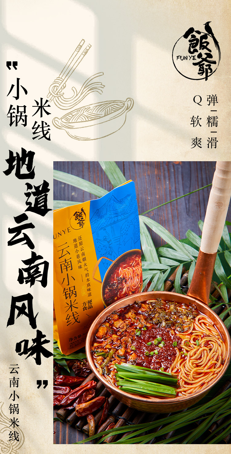 为呈现地道云南风味,饭爷精选多种优质食材,构筑这碗米线的美味基底。杂酱肉酱遵循云南市井小锅米线古法工艺,以多种老酱慢火炒制,开袋瞬间便香气袭人,仿佛置身云南街头米线小馆;特制酸菜选用新鲜芥菜腌制,脆嫩口感中带着恰到好处的酸爽,一口便能唤醒沉睡的食欲;云南丘北辣椒制成的油辣椒包、云南豆皮以及新鲜脱水蔬菜,更为这碗米线增添丰富层次!