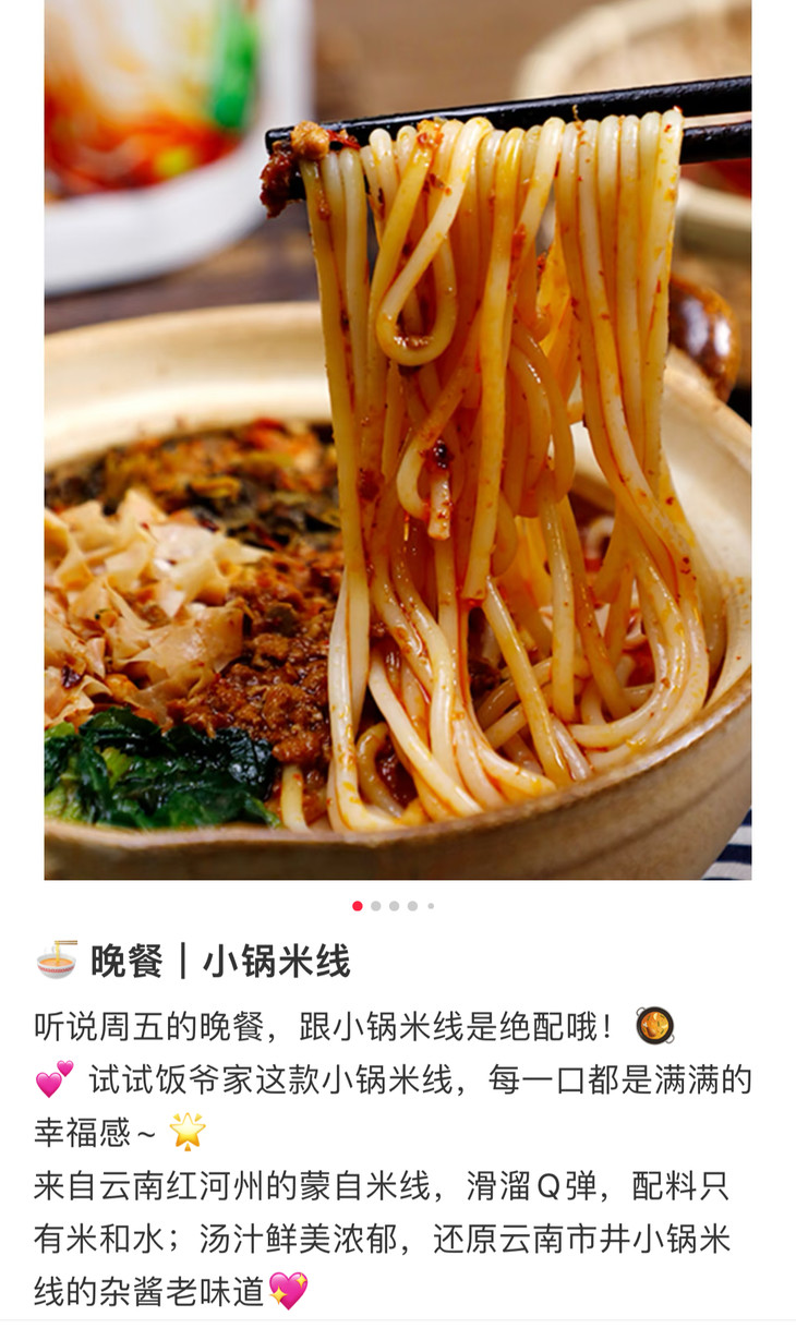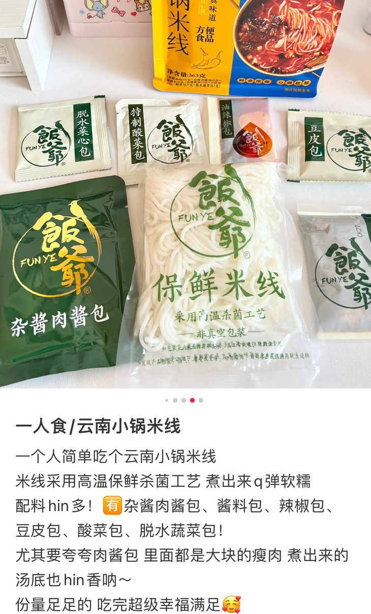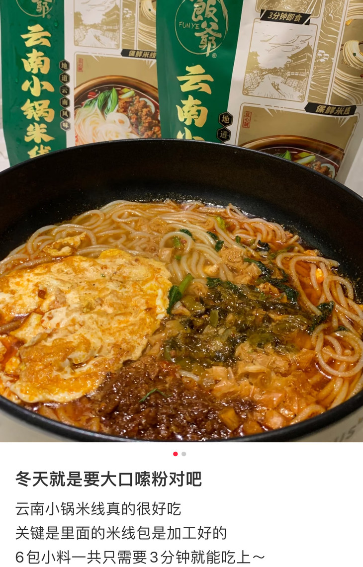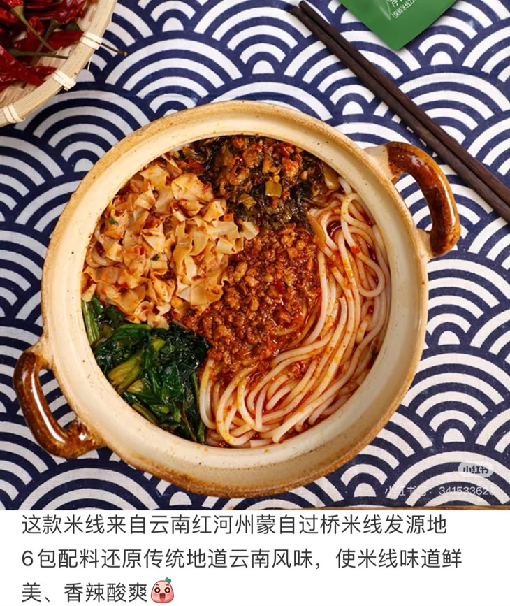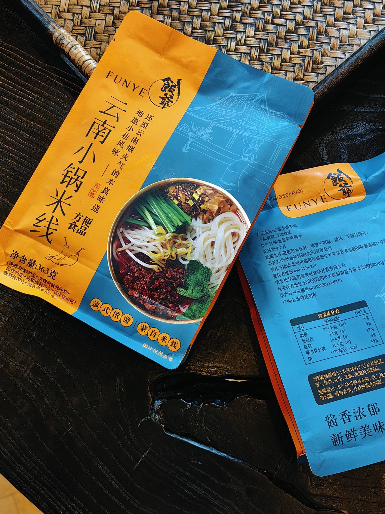饭爷送来一箱样品,选了两款,上一上!三味浓素面酱,是他家的经典小酱,一口入魂,虽然是素的,料多且大,拌面拌饭非常满足!还有云南小锅米线,也是好还原,汤底醇,肉酱香,连脱水蔬菜都很大颗,是不用出门就能品尝到的地道云南风味!