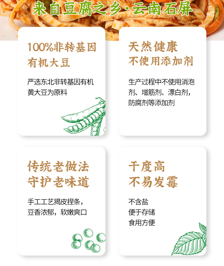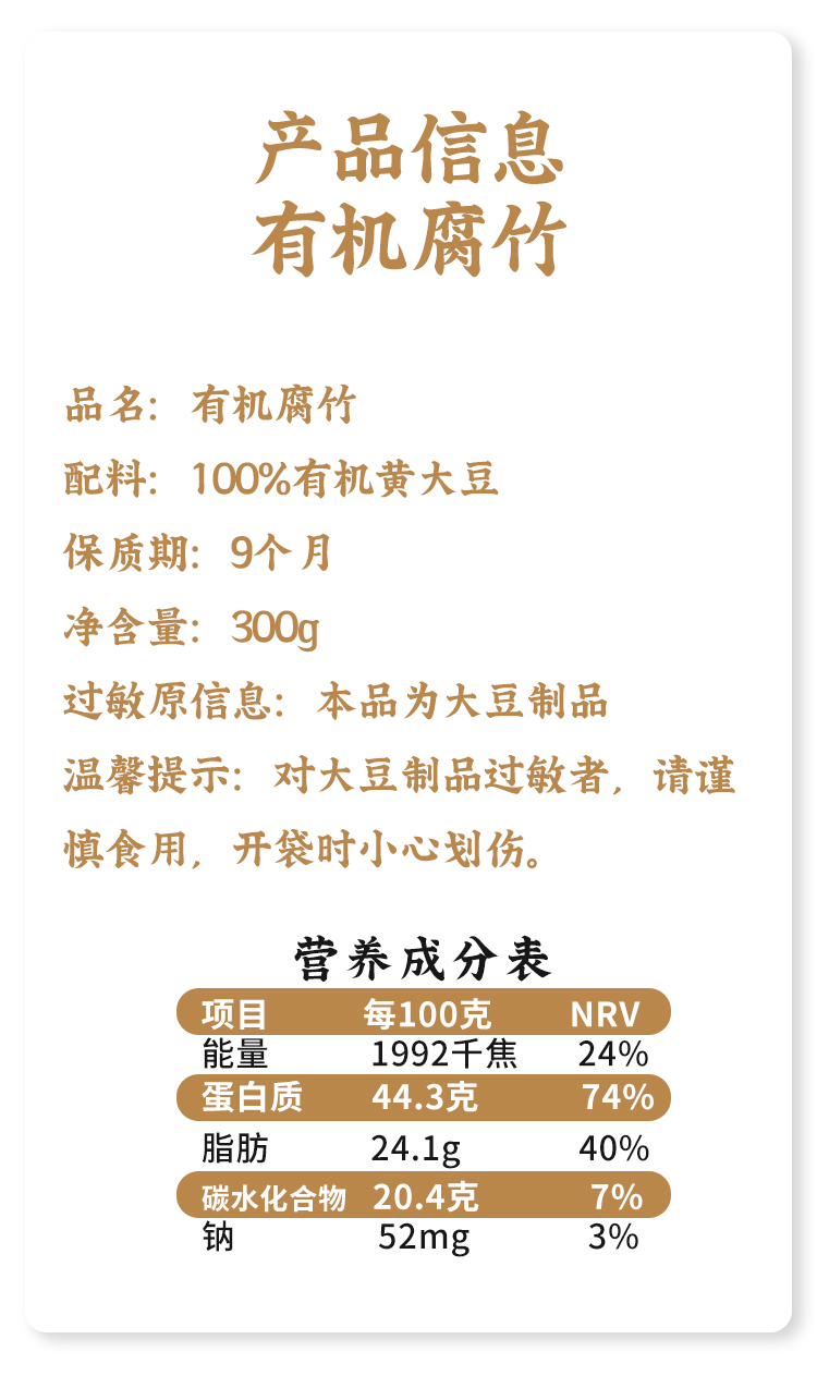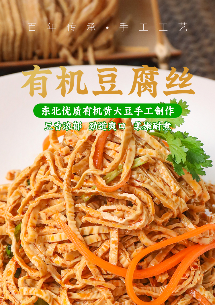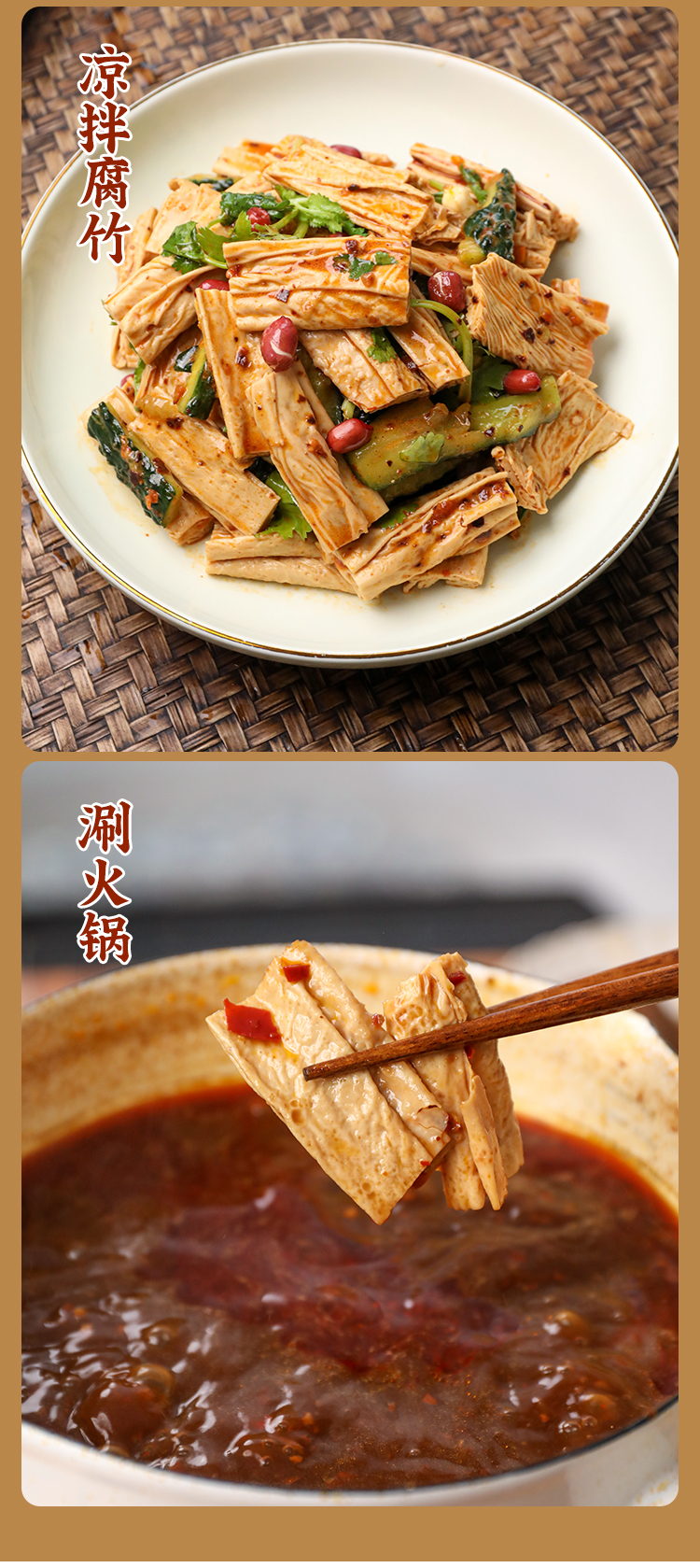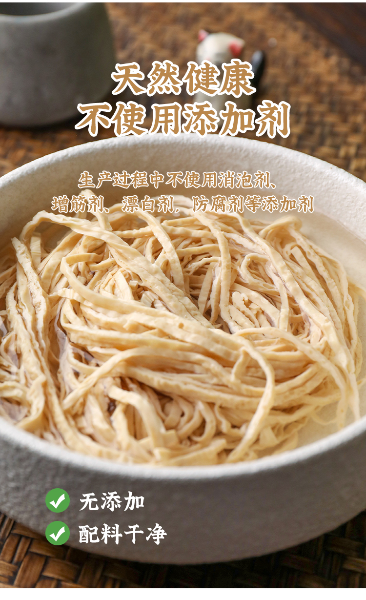 有机豆皮、腐竹、豆腐丝制作工艺近似,只是最终切割晾晒成不同的形态。豆皮适合涮火锅,豆腐丝适合凉拌,腐竹最筋道适合红烧。
