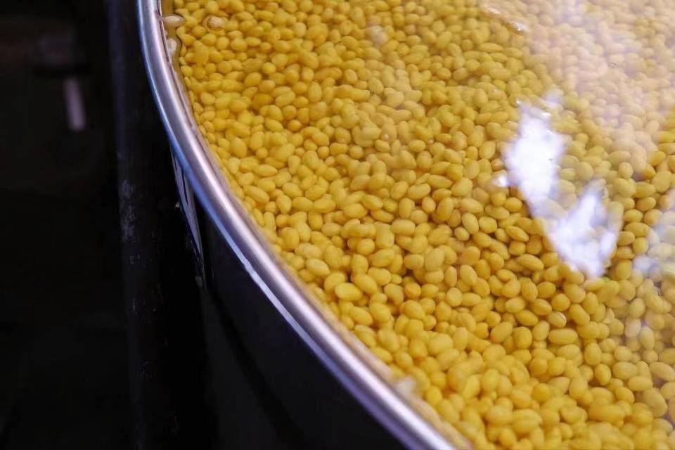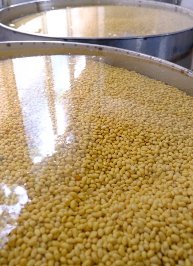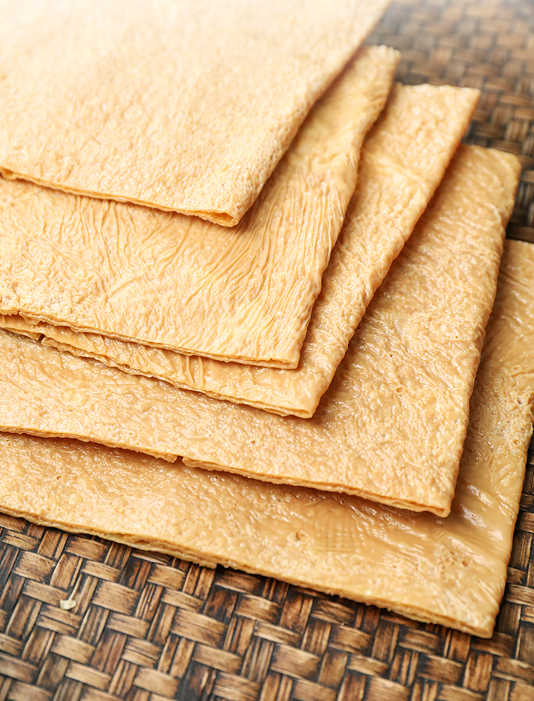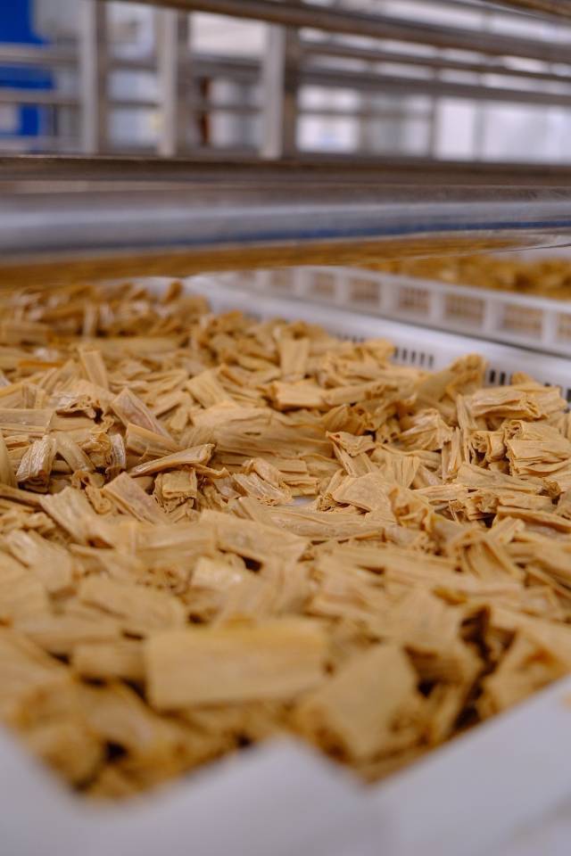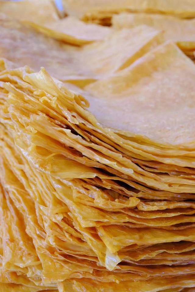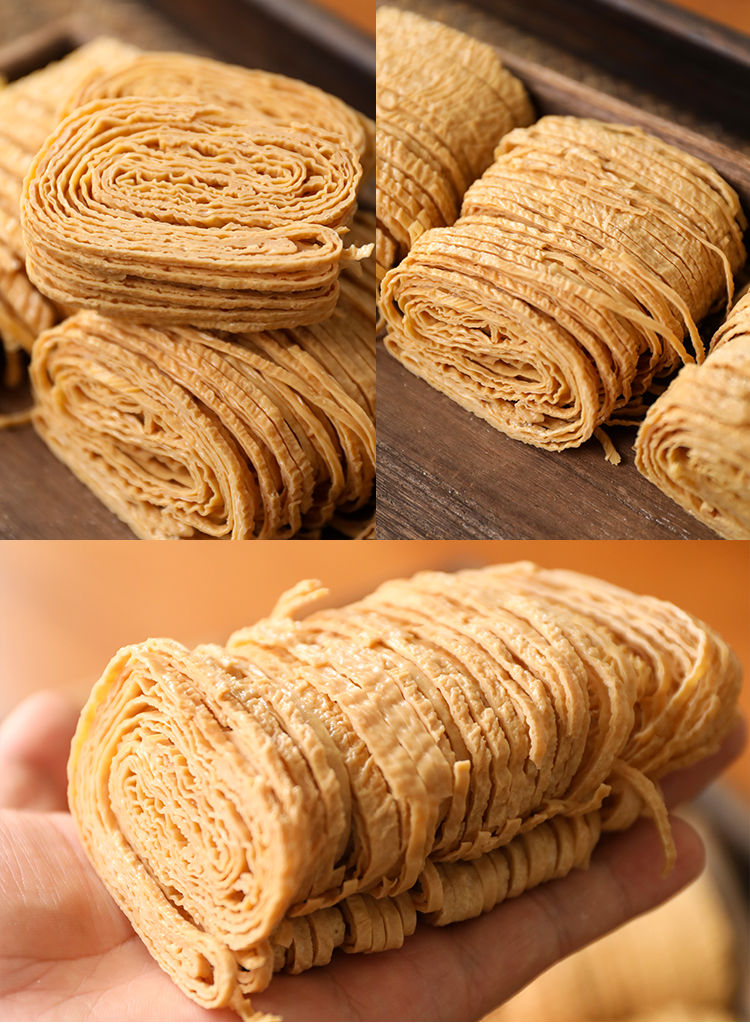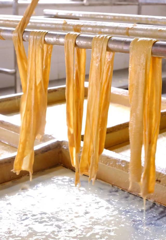 精选当年东北有机黄豆,没有陈年黄豆,更没有转基因大豆。泡豆磨浆,再过滤出豆渣,把滤好的豆浆倒入豆皮模具里,用蒸汽加热二十分钟左右,待豆浆表层慢慢自然凝结。看到豆浆表层已经自然凝结为豆皮,师傅们迅速把一张张的豆皮取出,在当地这个步骤被称作“起皮”。