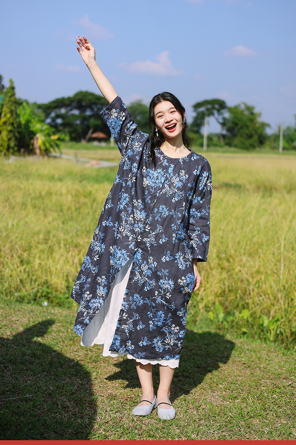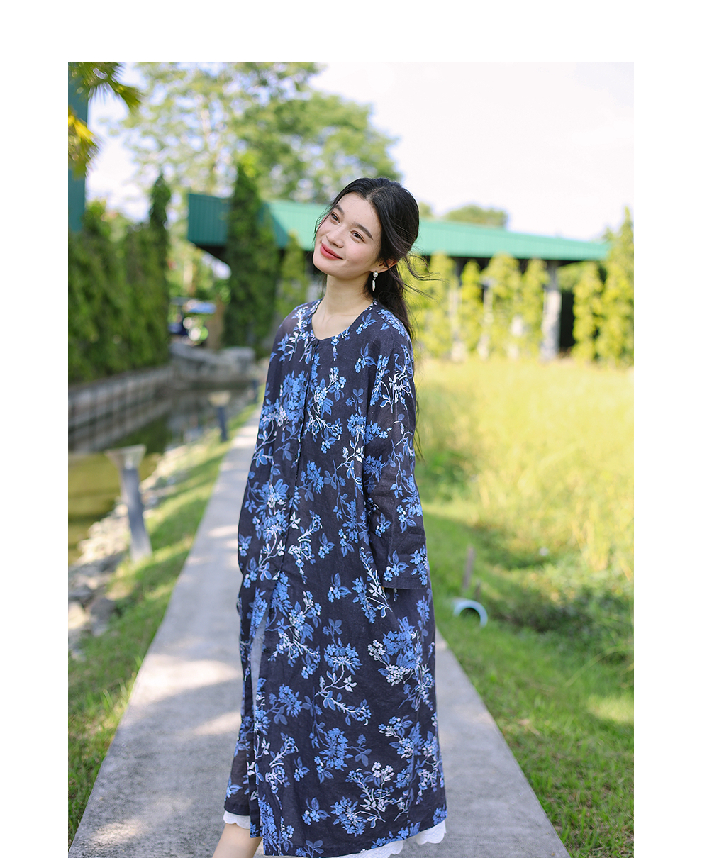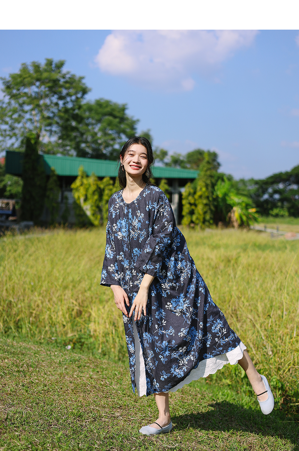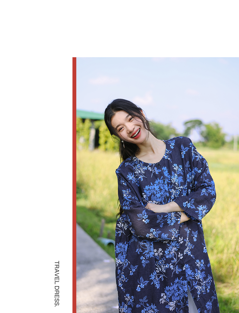 绽放旅行女装078朵/小蓝花连衣裙亚麻藤曼花团印花圆领开门襟袍子