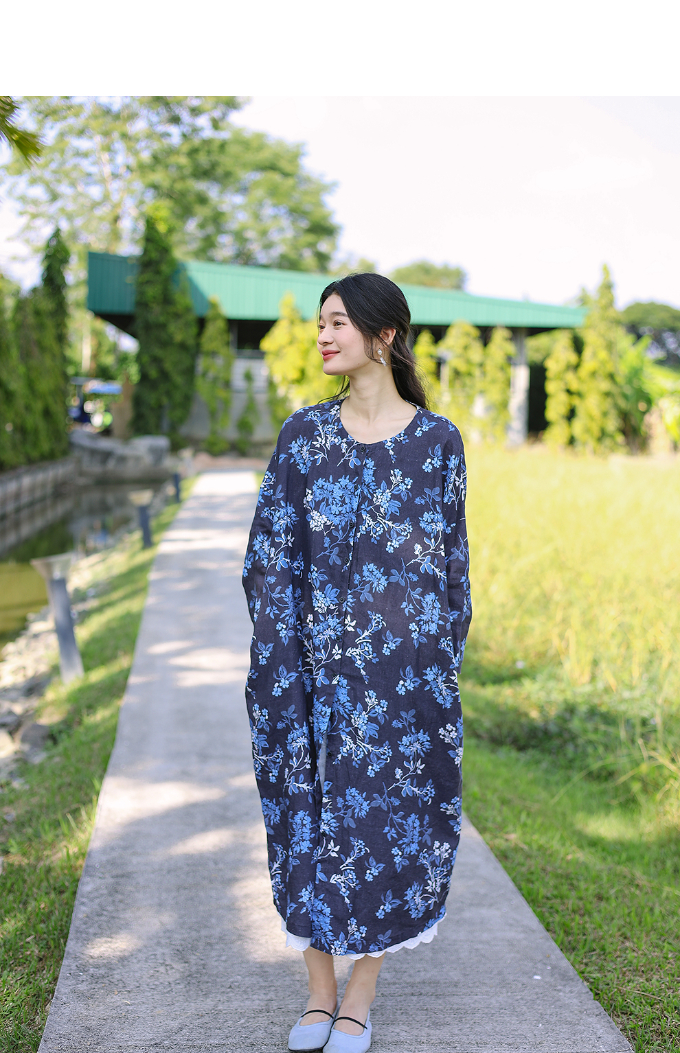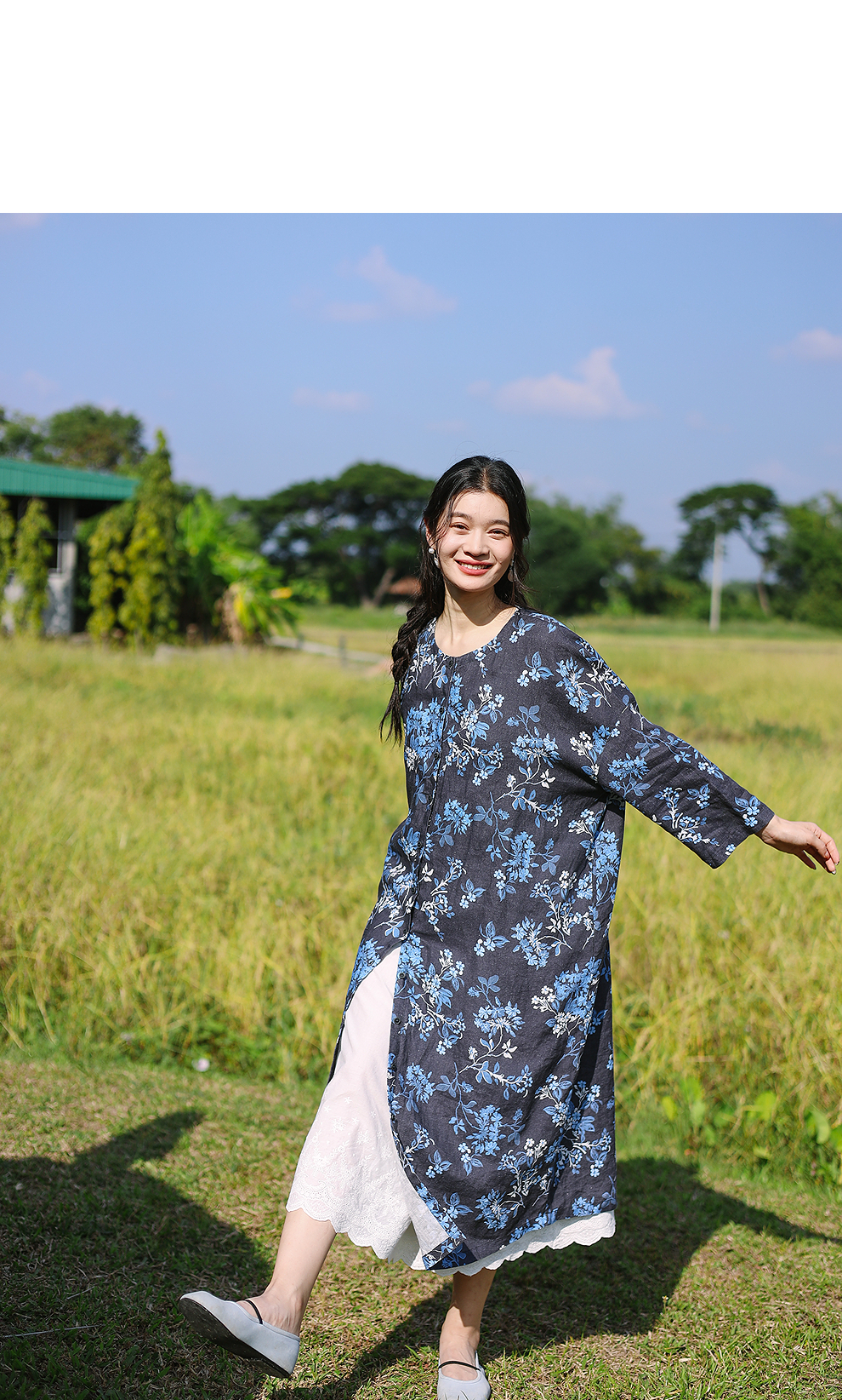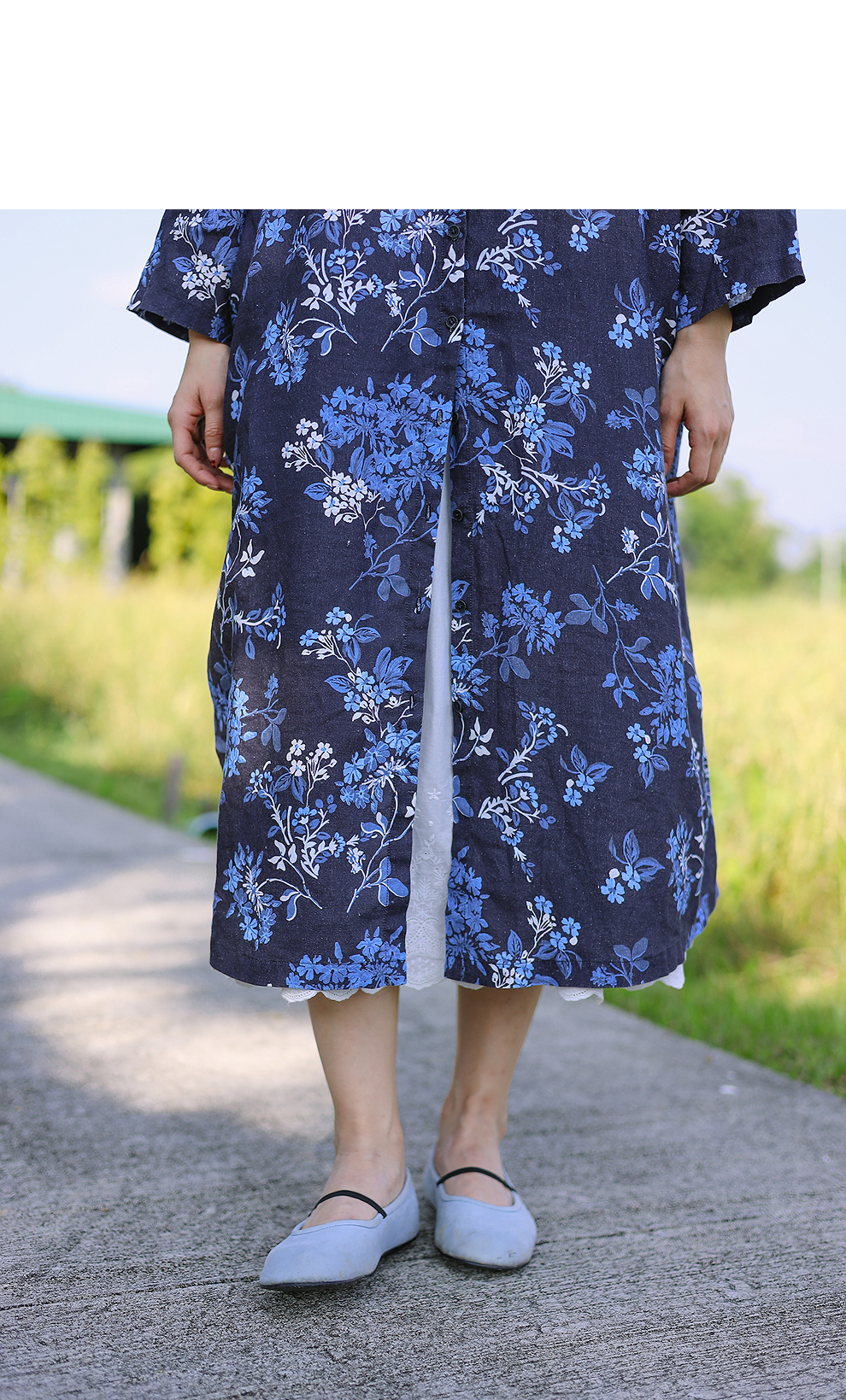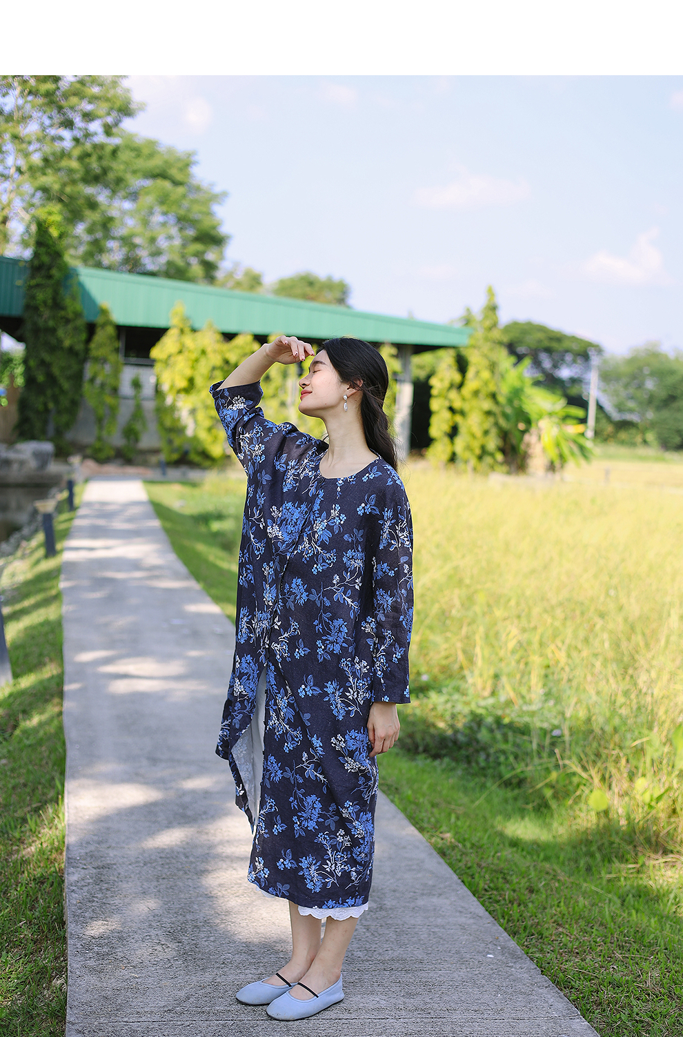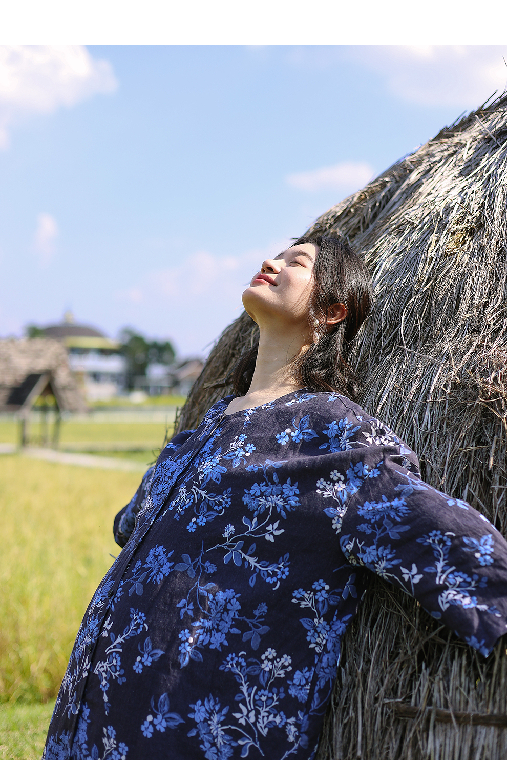 绽放旅行女装078朵/小蓝花连衣裙亚麻藤曼花团印花圆领开门襟袍子