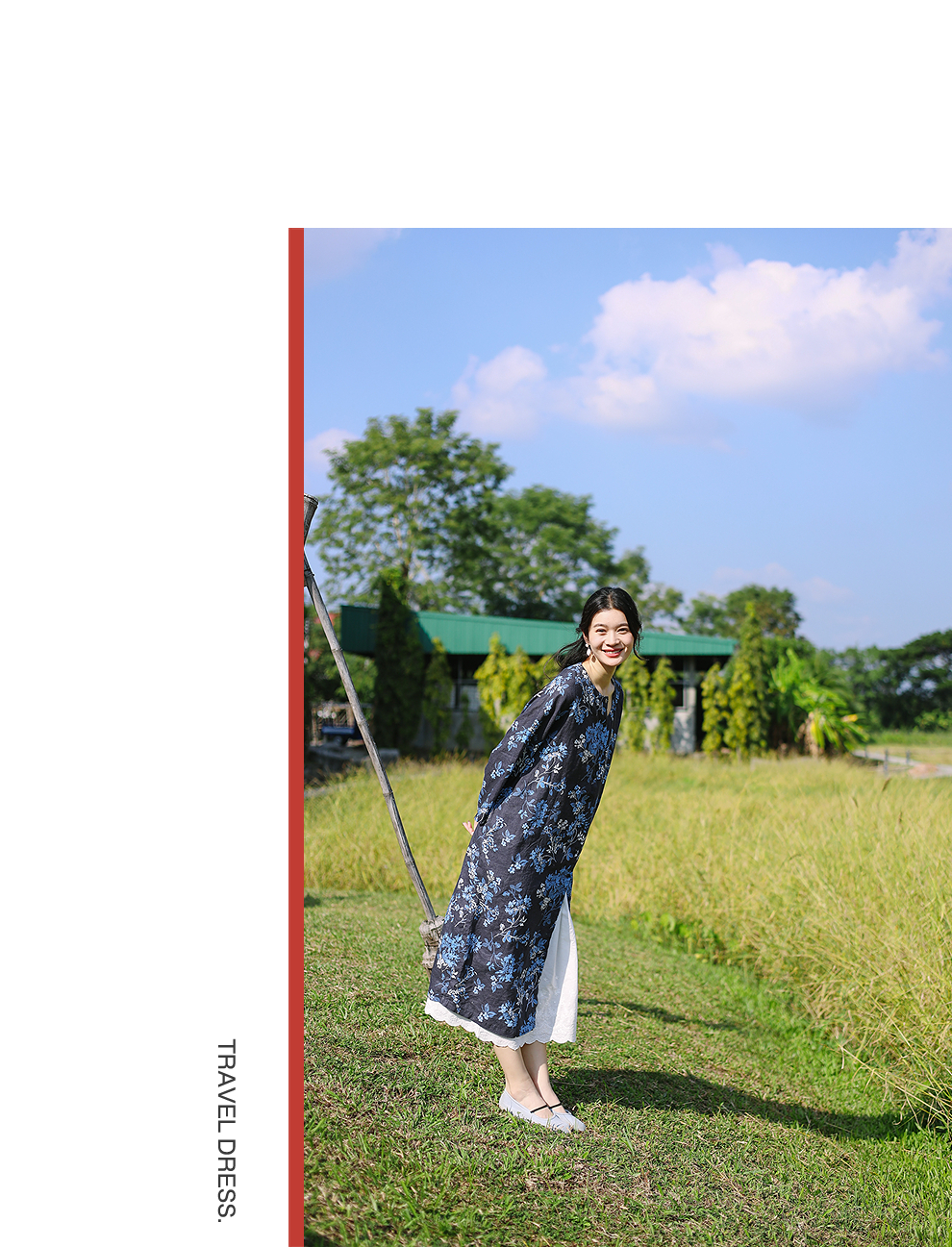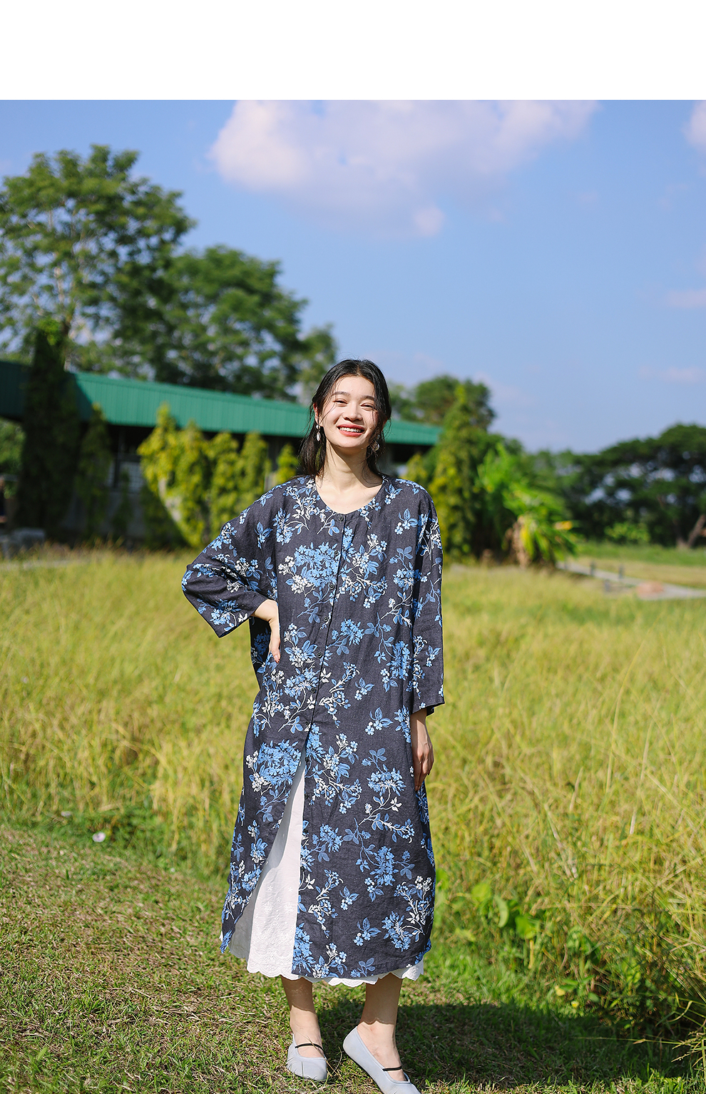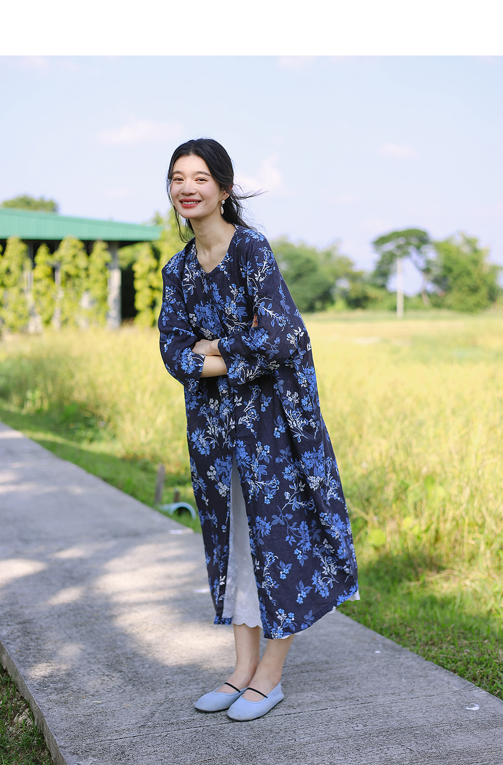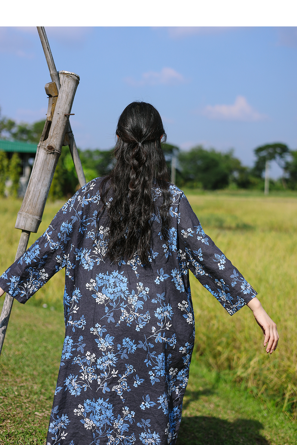 绽放旅行女装078朵/小蓝花连衣裙亚麻藤曼花团印花圆领开门襟袍子