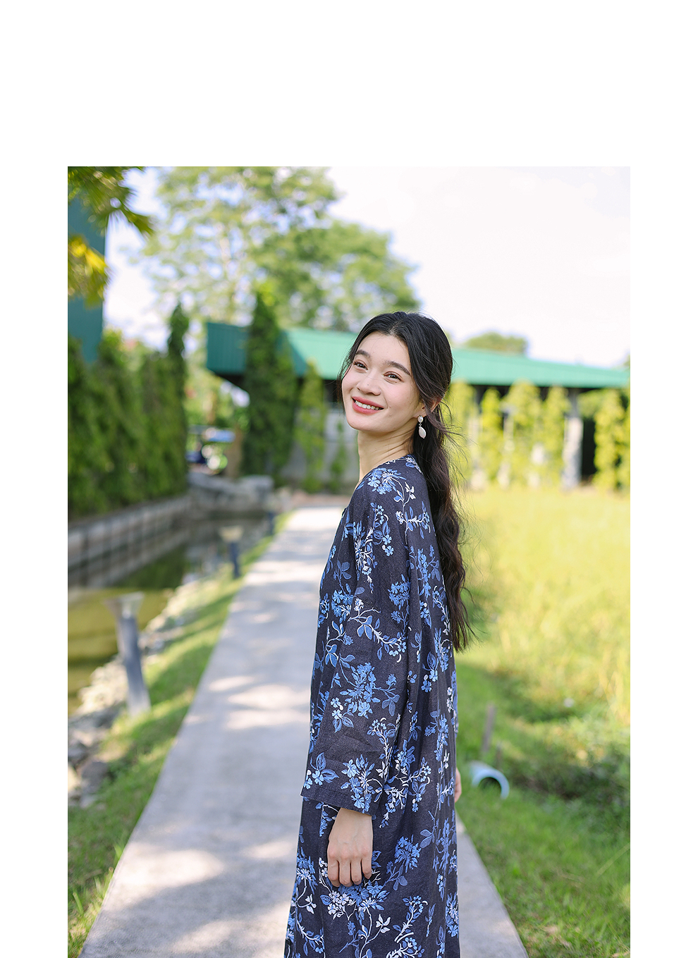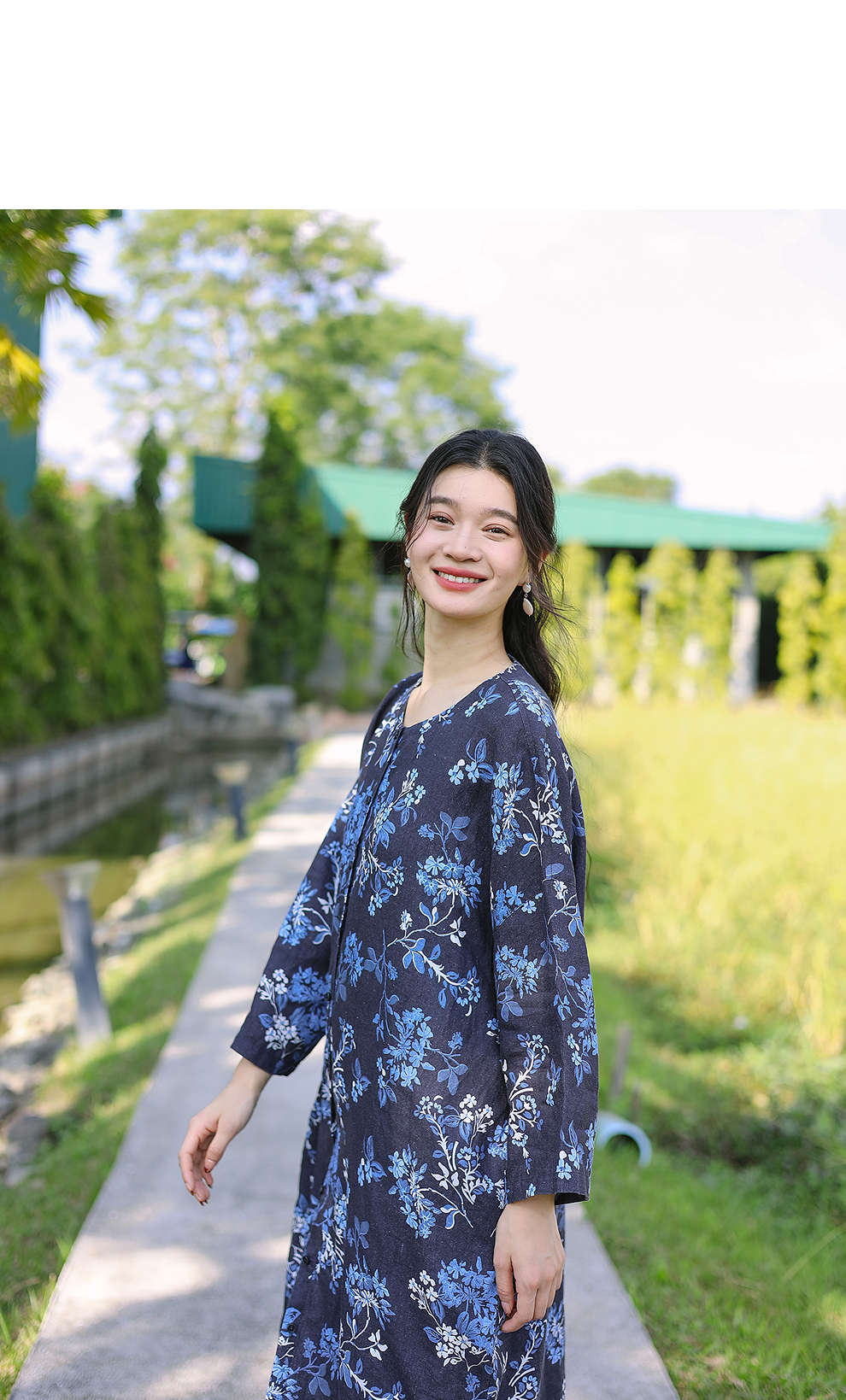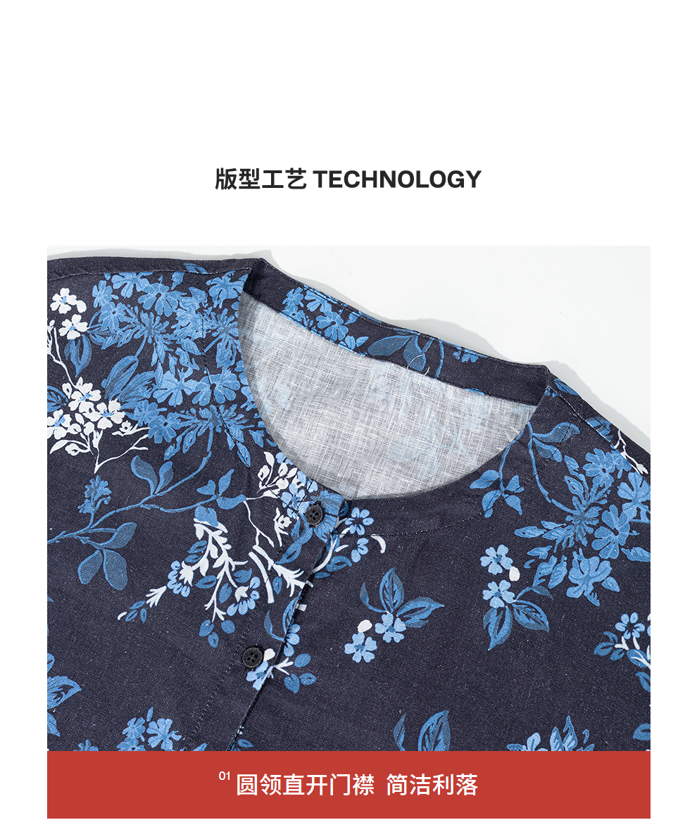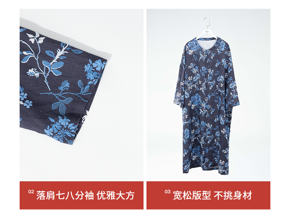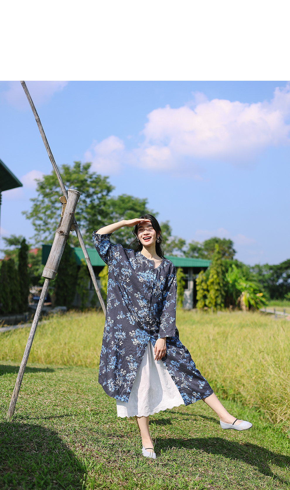 绽放旅行女装078朵/小蓝花连衣裙亚麻藤曼花团印花圆领开门襟袍子