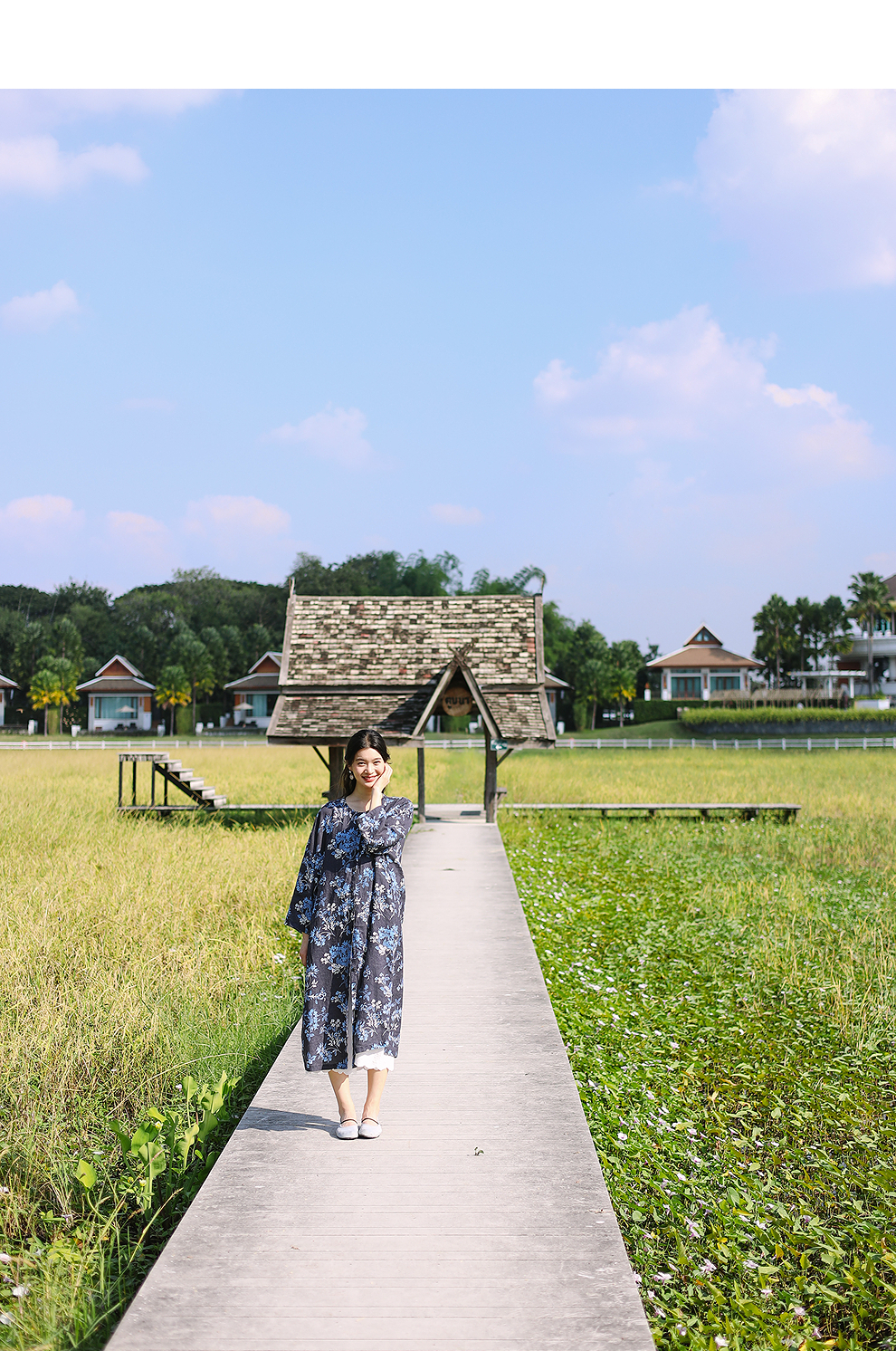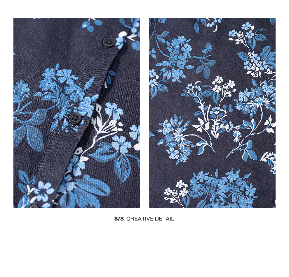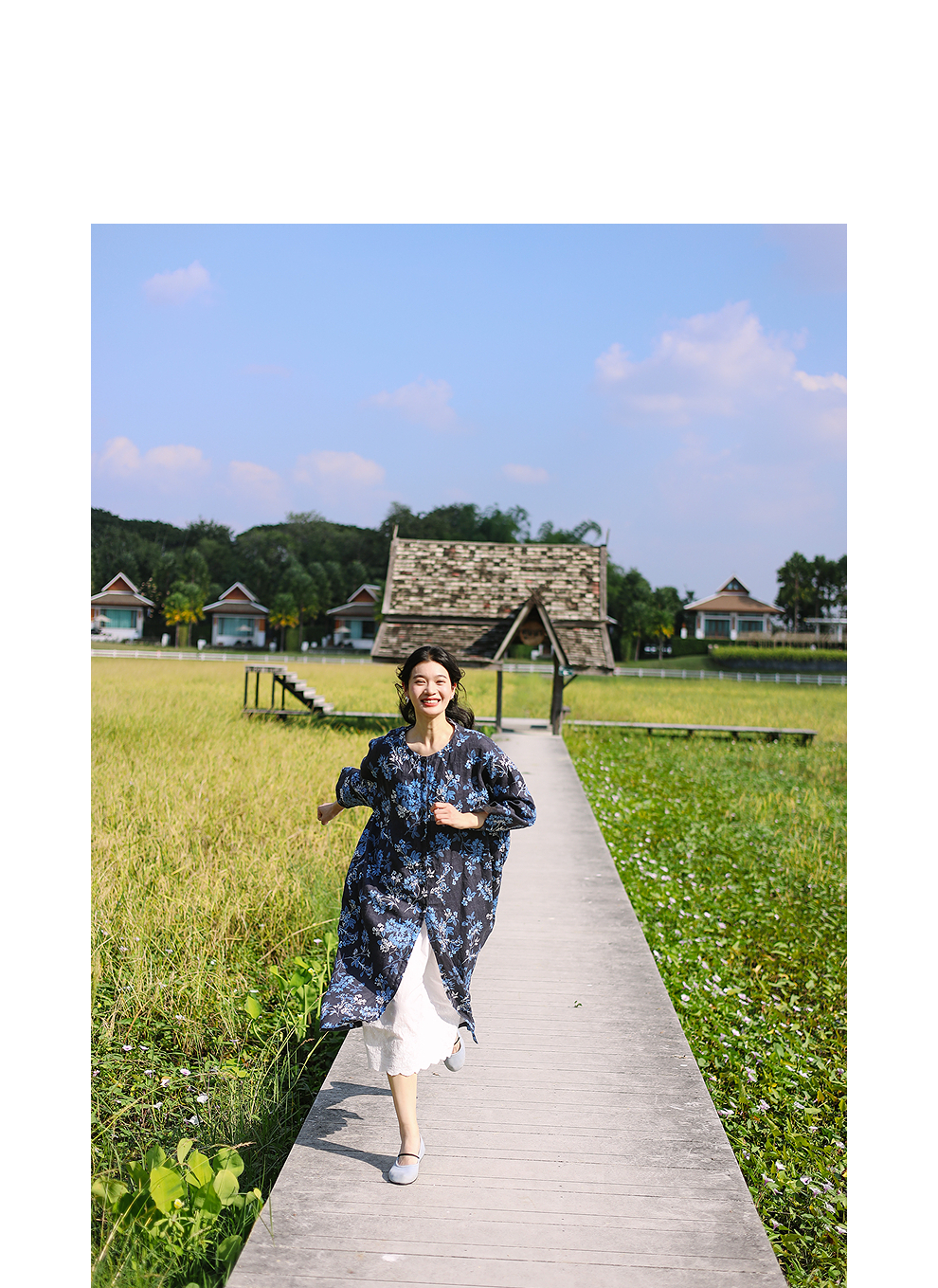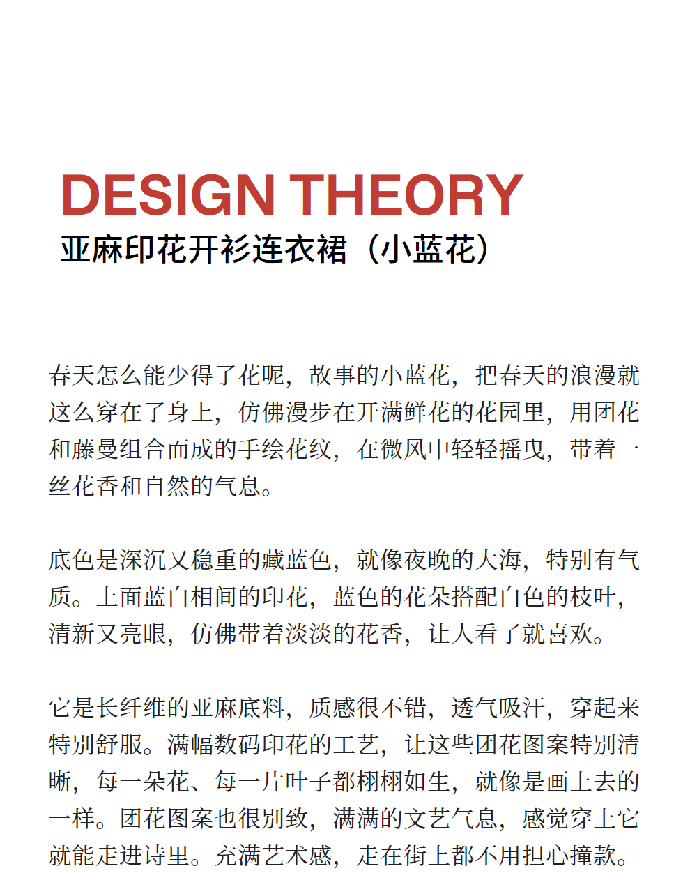 绽放旅行女装078朵/小蓝花连衣裙亚麻藤曼花团印花圆领开门襟袍子