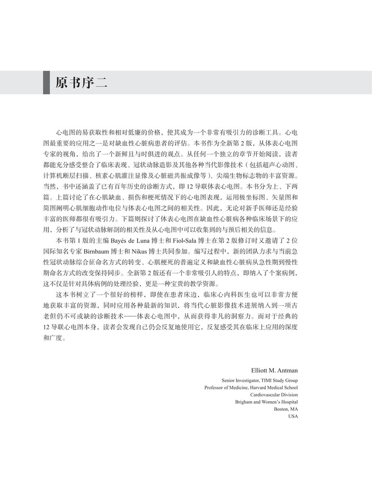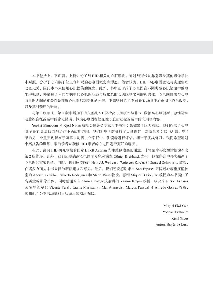 Electrocardiography in Ischemic Heart Disease: Clinical and Imaging Correlations and Prognostic Implications, 2e 是该领域的一部经典著作,初版由世界著名心电图学大师Antoni Bayés de Luna 和Miguel Fiol-Sala 教授共同编写,此次修订再版又邀请了2 位国际知名心电学专家Yochai Birnbaum 和Kjell Nikus 教授一起参与,再次为心电图在缺血性心脏病的诊断、监测和管理方面的卓越表现正名。将心电图与心脏解剖结构及多种影像学结果进行相互印证是本书的特色之一,除此之外,全书各章末均提供个案病例研究供读者进行评估,帮助读者对疑似缺血性心脏病患者的心电图进行更好的解读。