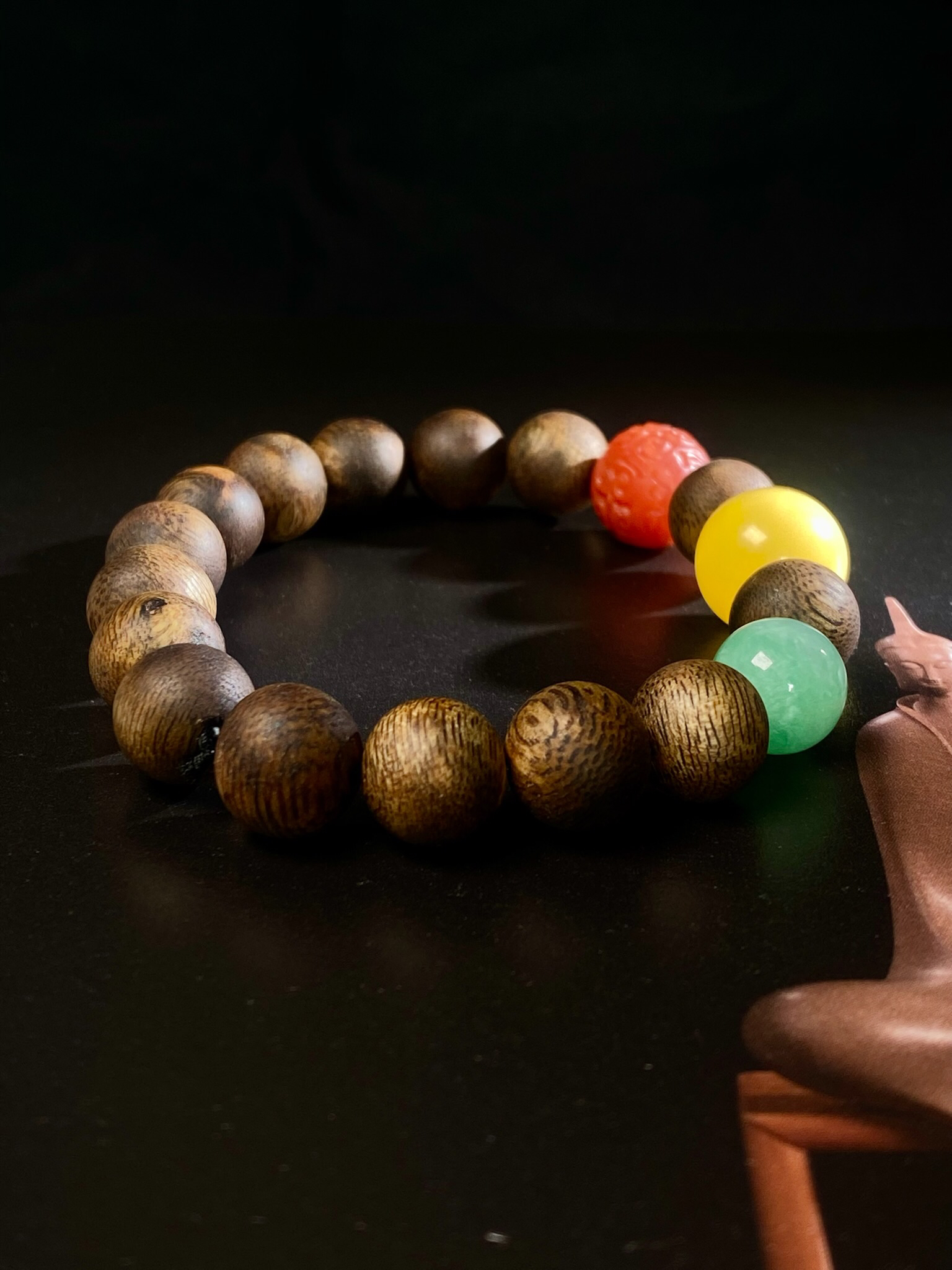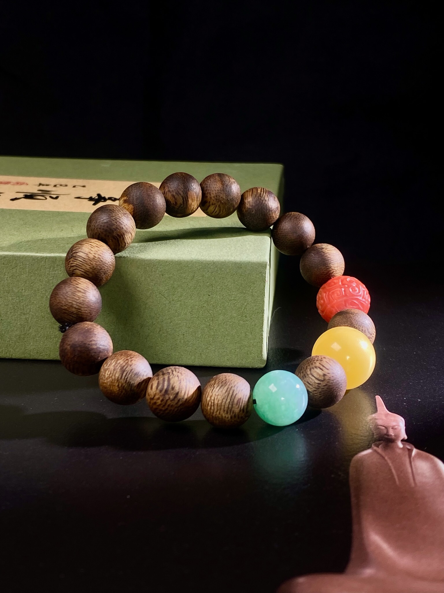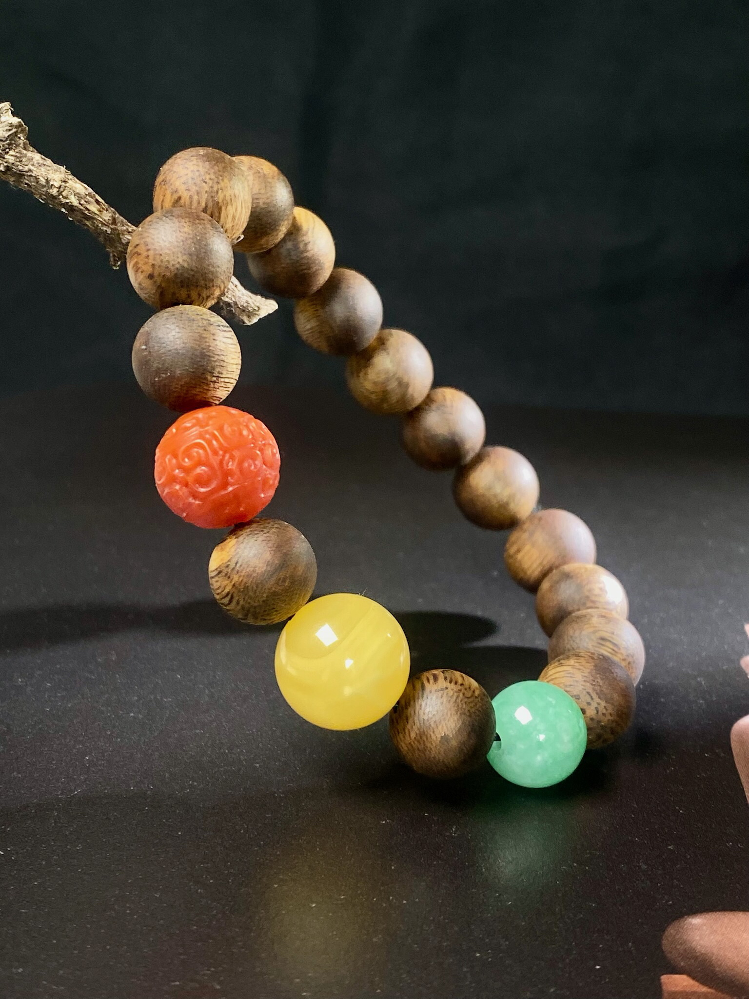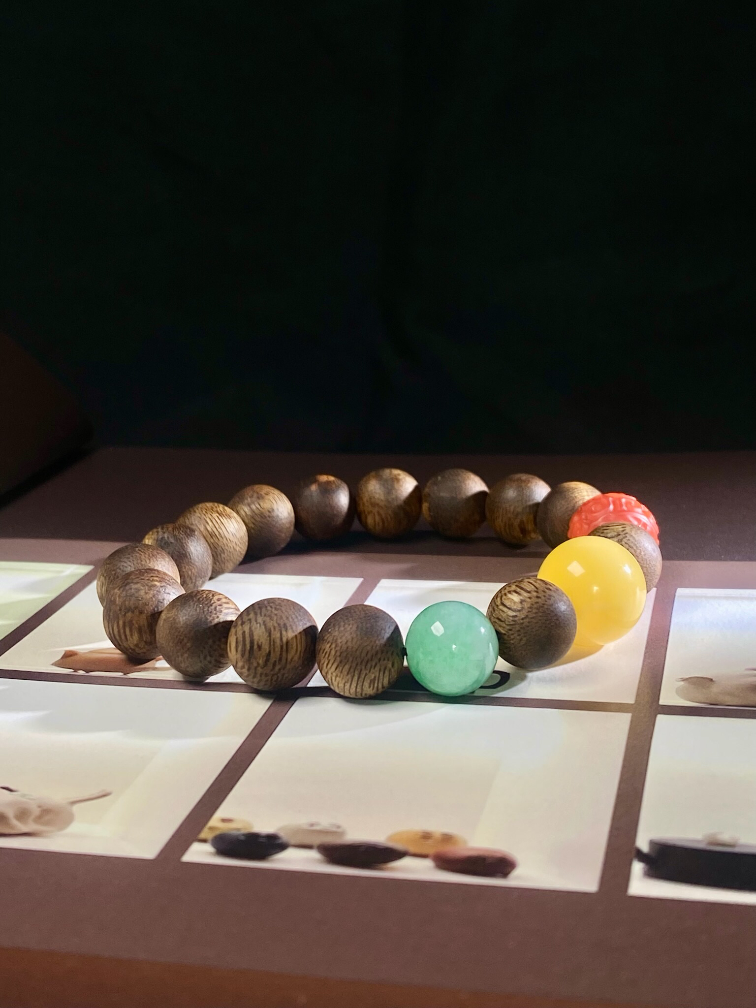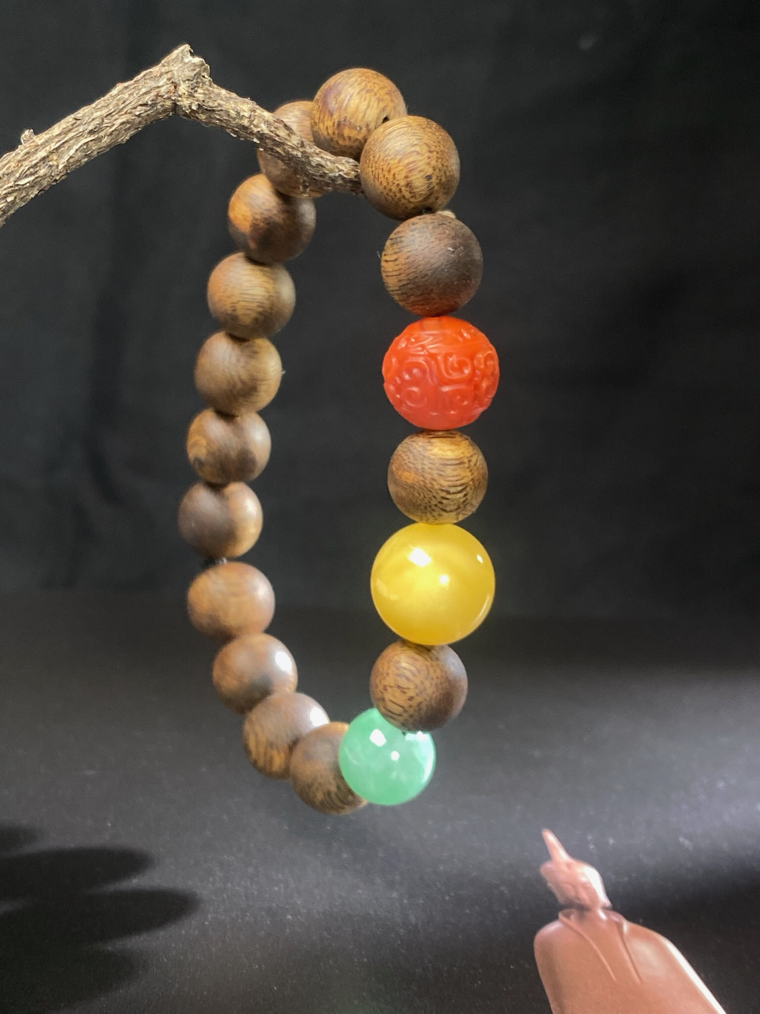 沉香DIY三宝手串,天然沉香圆珠,原色原味,约11mm,蜜蜡圆珠约14mm,南红回纹珠约12mm,晴绿色翡翠圆珠约11mm