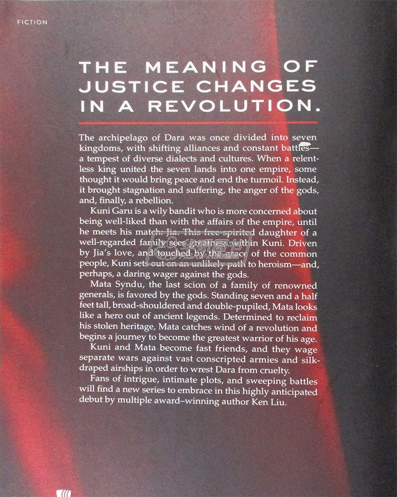 Wily, charming Kuni Garu, a bandit, and stern, fearless Mata Zyndu, the son of a deposed duke, seem like polar opposites. Yet, in the uprising against the emperor, the two quickly become the best of friends after a series of adventures fighting against vast con*ed armies, silk-draped airships, and shape shifting gods. Once the emperor has been overthrown, however, they each find themselves the leader of separate factions—two sides with very different ideas about how the world should be run and the meaning of justice.