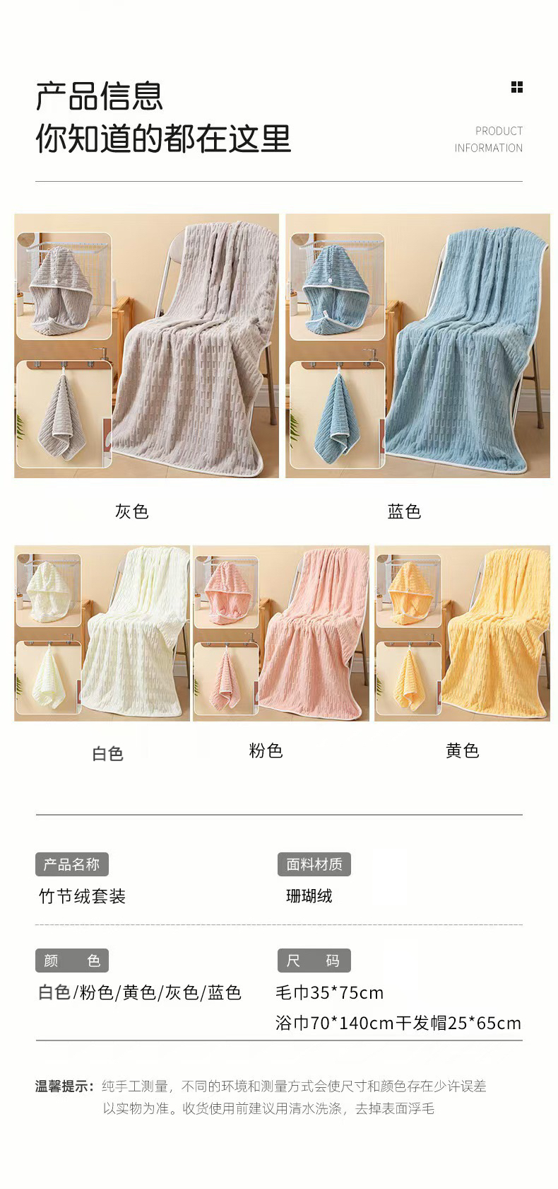 居家好物!【星辰狐--7A竹节珊瑚绒浴巾三件套】(2套=浴巾*2+毛巾*2+干发帽*2)7A抗jun面料A类母婴级别,柔软亲肤吸水性强,透气瞬吸易干,加大加厚不掉色不掉毛絮~