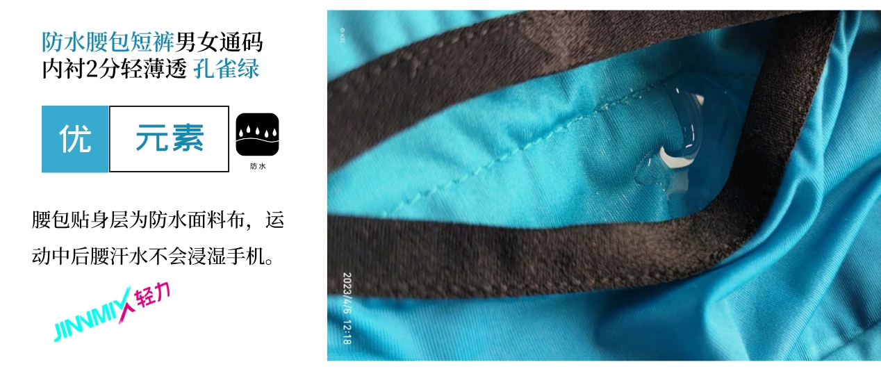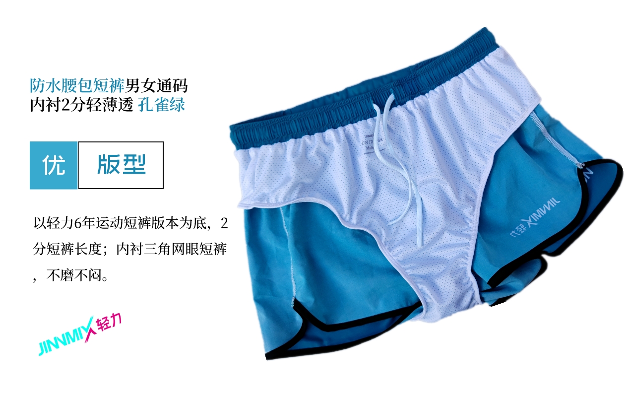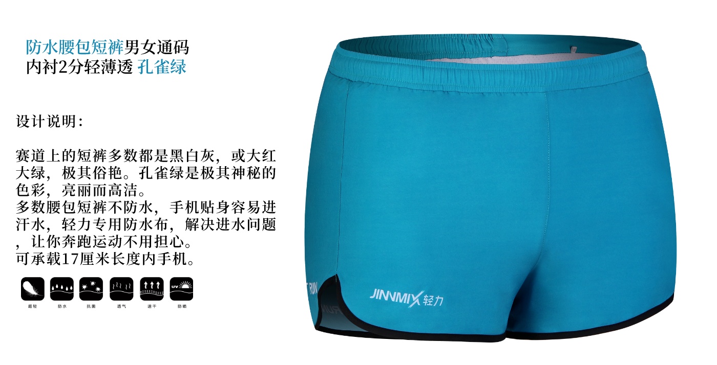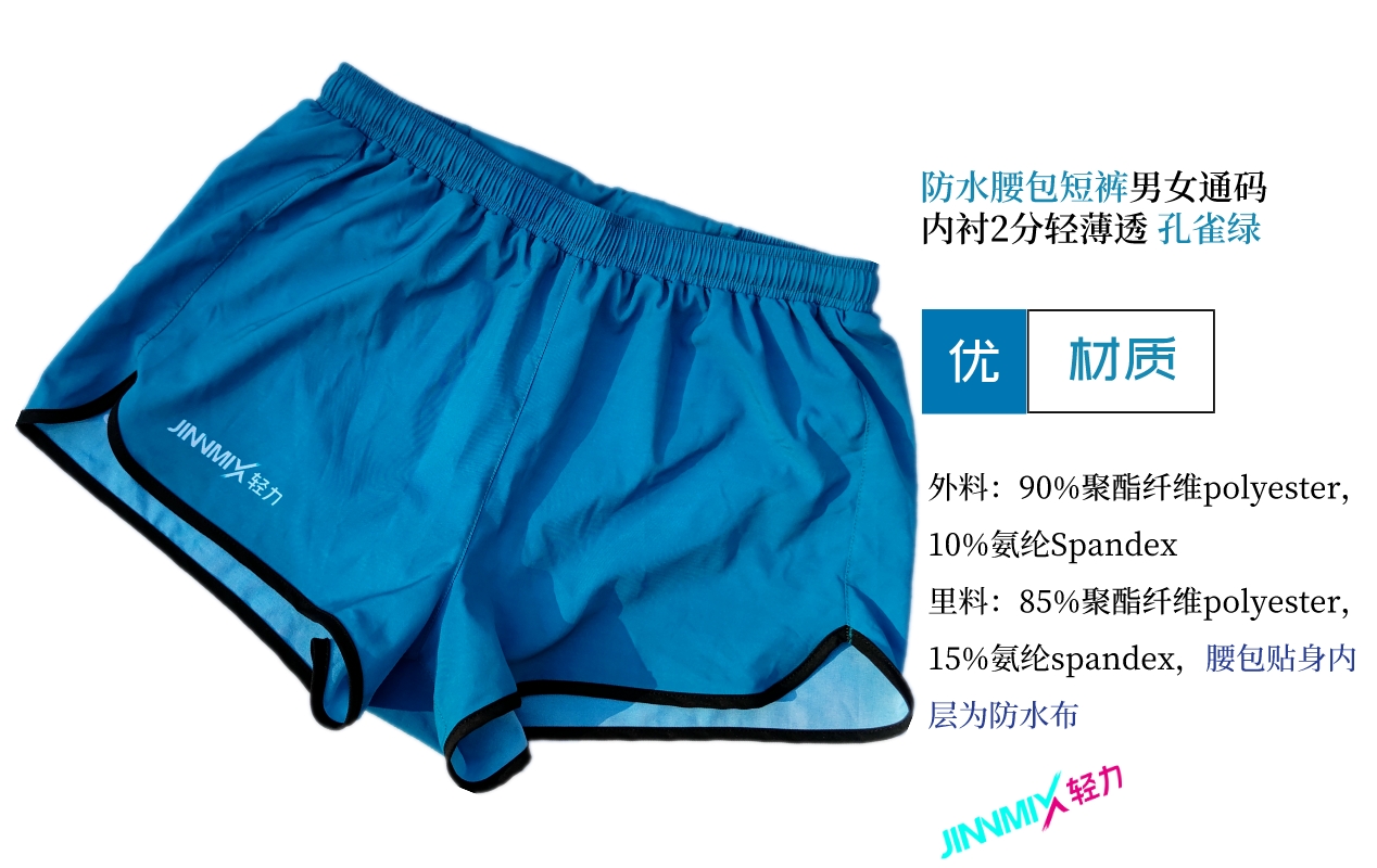 【专业级】JINNMIX轻力防水腰包内衬运动短裤男女通码 孔雀绿