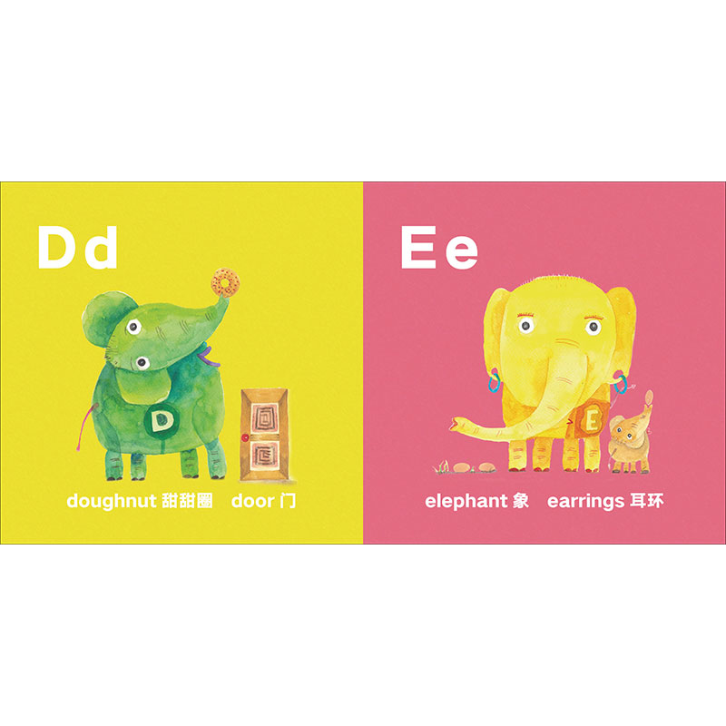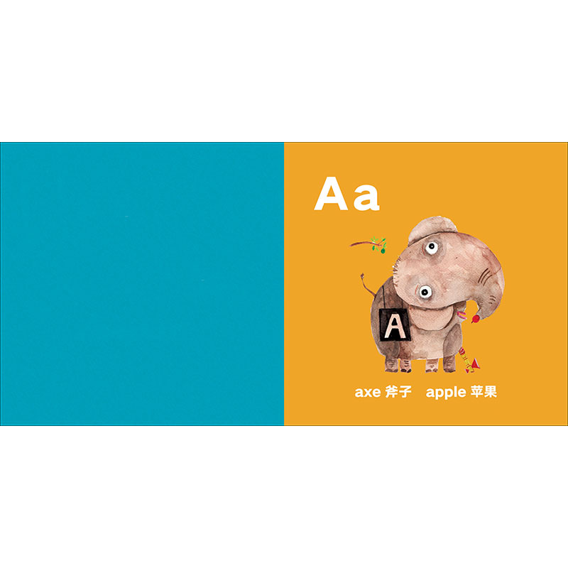 本书是一本创意字母书,通过26个形态各异的大象呈现了26个英文字母。每一页聚焦一个字母,并配有两个以该字母开头的英文单词。作者将英文单词的含义体现在大象身上或其周围。例如,在呈现字母A的那一页,有“Apple”(苹果)和“Axe”(斧子)两个单词,而画面中的大象鼻子卷着一个红苹果,身旁放着一把可爱的斧子。色彩、外形、姿态不停变换的大象,让字母学习变得趣味盎然,也让抽象的字母形象化,便于儿童记忆和应用。