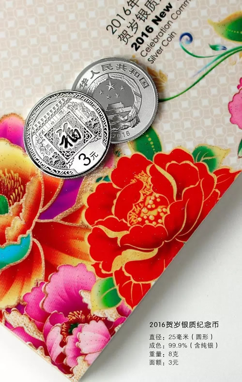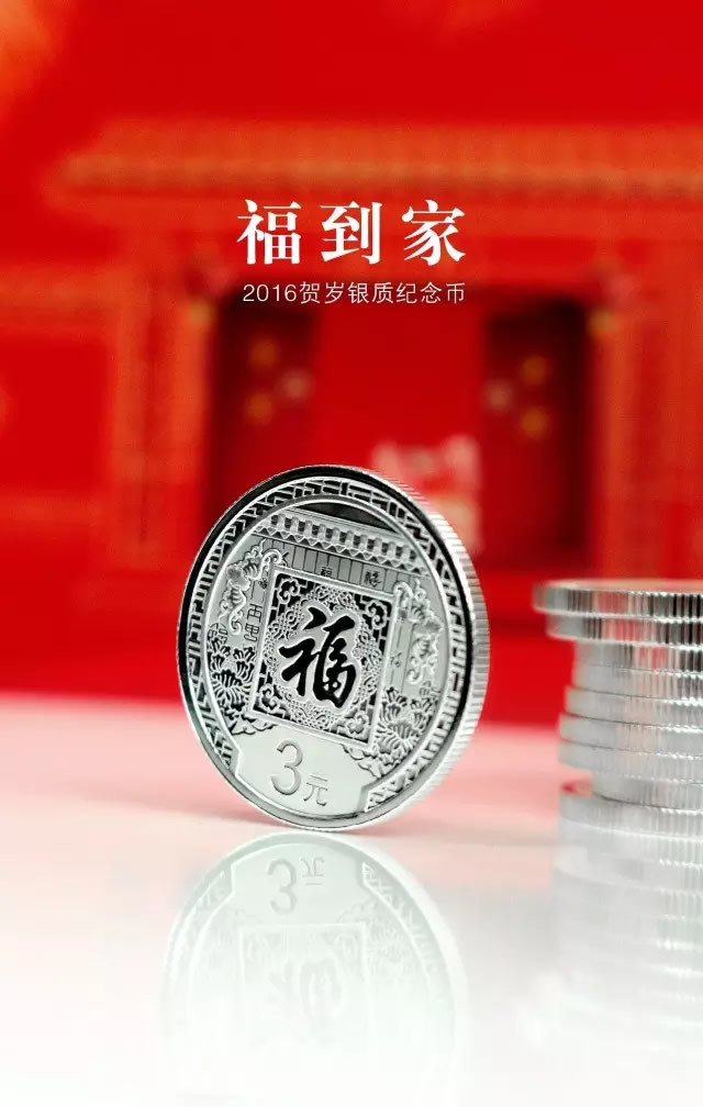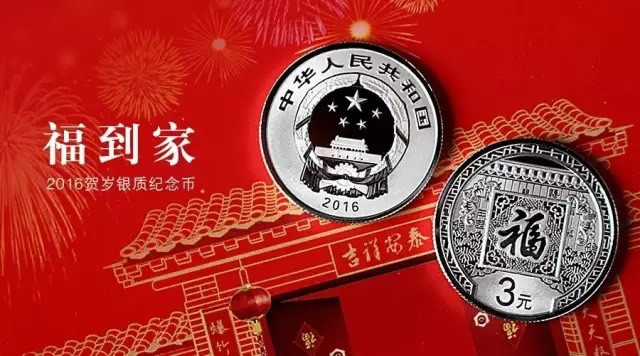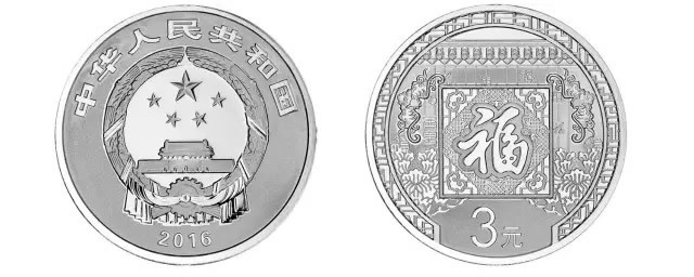 中国人民银行于2015年12月15日发行了2016年贺岁银质纪念币1枚。该枚银质纪念币为中华人民共和国法定货币。正面图案为中华人民共和国国徽,并刊国名、年号。背面图案为“福”字造型,配以月亮门、蝙蝠、牡丹花等装饰图案组合设计,并刊面额。该枚纪念币为普制币,圆形,含纯银8克,直径25毫米,面额3元,成色99.9%,最大发行量190万枚。这就是中国人民银行发行的第二枚福字币。