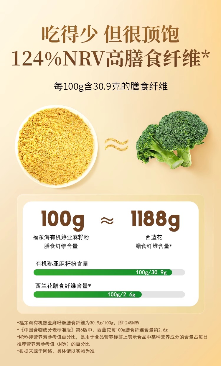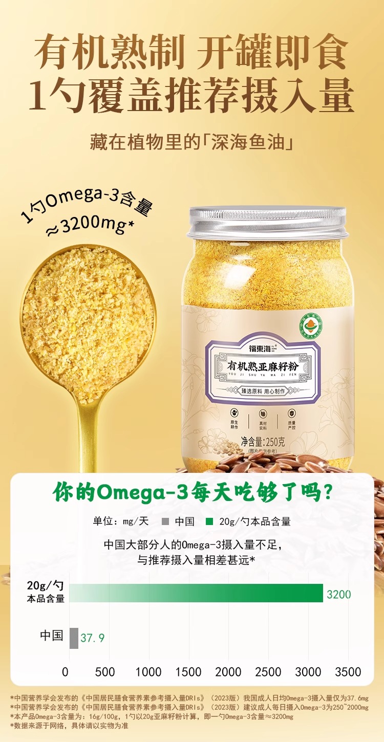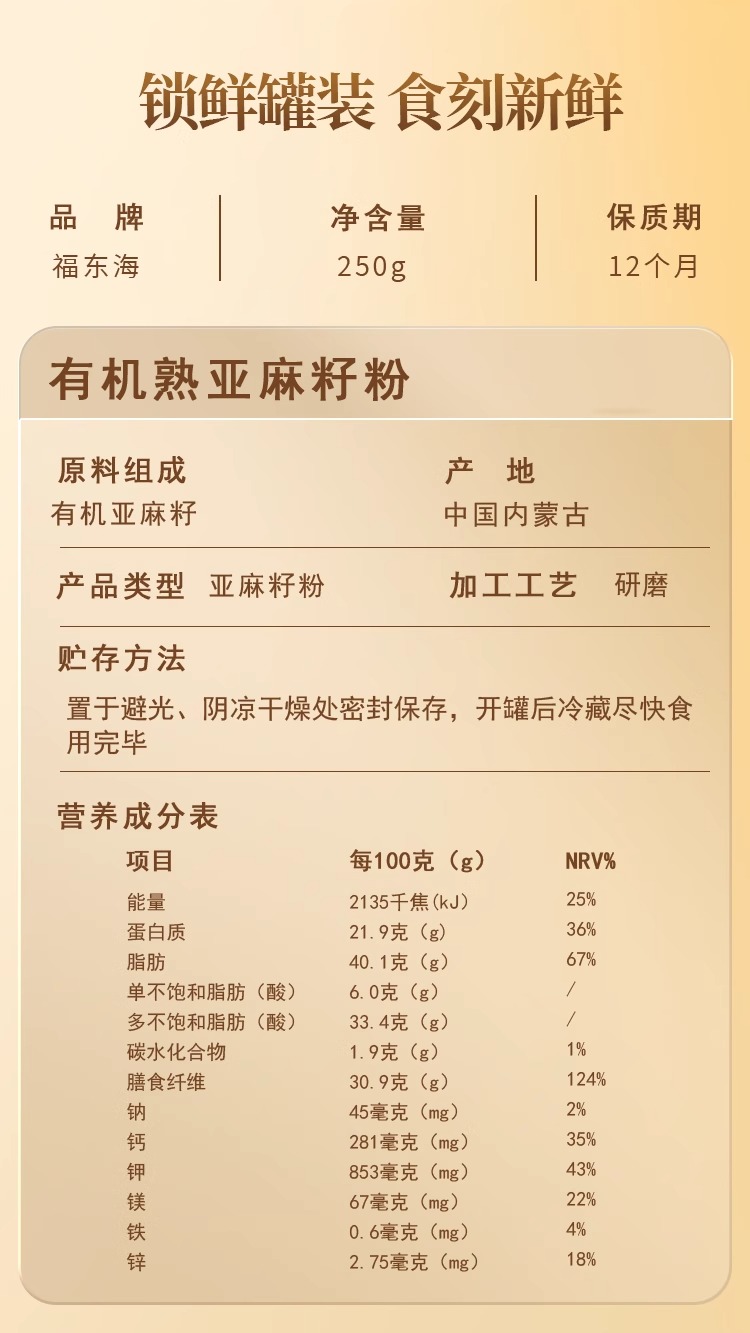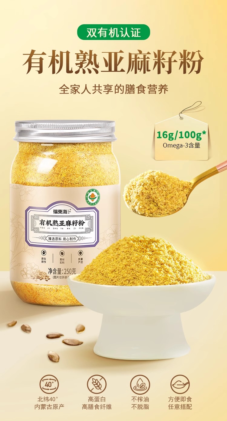 福东海 有机熟亚麻籽粉250克 内蒙古金色亚麻籽双认证 低温烘焙即食高纤