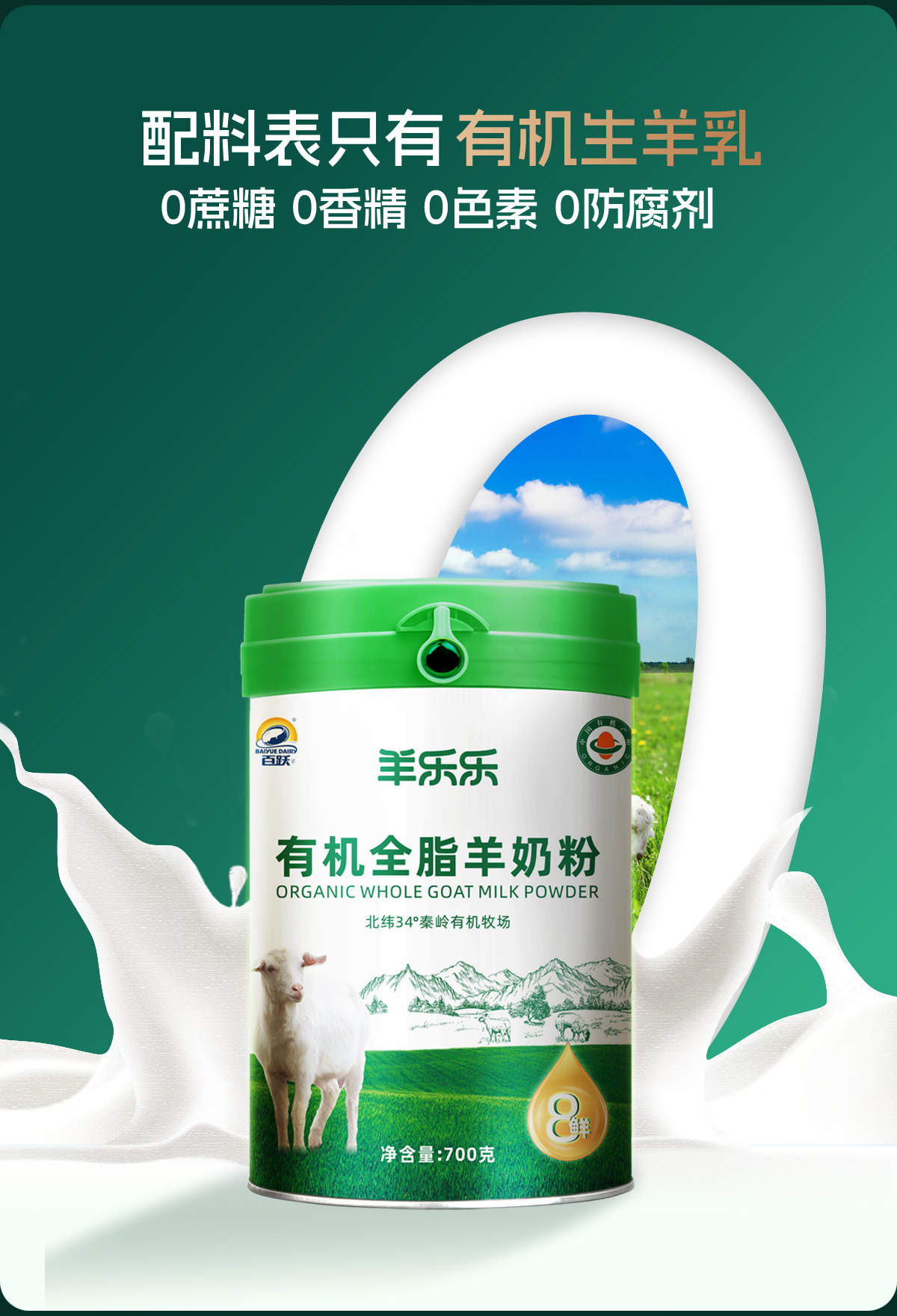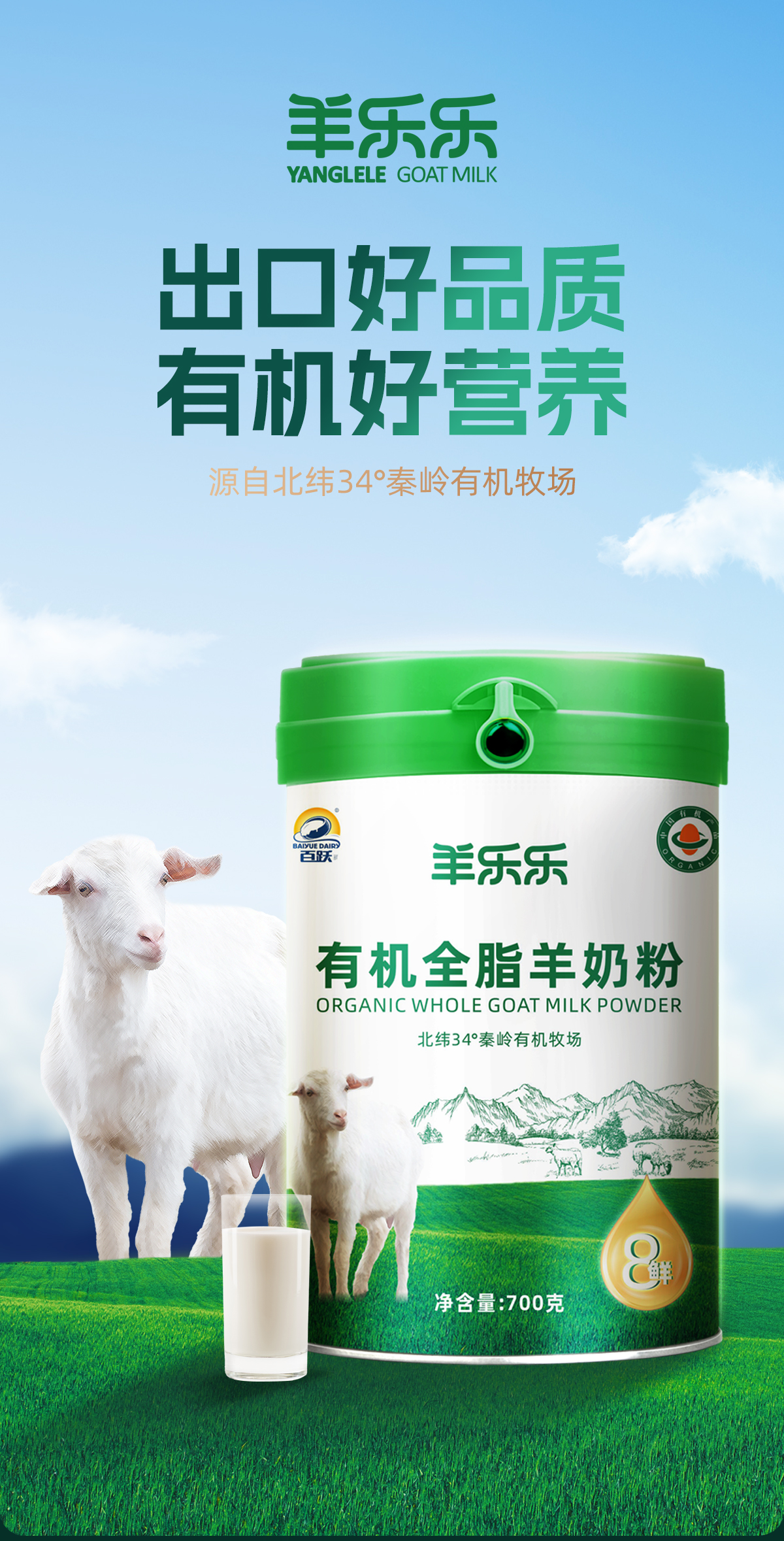 百跃羊乐乐有机全脂纯羊乳粉700克罐装