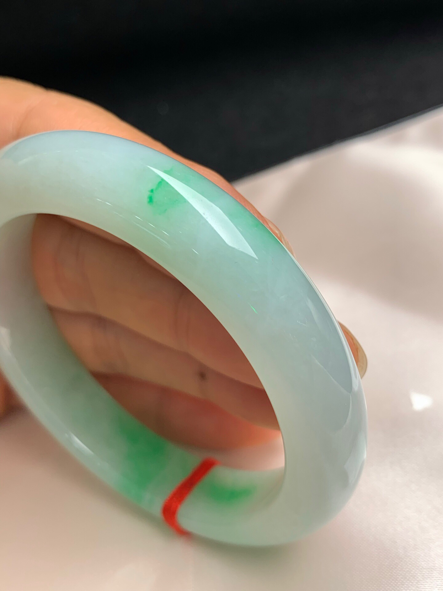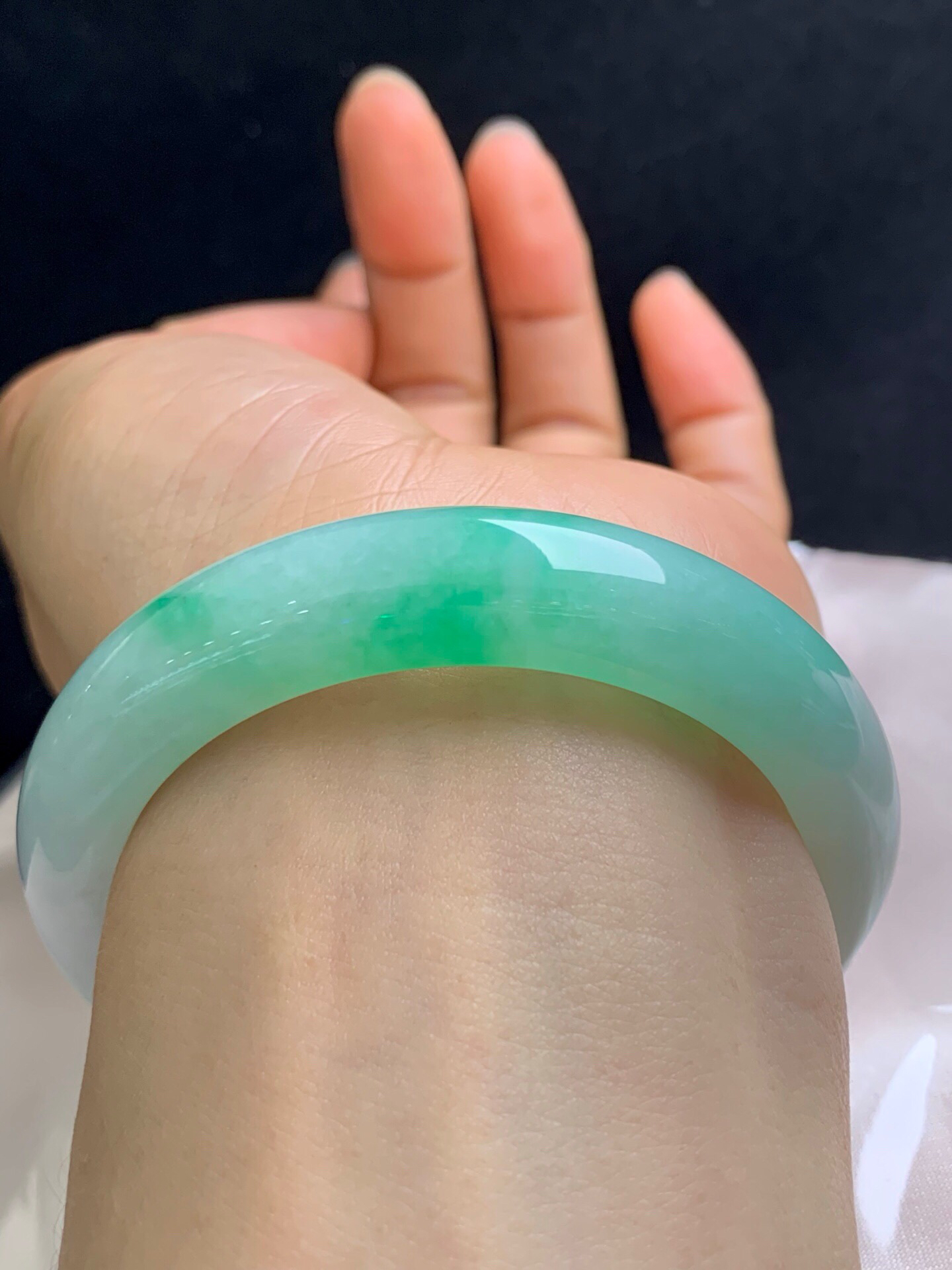 620122,54.5圈口,糯化飘绿正圈平安镯,种水好,底子细润,晴底色飘阳绿花,有处晶体纹,不抠,尺寸:54.5-12-8.7,超值价💰47300 #优石客珠宝#香玉荟萃