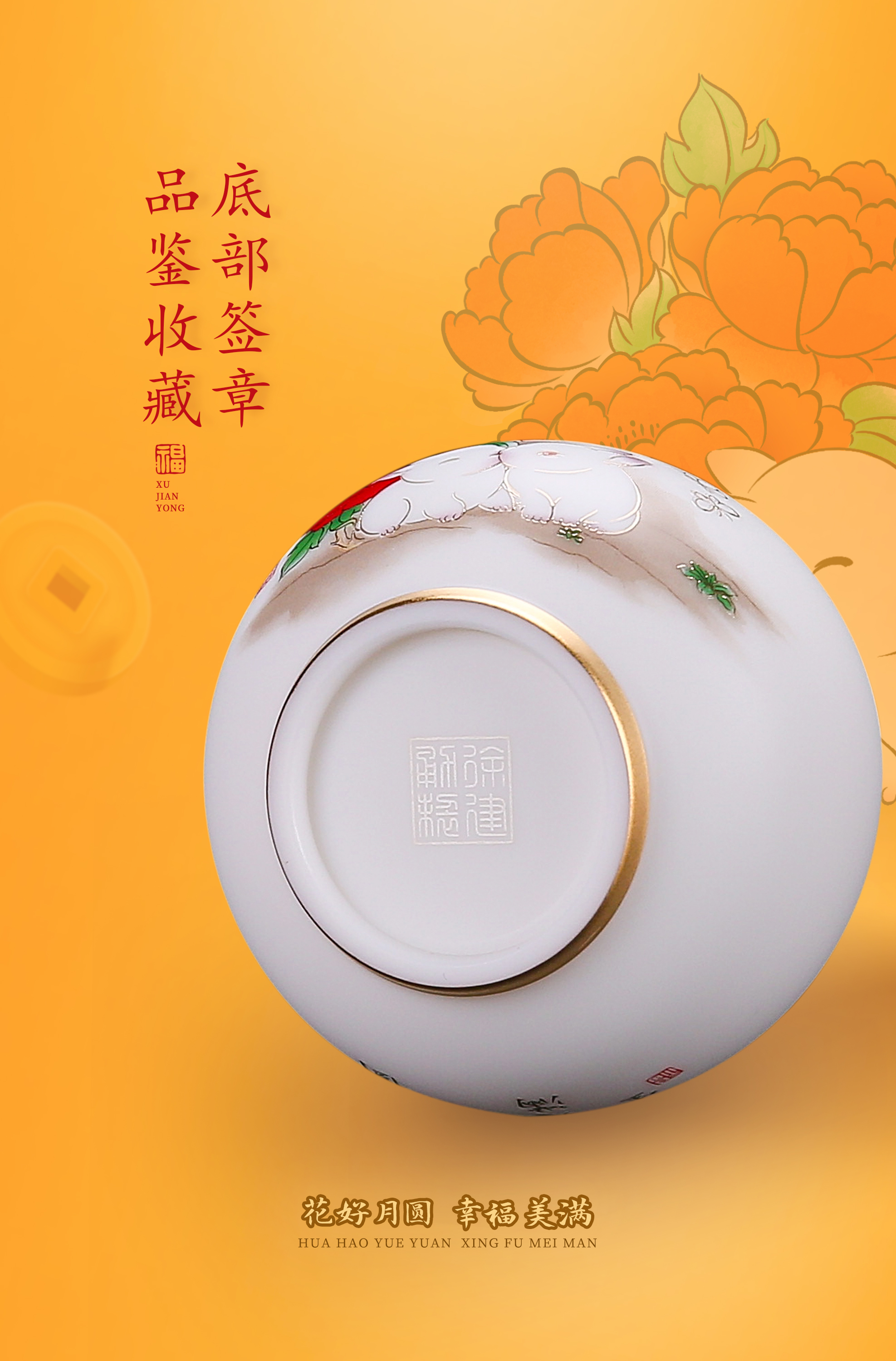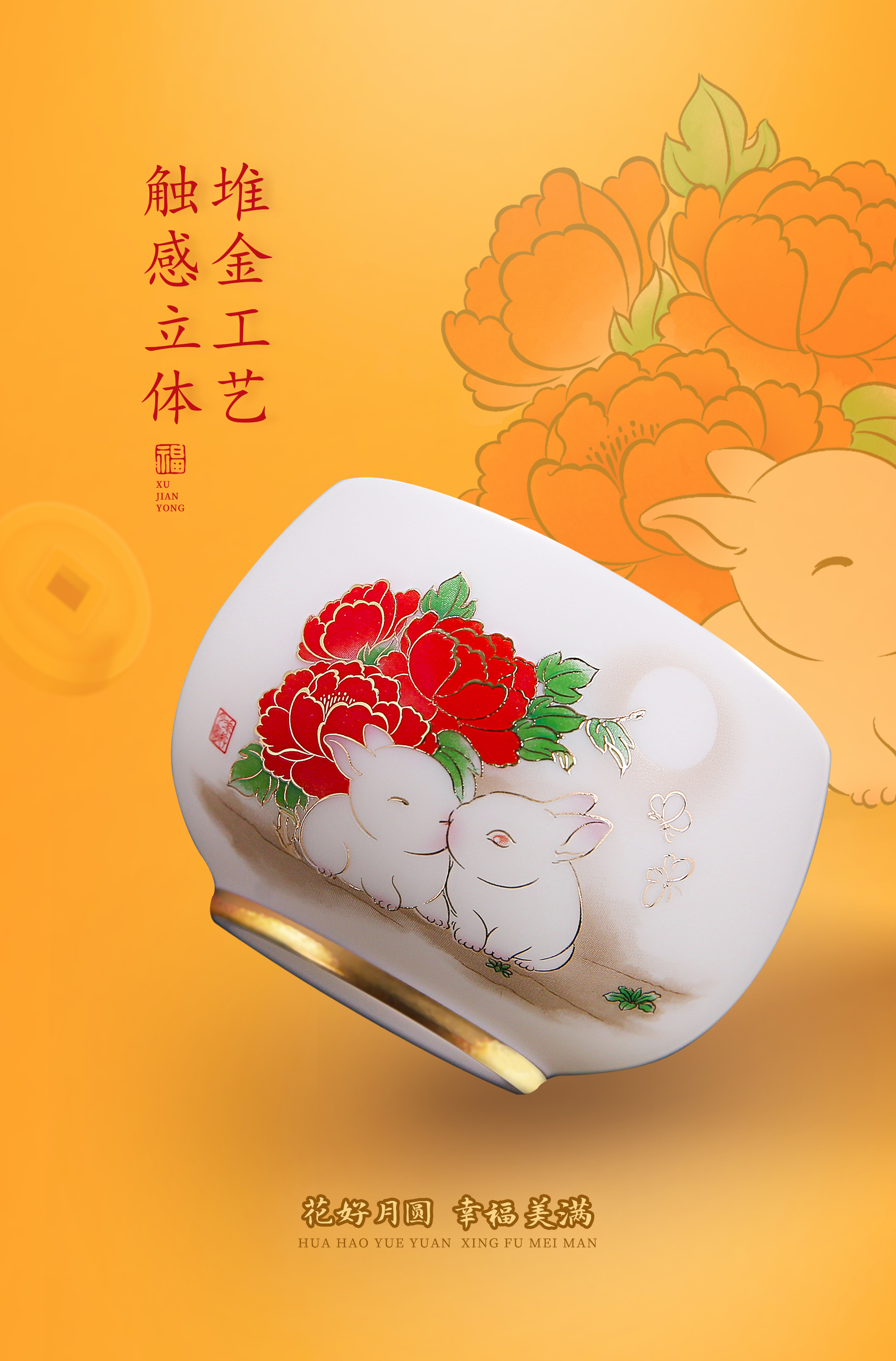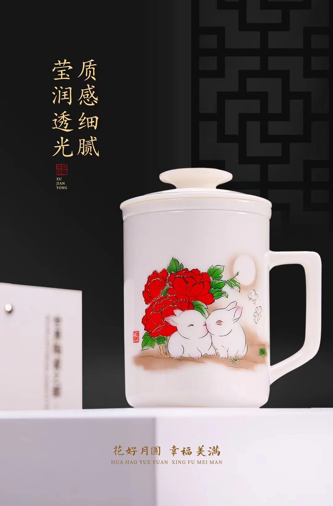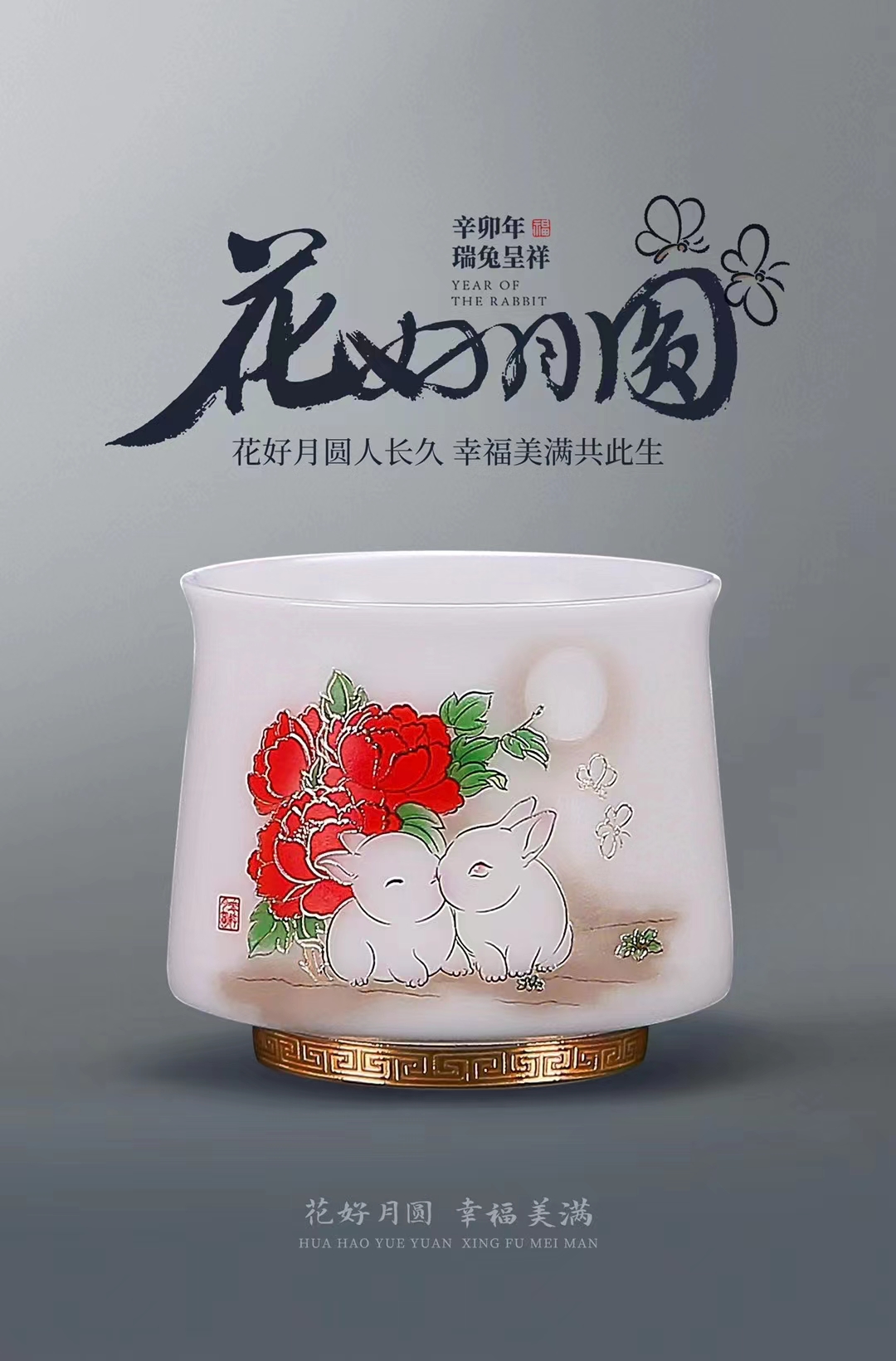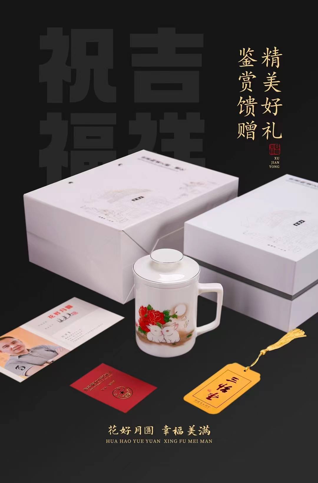 【花好月圆人长久 幸福美满共此生】花好月圆禅定杯、铃铛杯、水杯三件套,徐建勇老师签章,瓷质温润如玉 迎光透亮,浮雕堆金工艺 触感立体,珍藏品鉴 送礼臻品