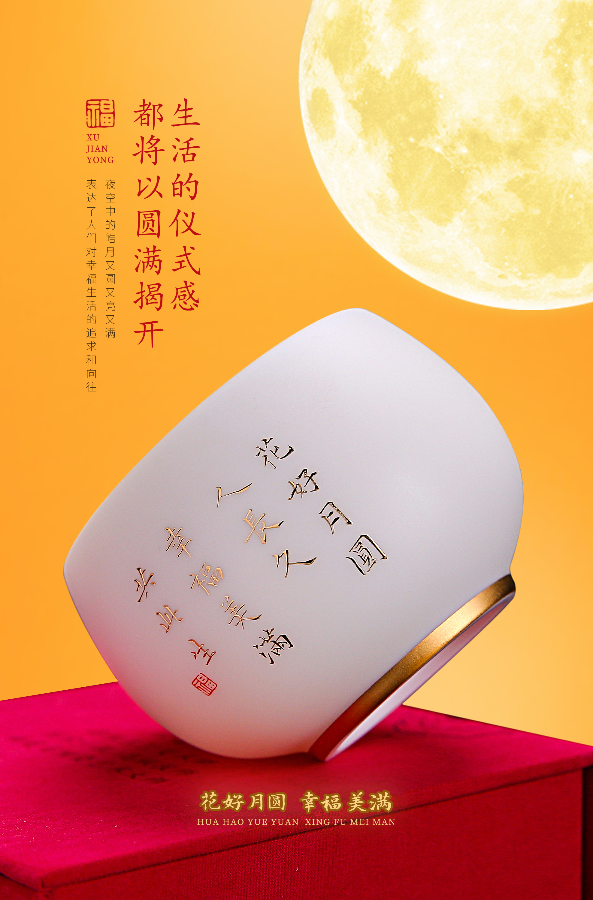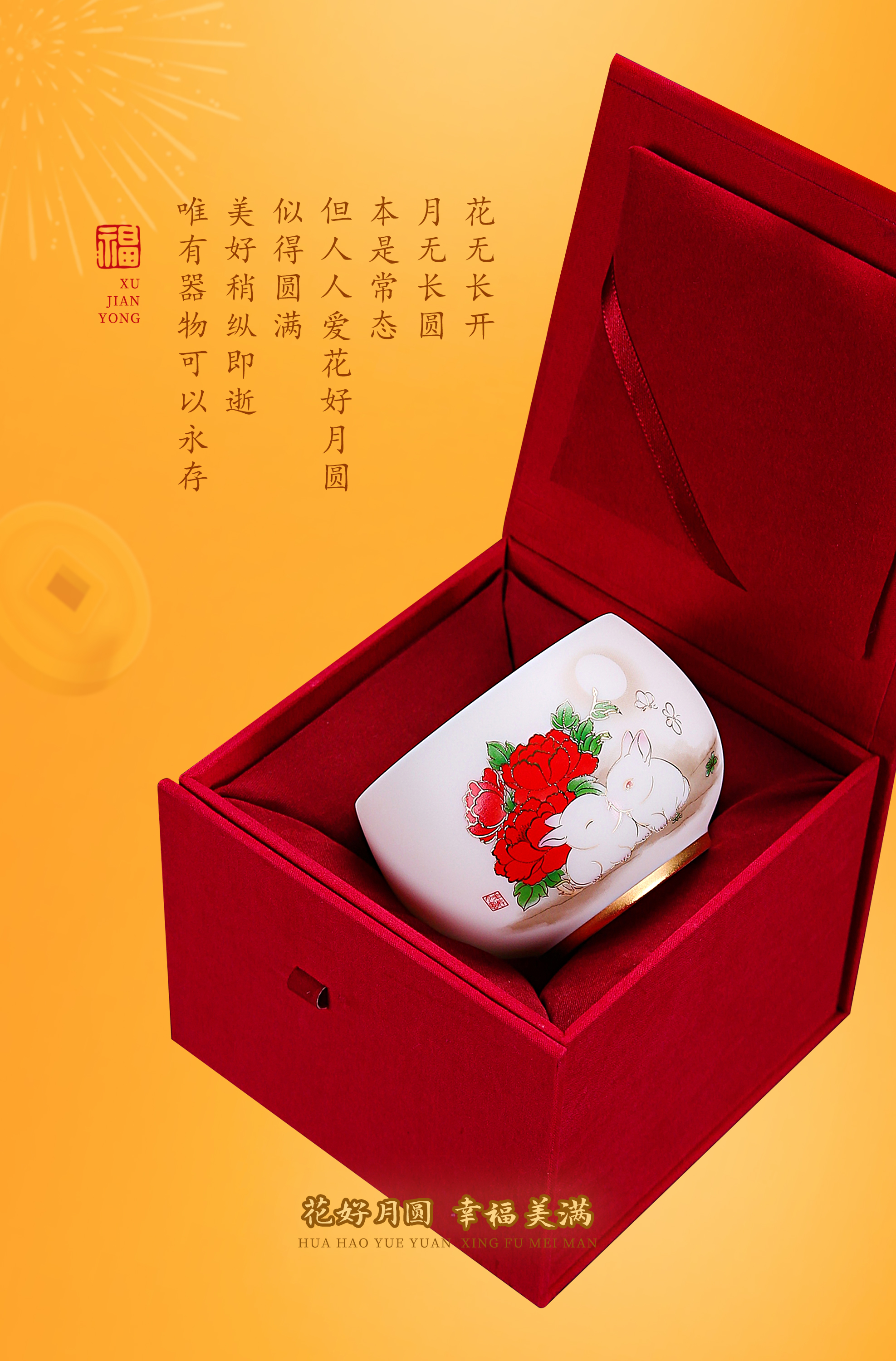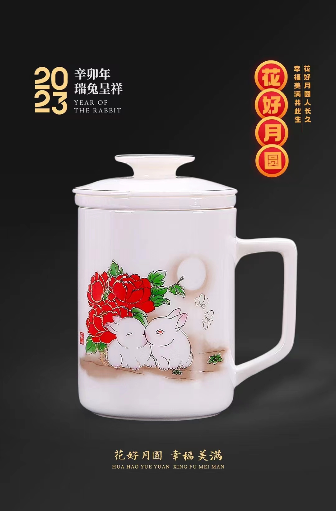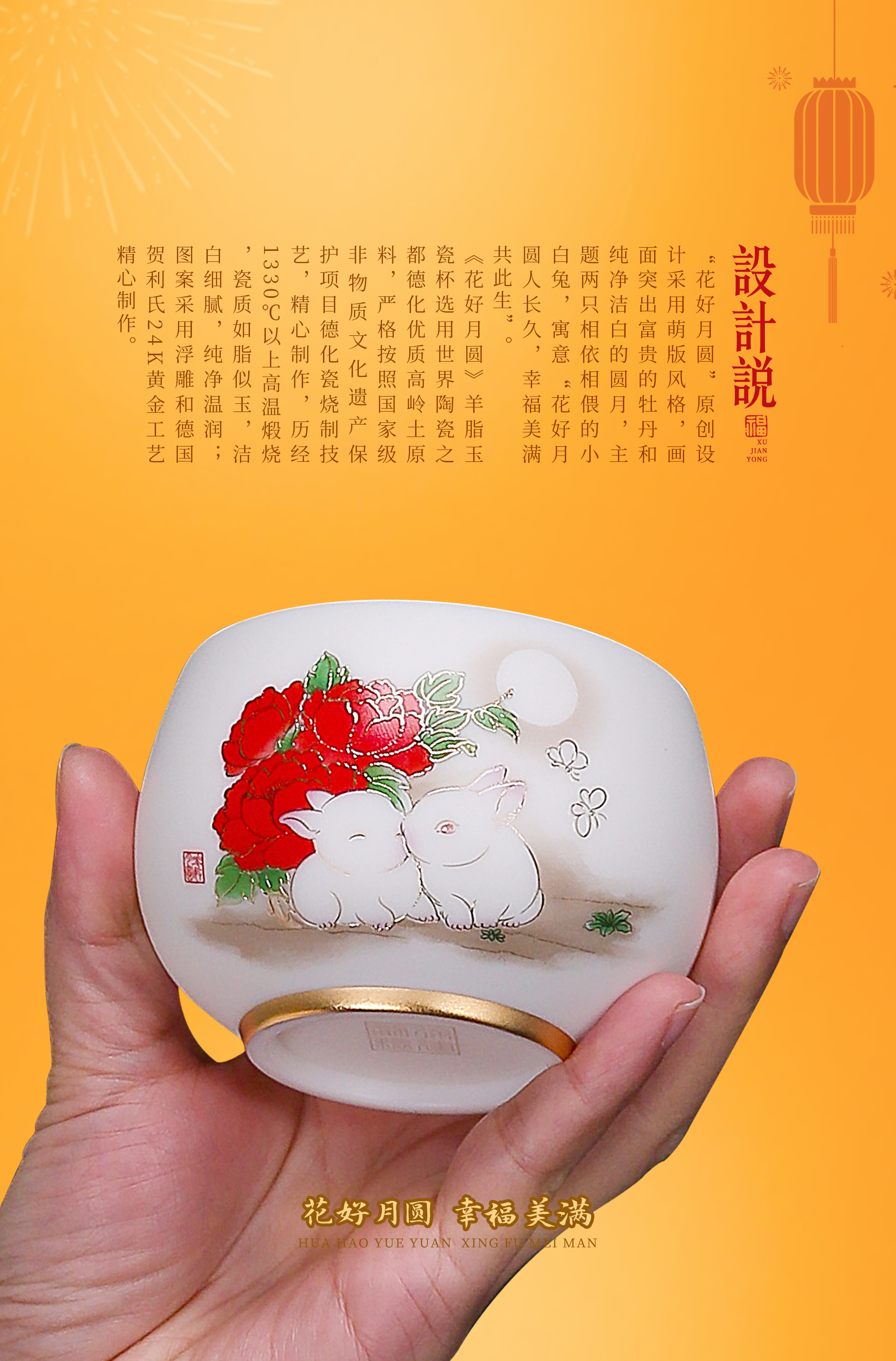 【花好月圆人长久 幸福美满共此生】花好月圆禅定杯、铃铛杯、水杯三件套,徐建勇老师签章,瓷质温润如玉 迎光透亮,浮雕堆金工艺 触感立体,珍藏品鉴 送礼臻品
