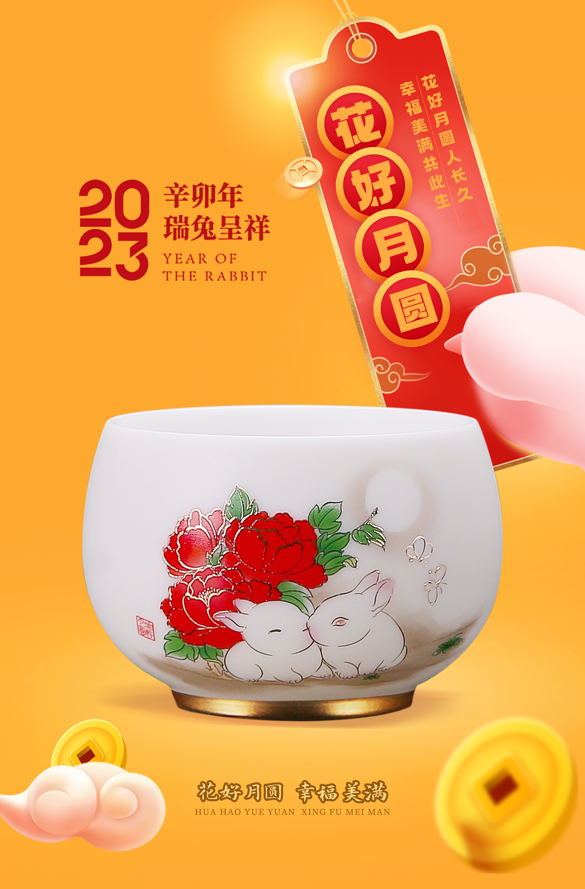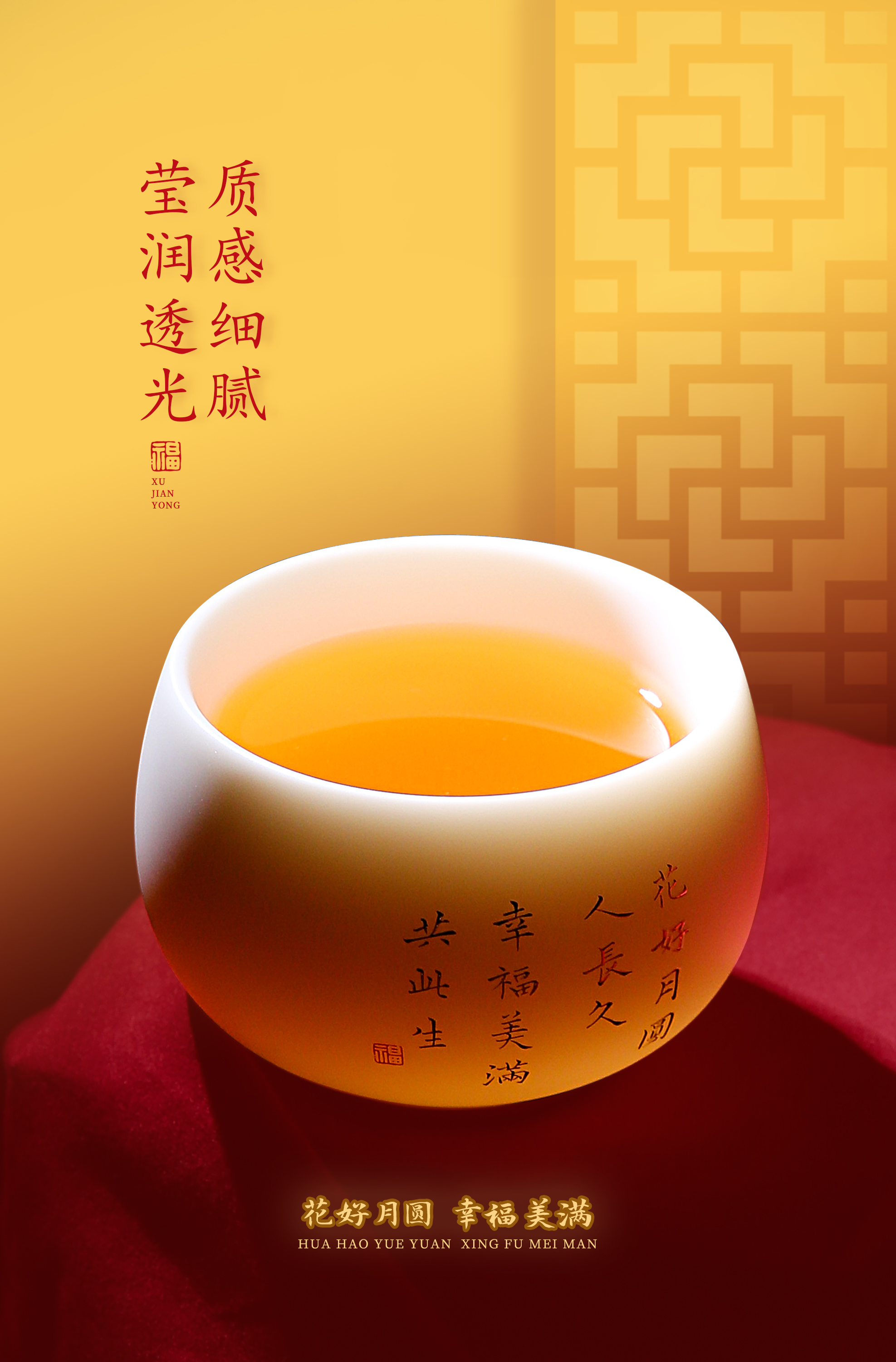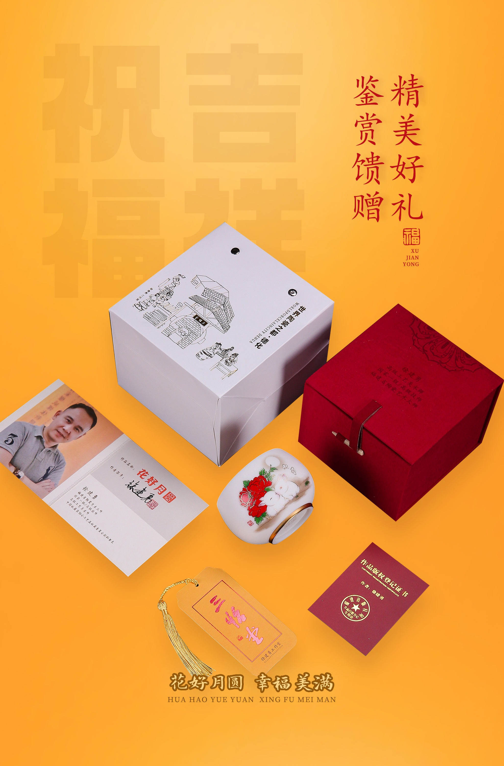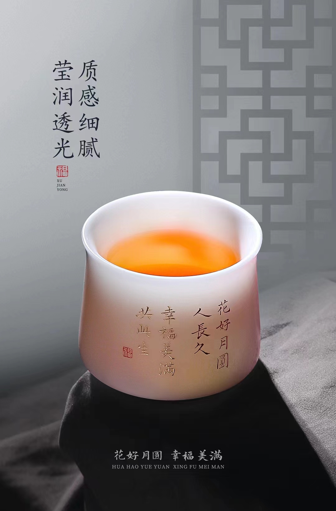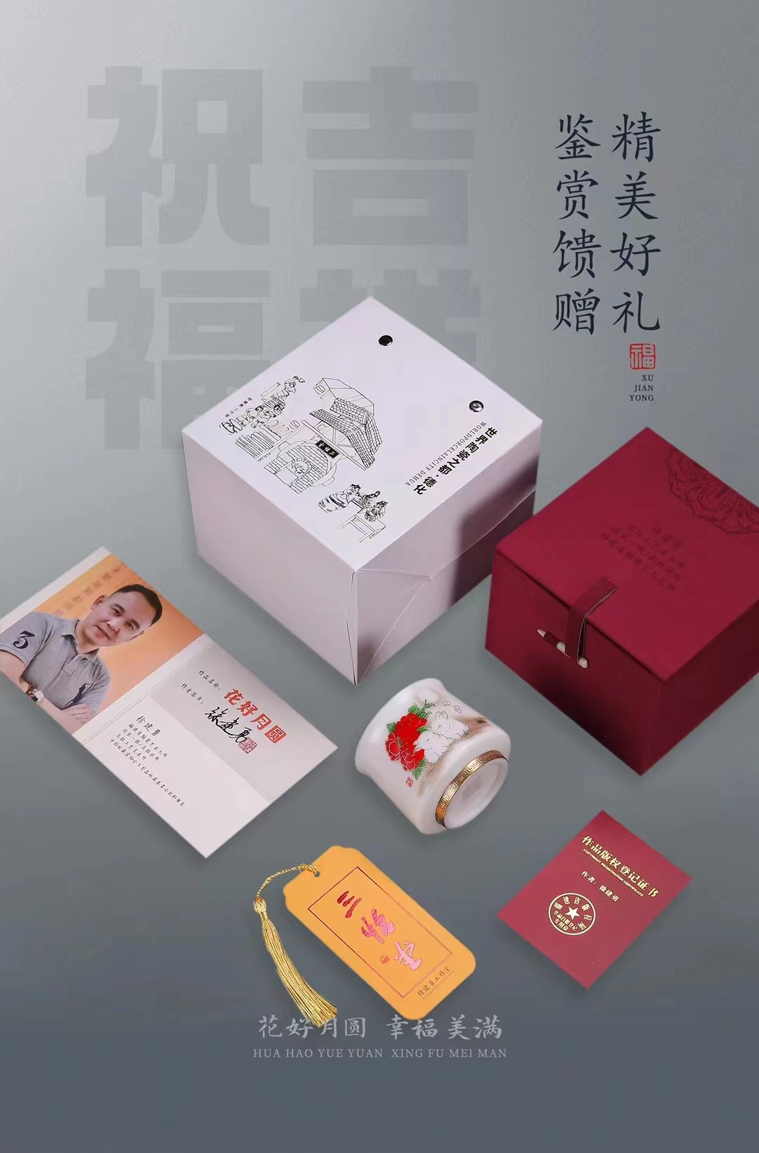 【花好月圆人长久 幸福美满共此生】花好月圆禅定杯、铃铛杯、水杯三件套,徐建勇老师签章,瓷质温润如玉 迎光透亮,浮雕堆金工艺 触感立体,珍藏品鉴 送礼臻品