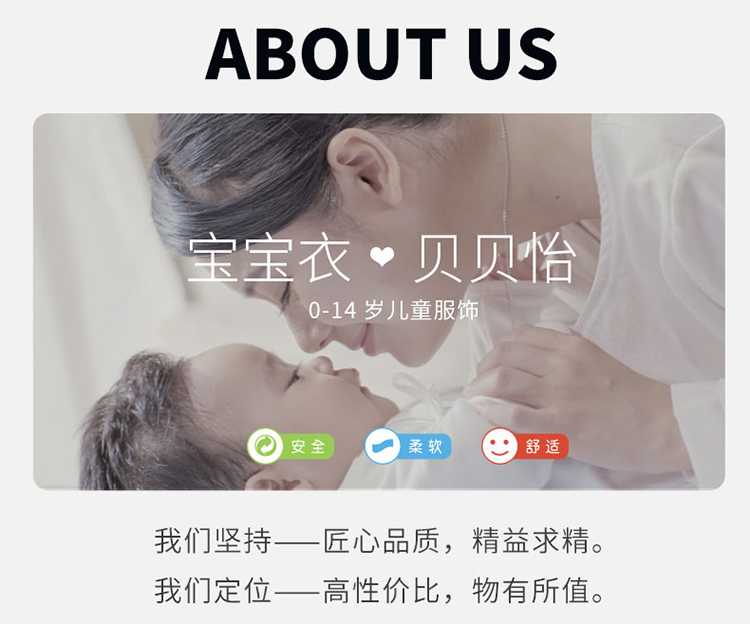 - 贝贝怡专注0-6岁婴幼儿服饰,坚持安全、柔软、舒适的产品理念,为千万中国家庭提供超高品质、安全可靠的婴幼儿服饰产品,妈妈放心,宝宝开心!